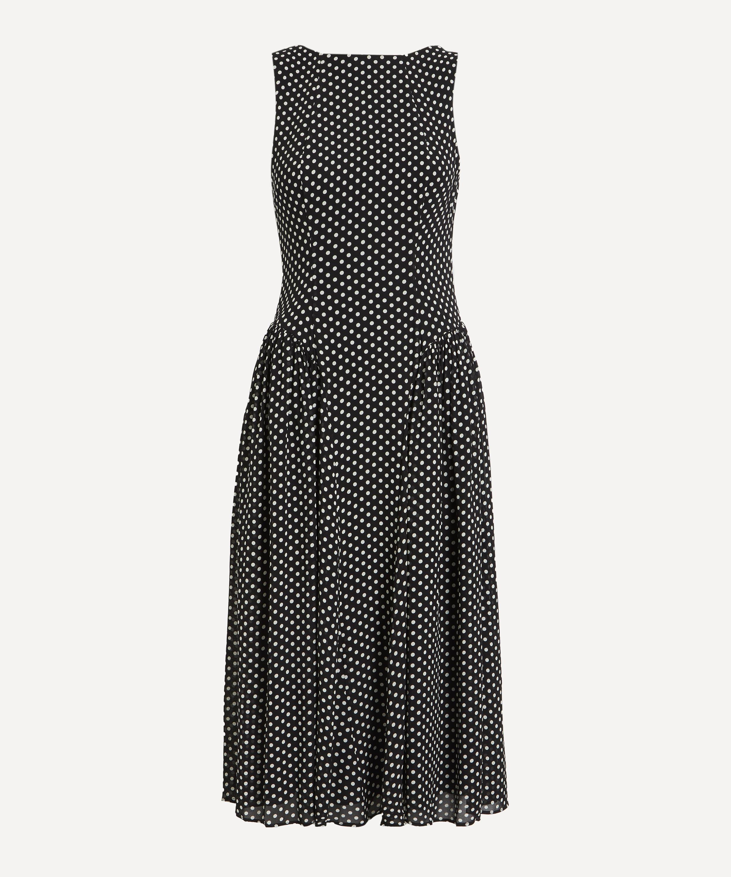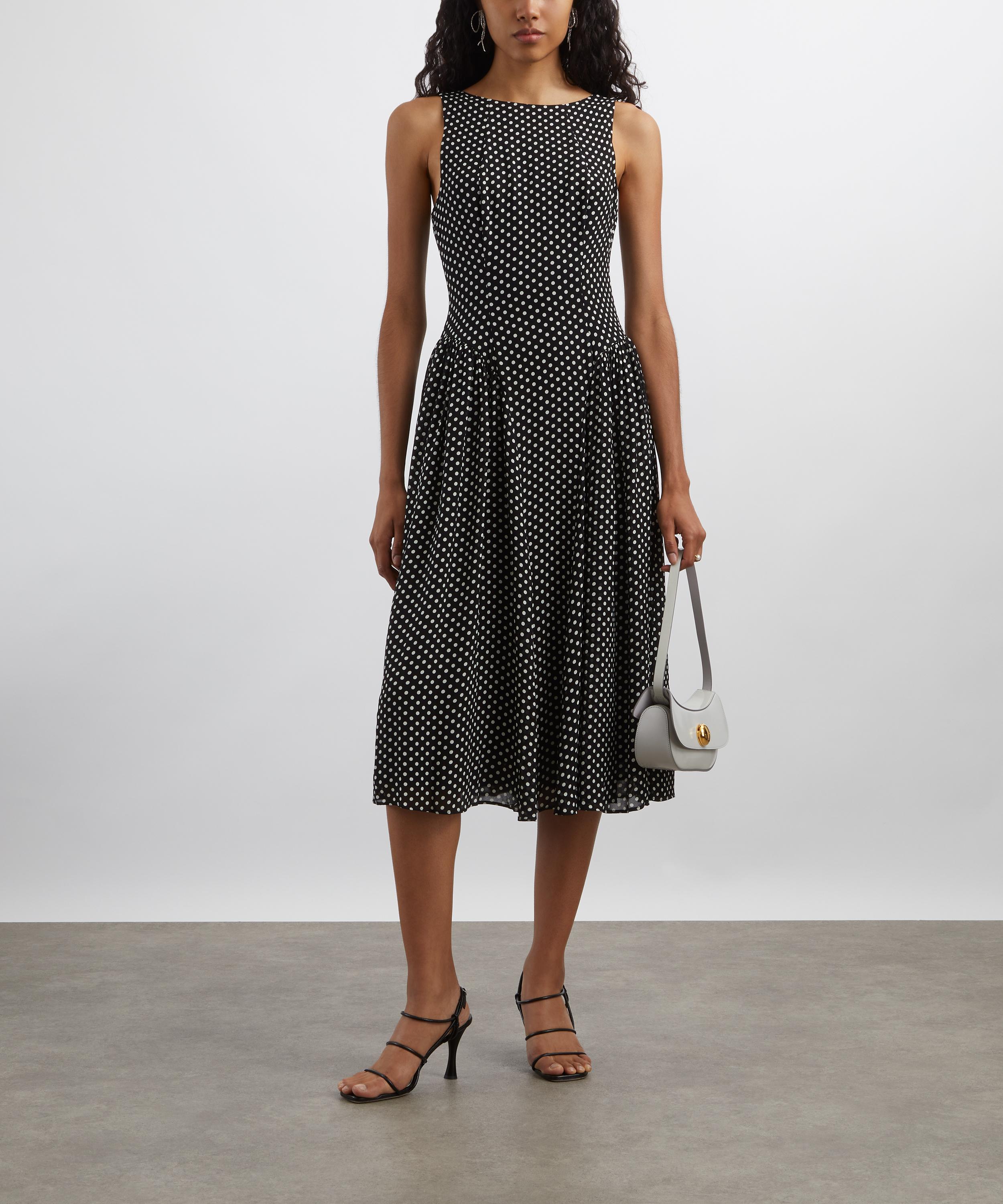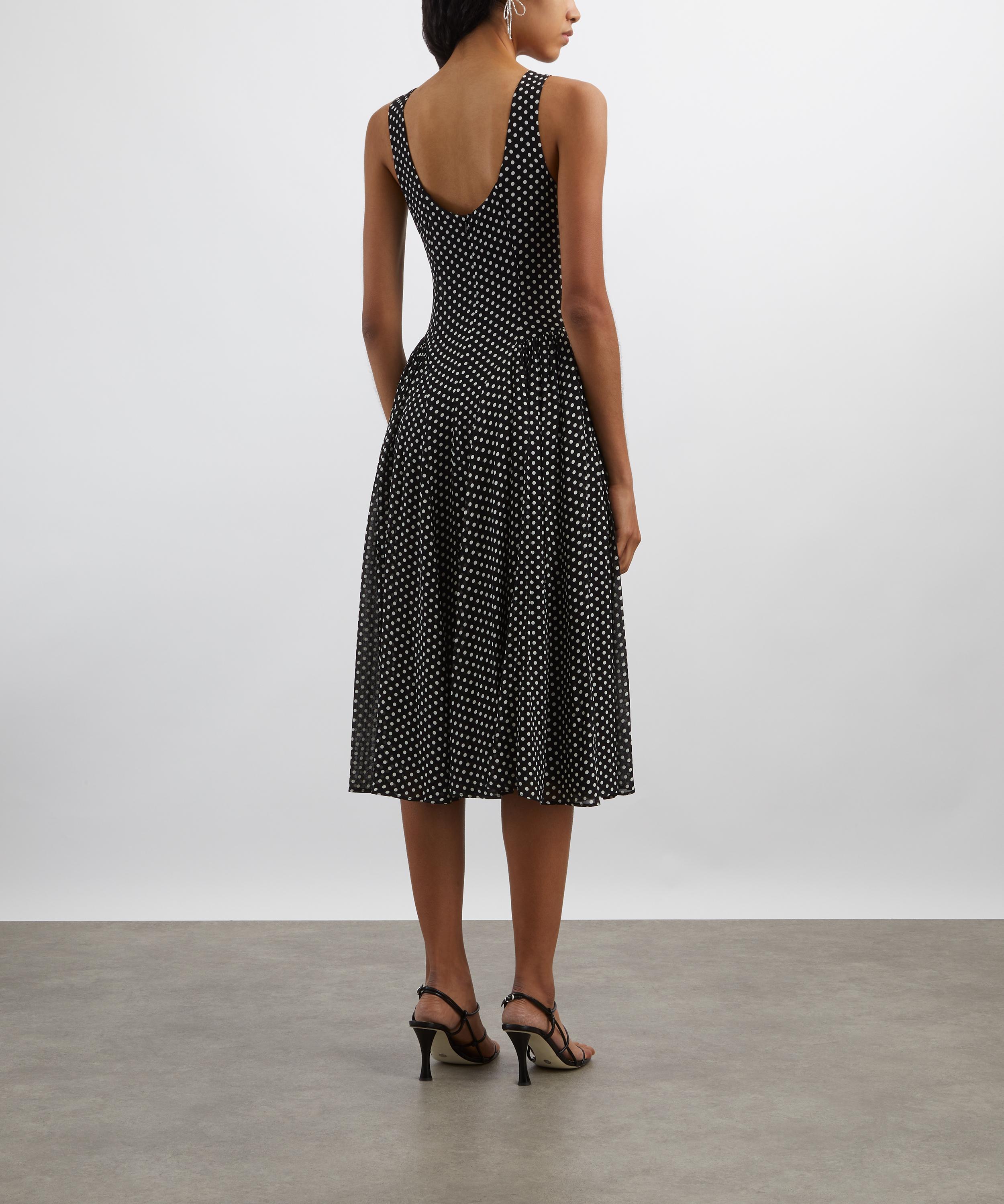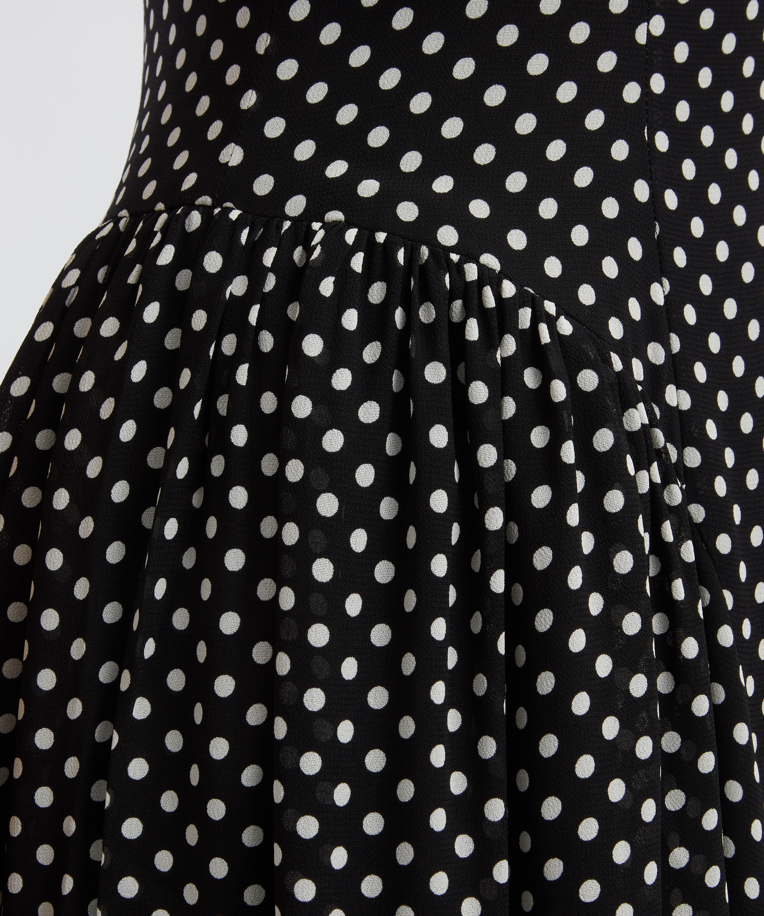 Crafted from lightweight georgette adorned with a black polka-dot pattern, the Anelis Dress exudes effortless elegance. Designed with a fitted bodice and elegant boat neckline, it falls into a flowing A-line skirt for a graceful, feminine silhouette.