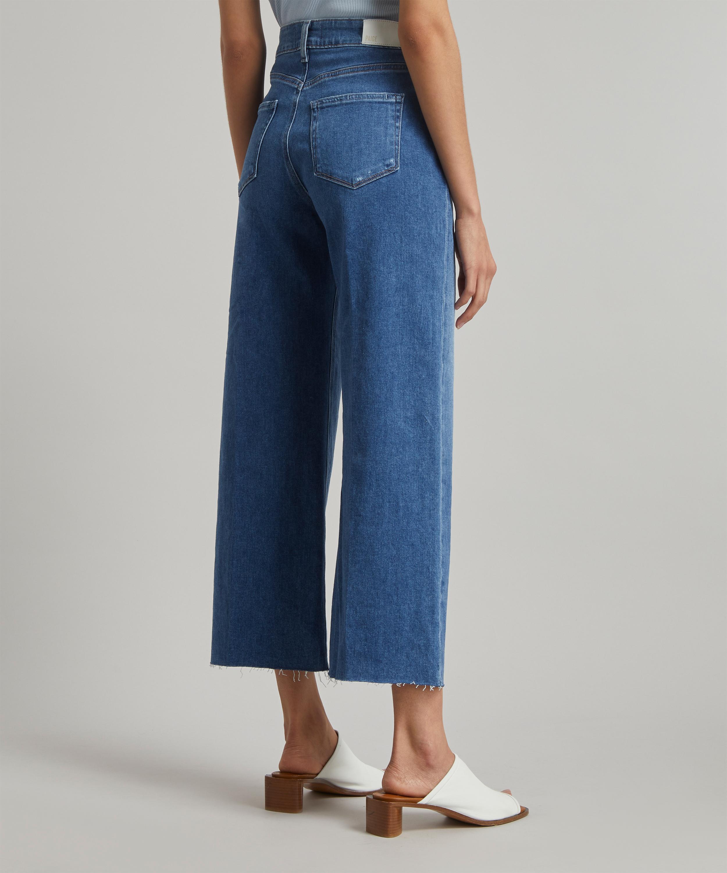Cut from PAIGE’s signature Transcend stretch denim, these high-rise jeans have a flared silhouette with its cropped, wide-leg, finished with subtly distressed hems. A flattering fit, it has a centre-crease, complete with five pocket styling, zip fly and embroidered logo tag at the rear.