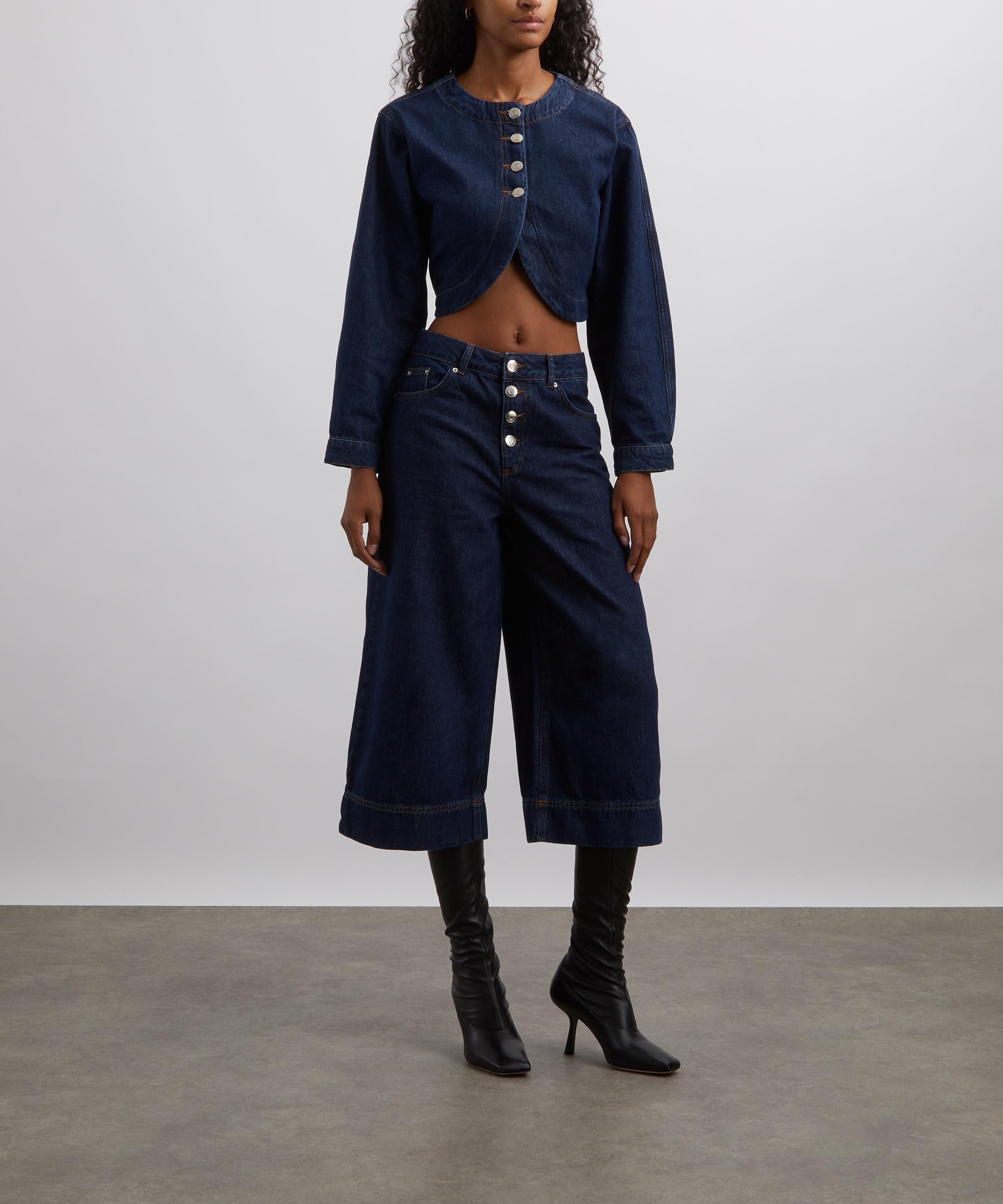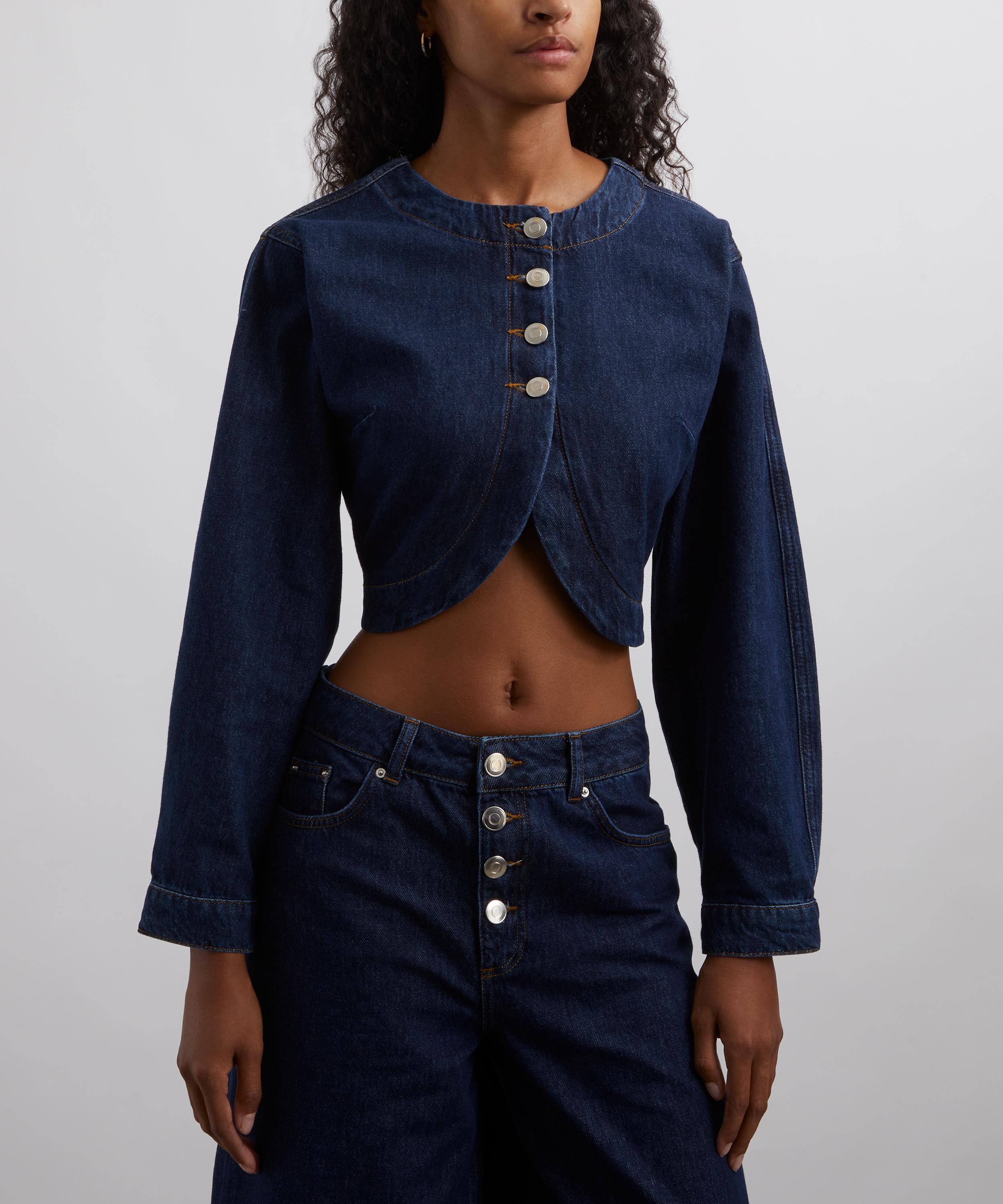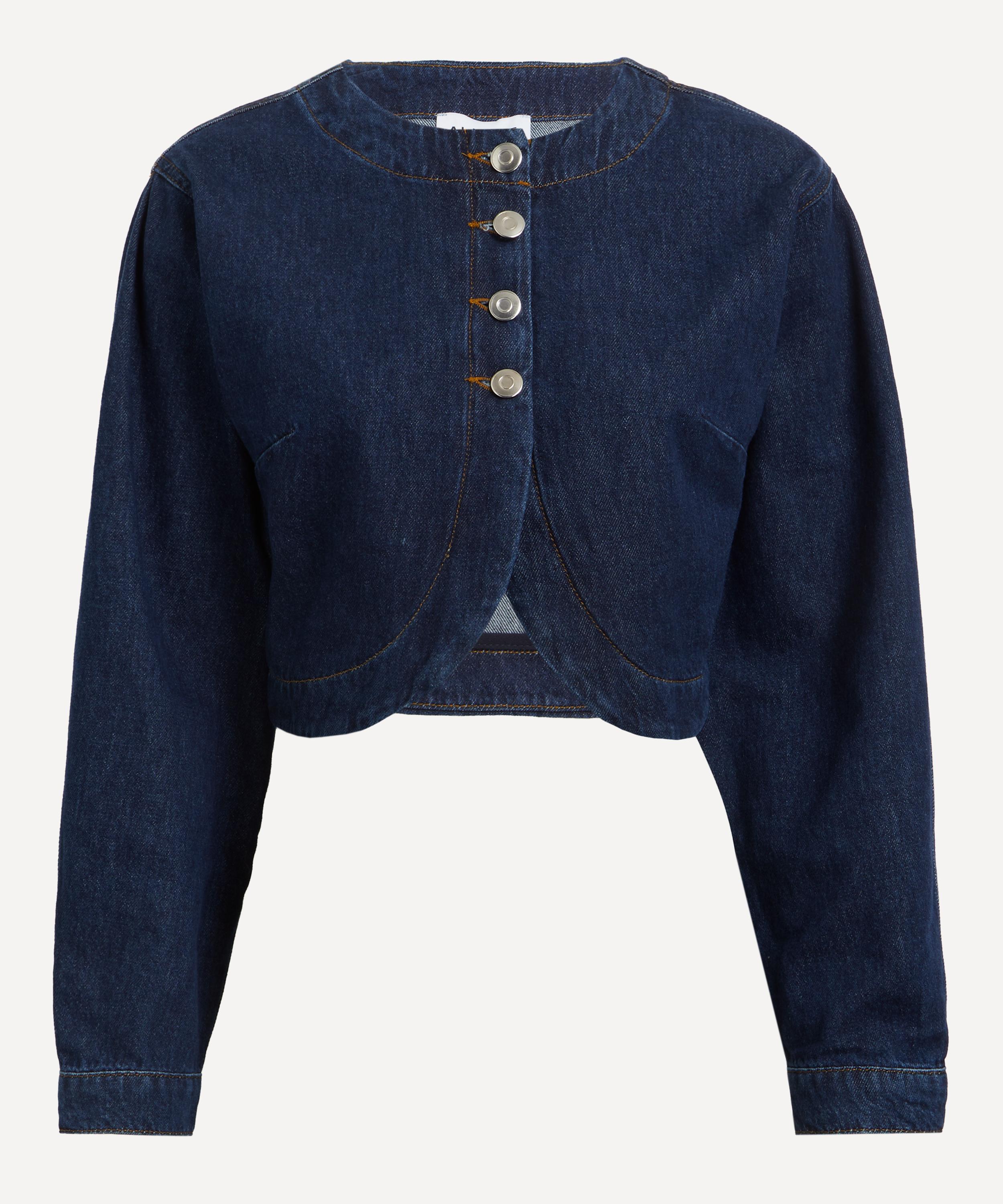 With its curved, cropped hem, exposed placket, and rounded sleeves, this bolero is the ideal piece to elevate your denim edit.