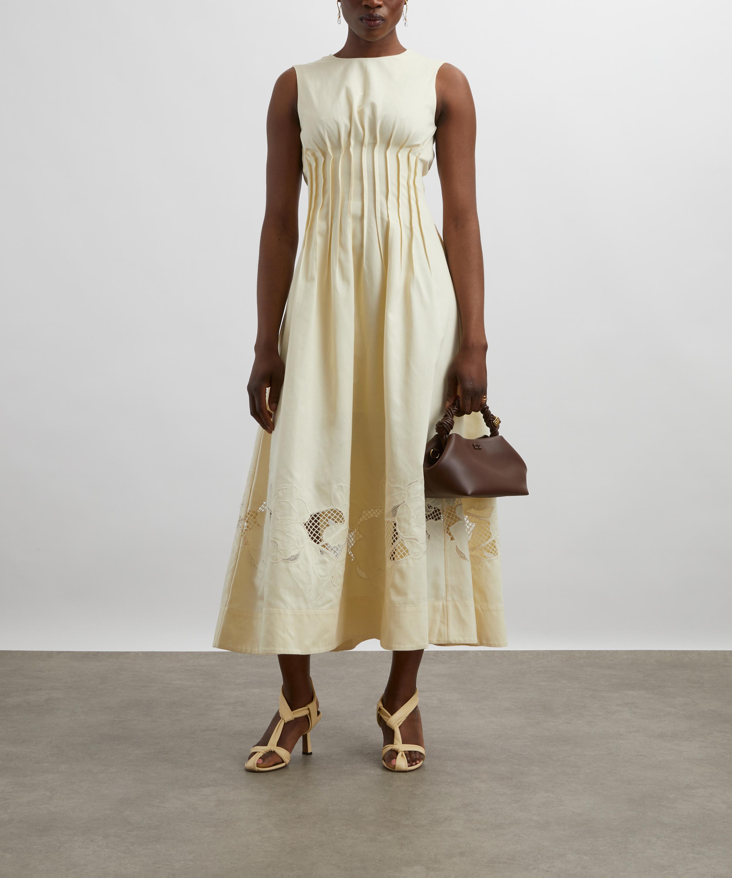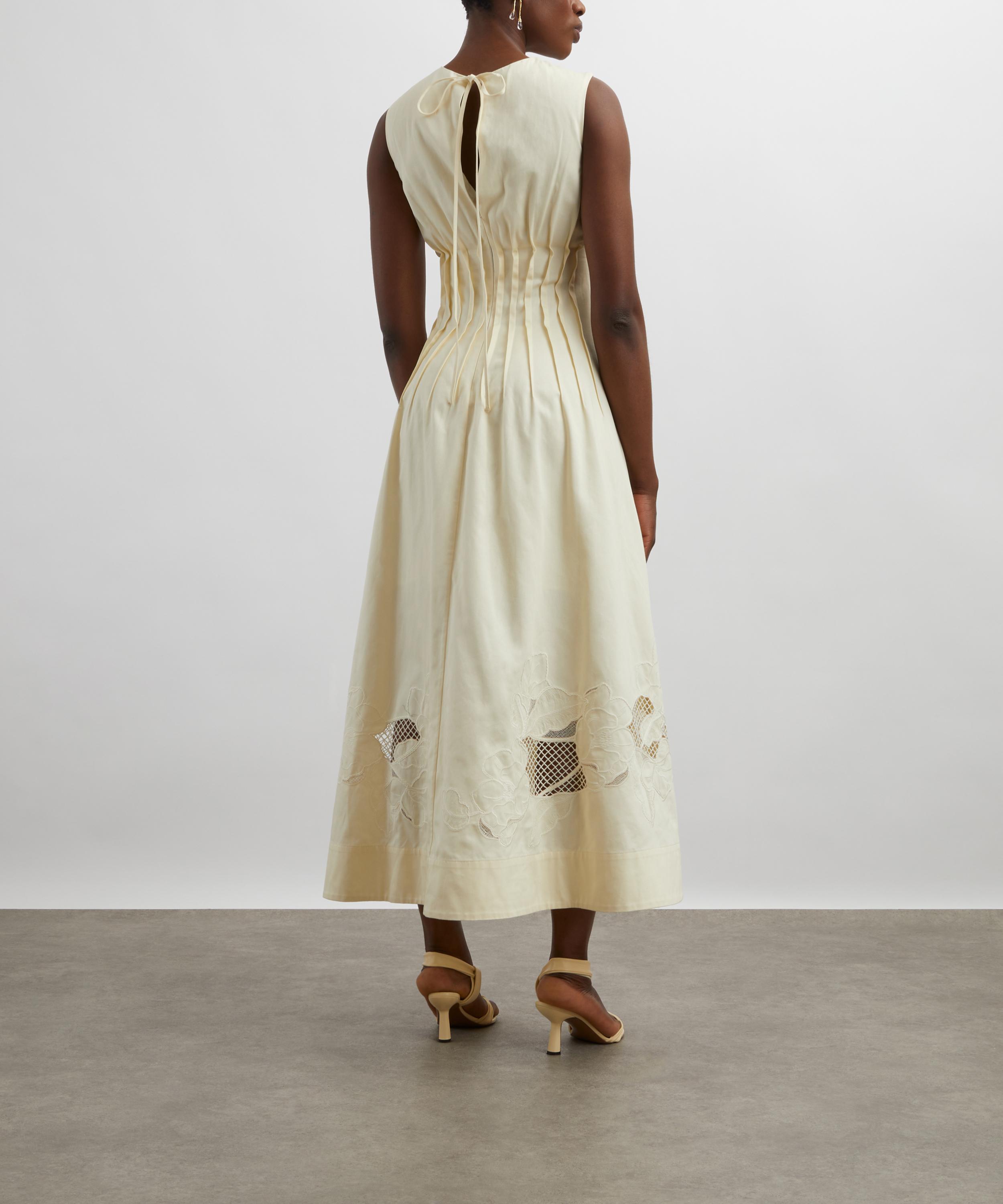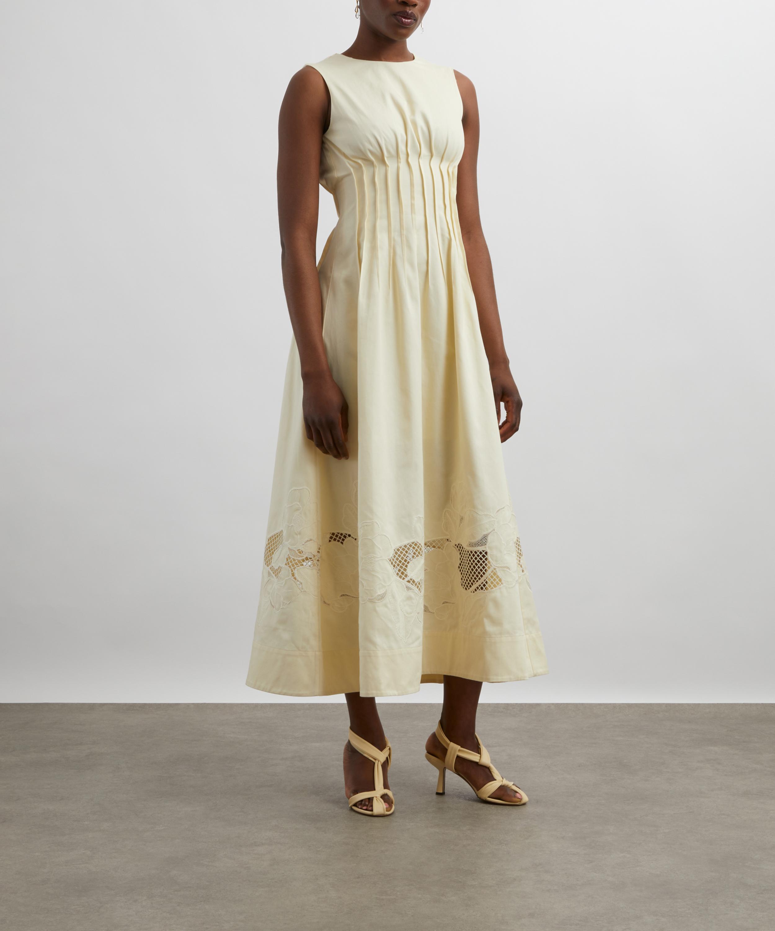 Exuding effortless glamour and sophistication, this charming dress features intricate pintuck detailing contouring through the waistline before falling into a full skirt in a summery butter hue. Entirely crafted from a crisp cotton, bespoke embroidery featuring floral motifs, lattice lace detailing and intricate cut work to the hem adds a touch of modern allure to this timeless piece.