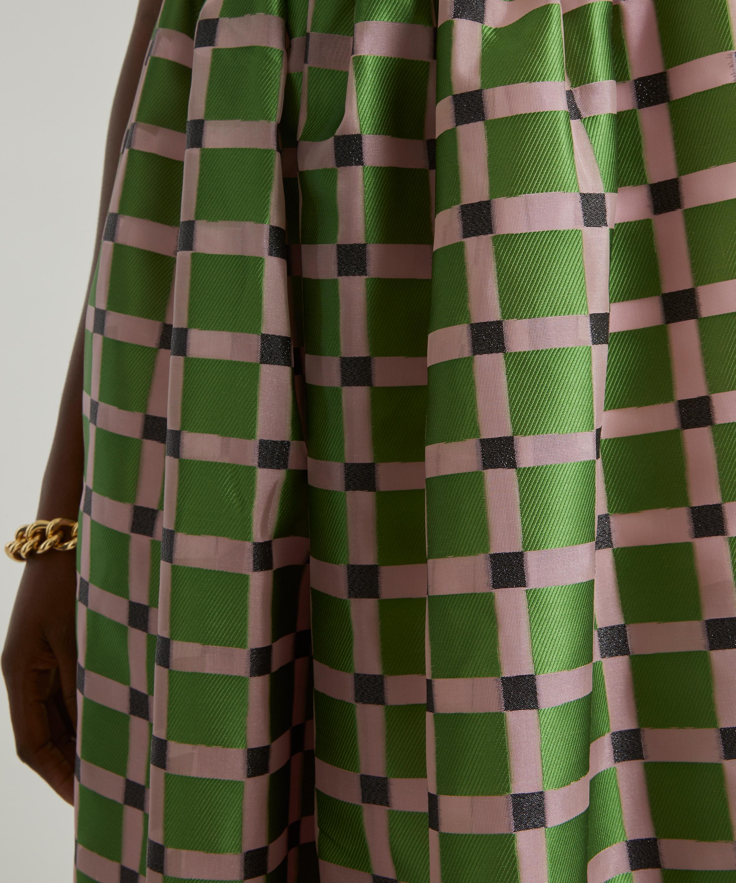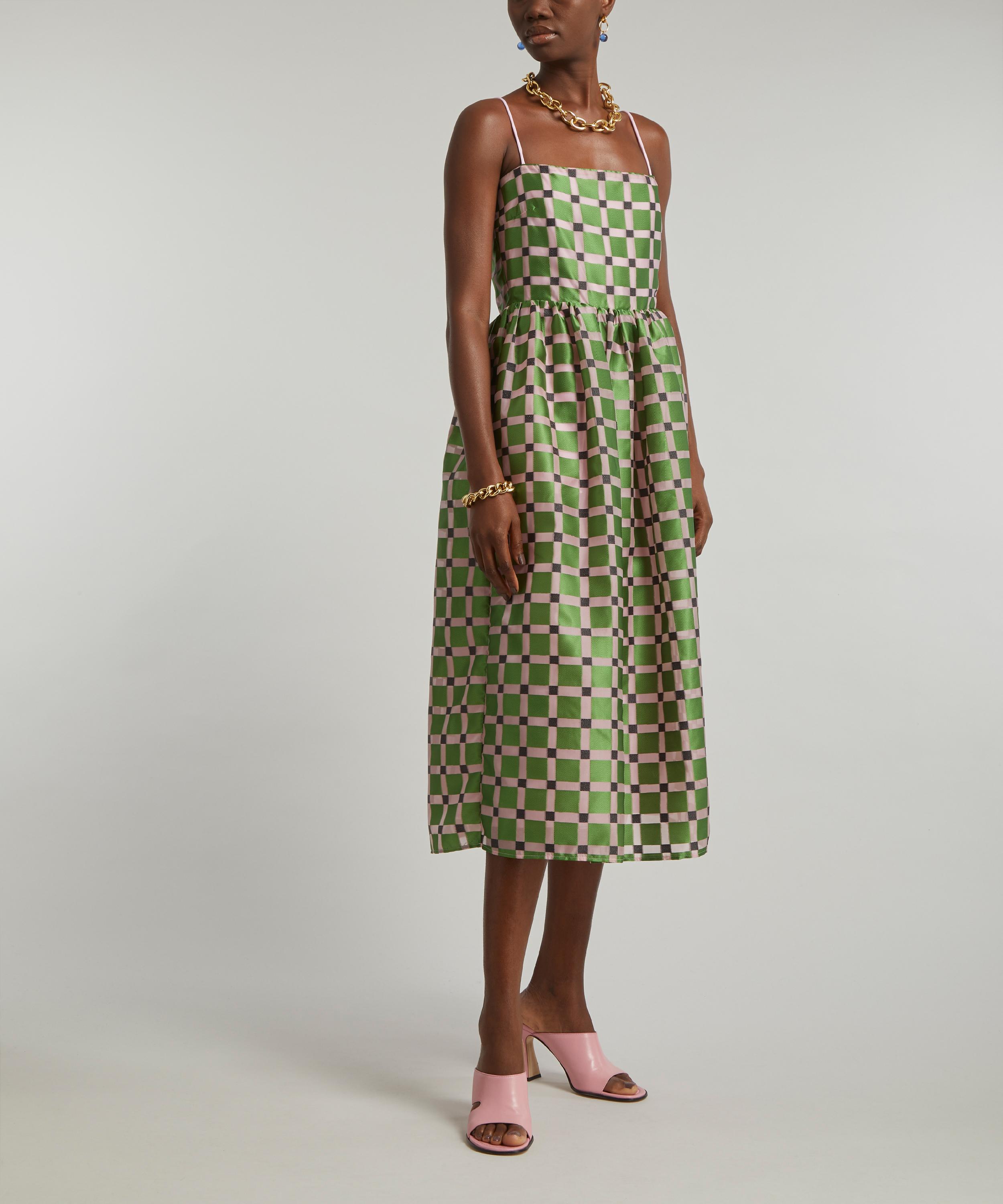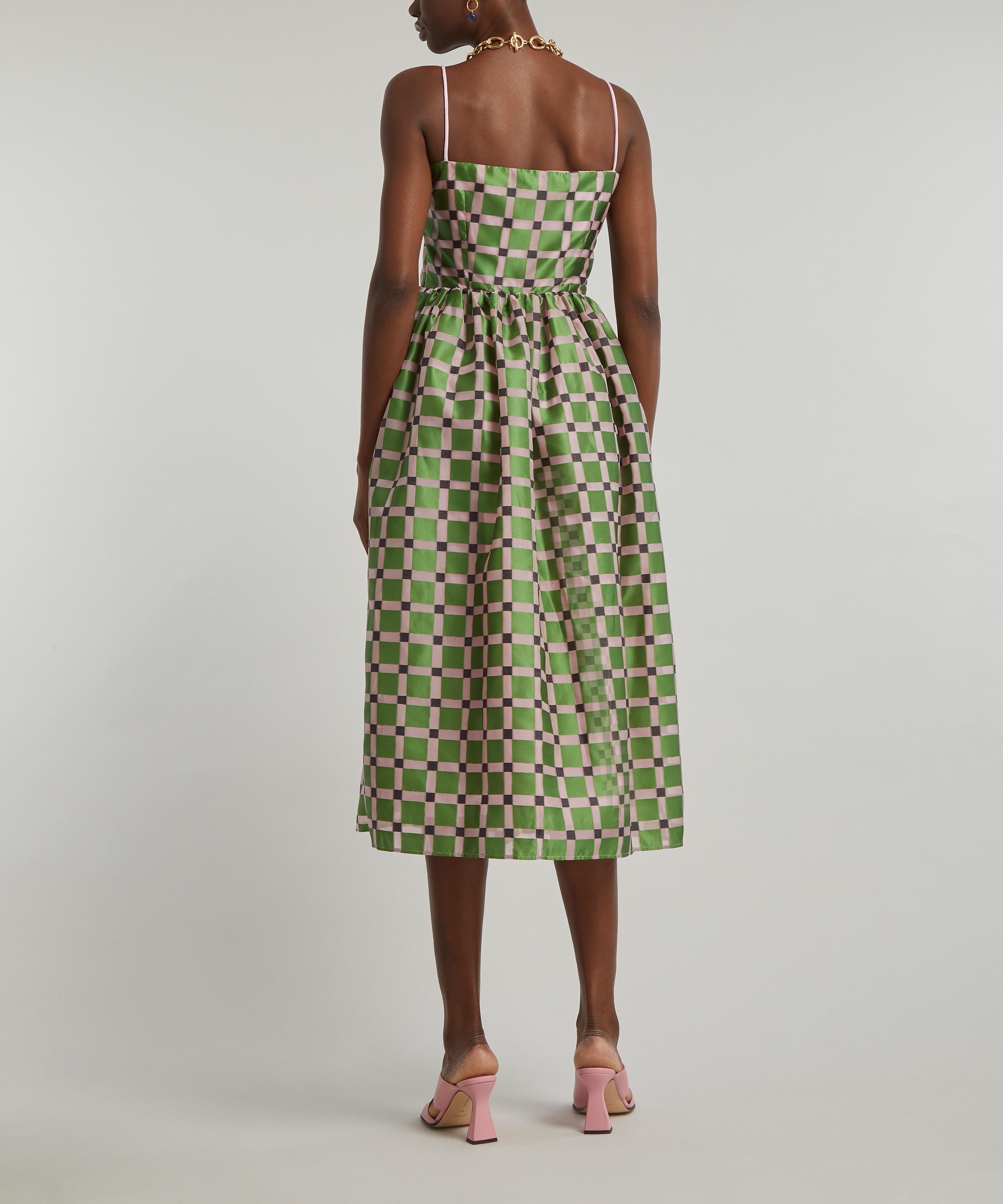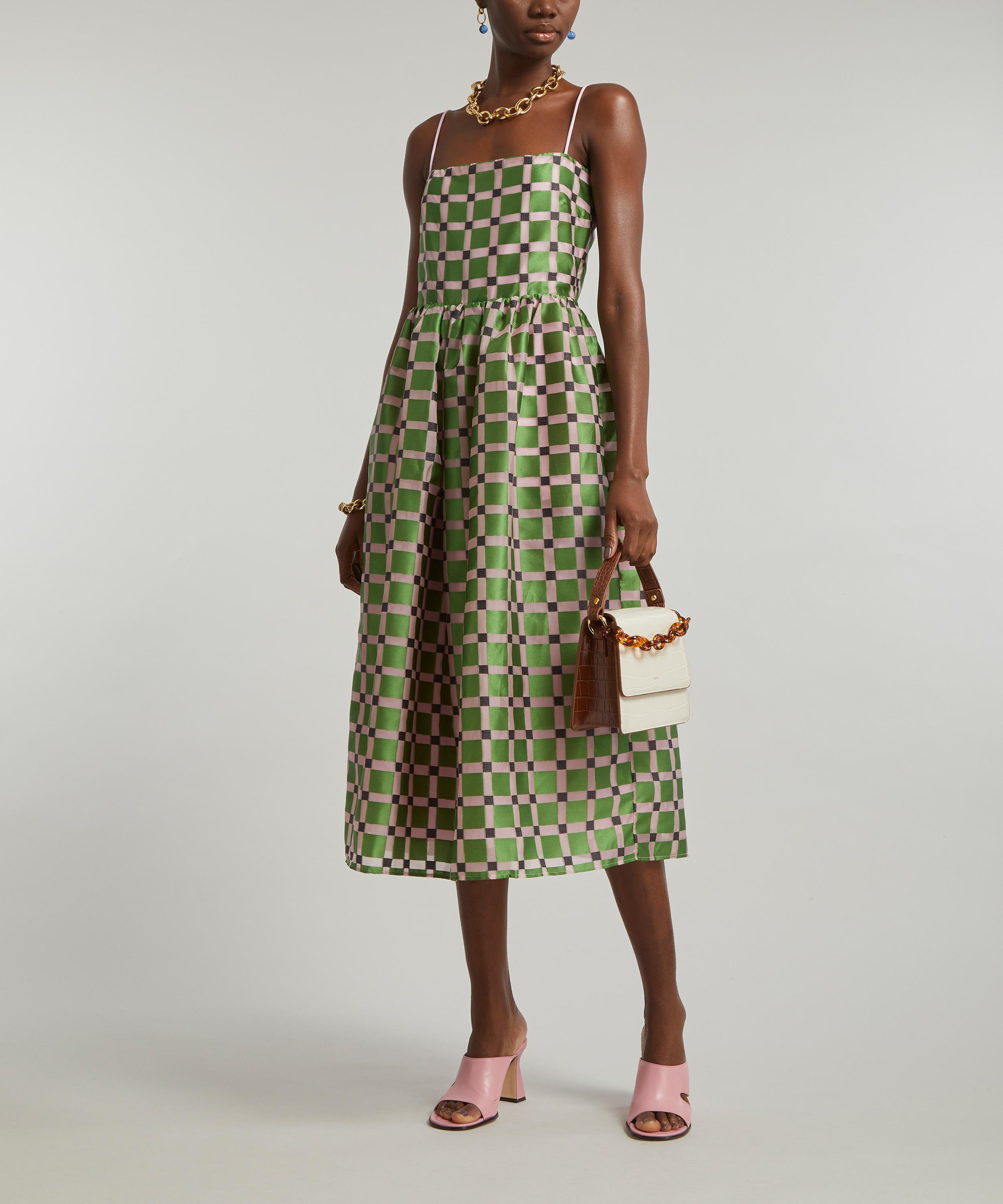 The Anny dress from Copenhagen label Stine Goya embodies the brand's spirited use of colour and bravery in evolving timeless prints. Tailored to a voluminous, A-line silhouette with a slim bodice and full-skirt, the Anny is crafted from a loose and lightweight, satin-like polyester-blend in a gorgeous green geometric pattern that exudes elegance.