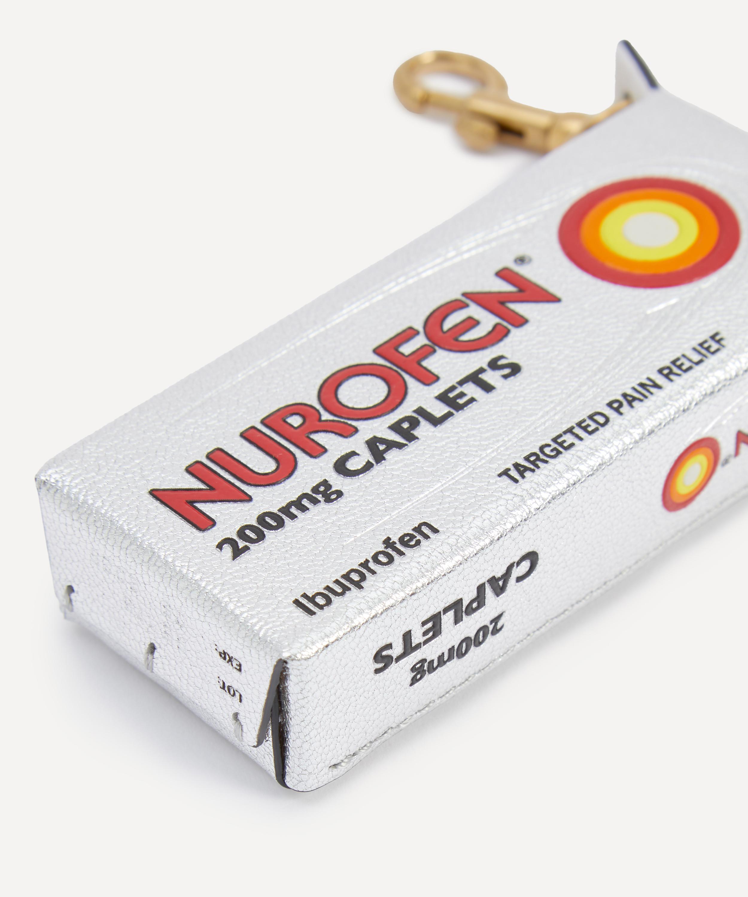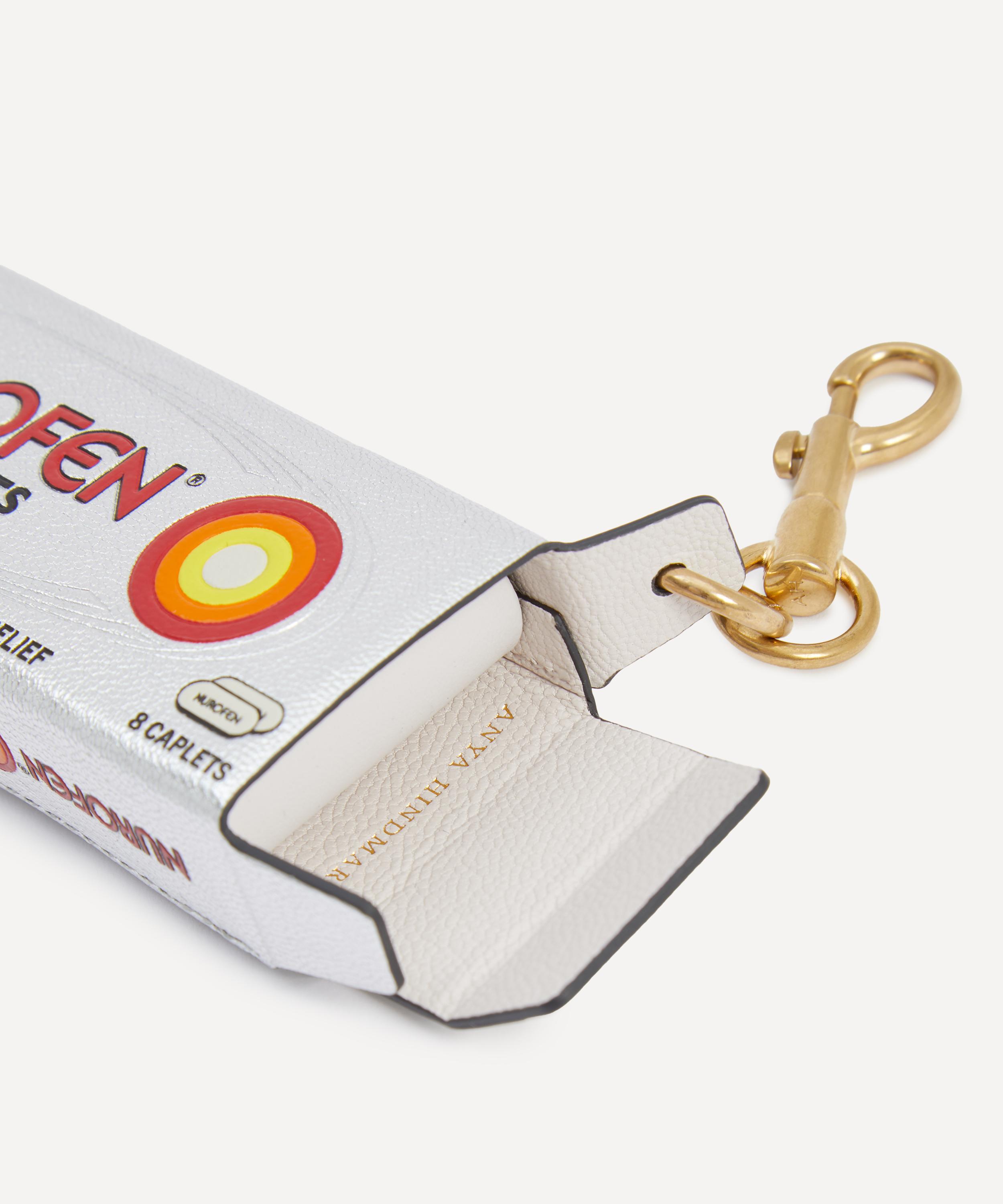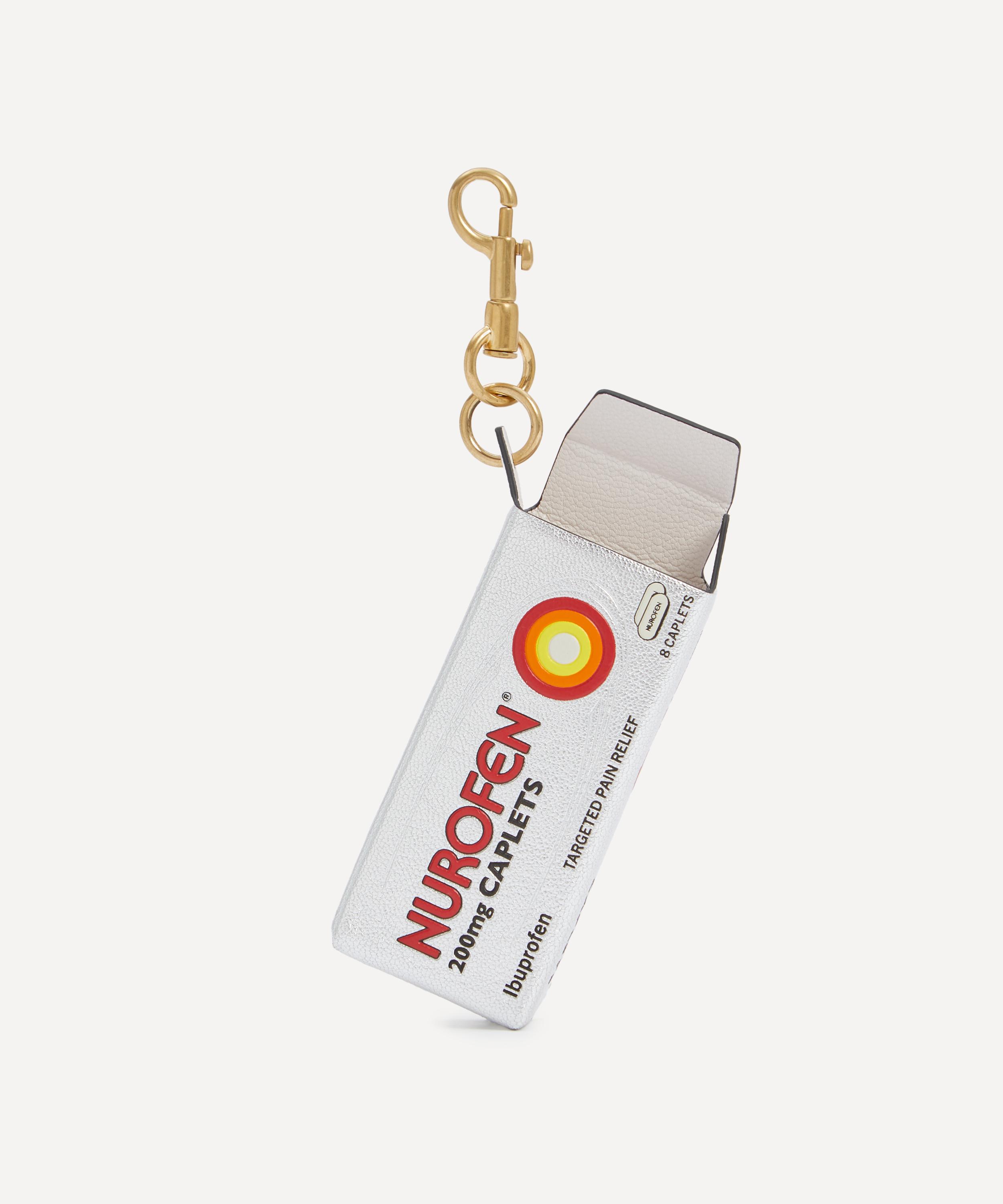 Crafted from glossy capra leather to look like a pack of Nurofen, this charm is finished with foiled appliqué and embossed detailing – complete with a gold-tone clasp reflecting the brand’s skill for fun, functional accessories.About Anya Hindmarch