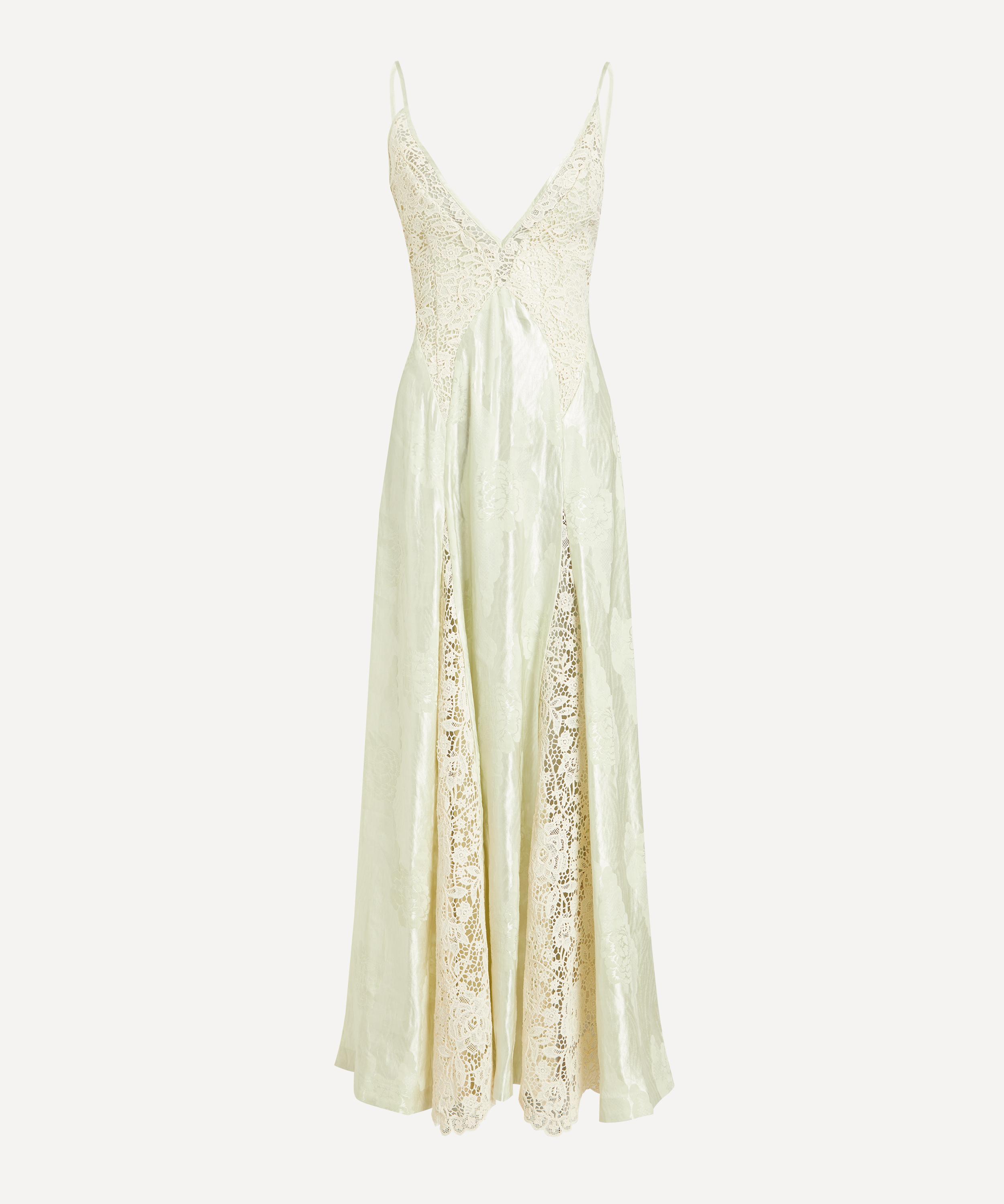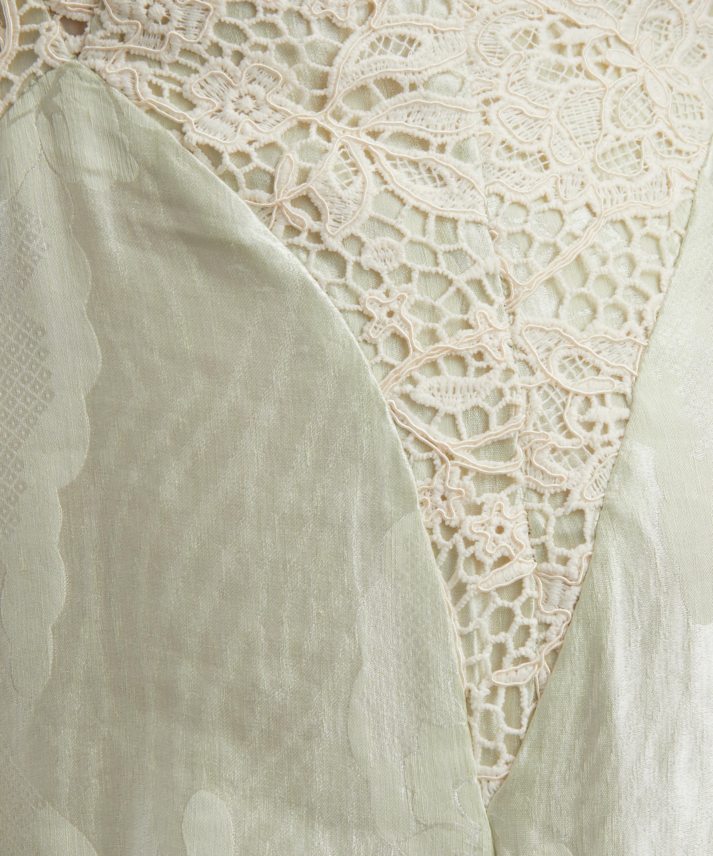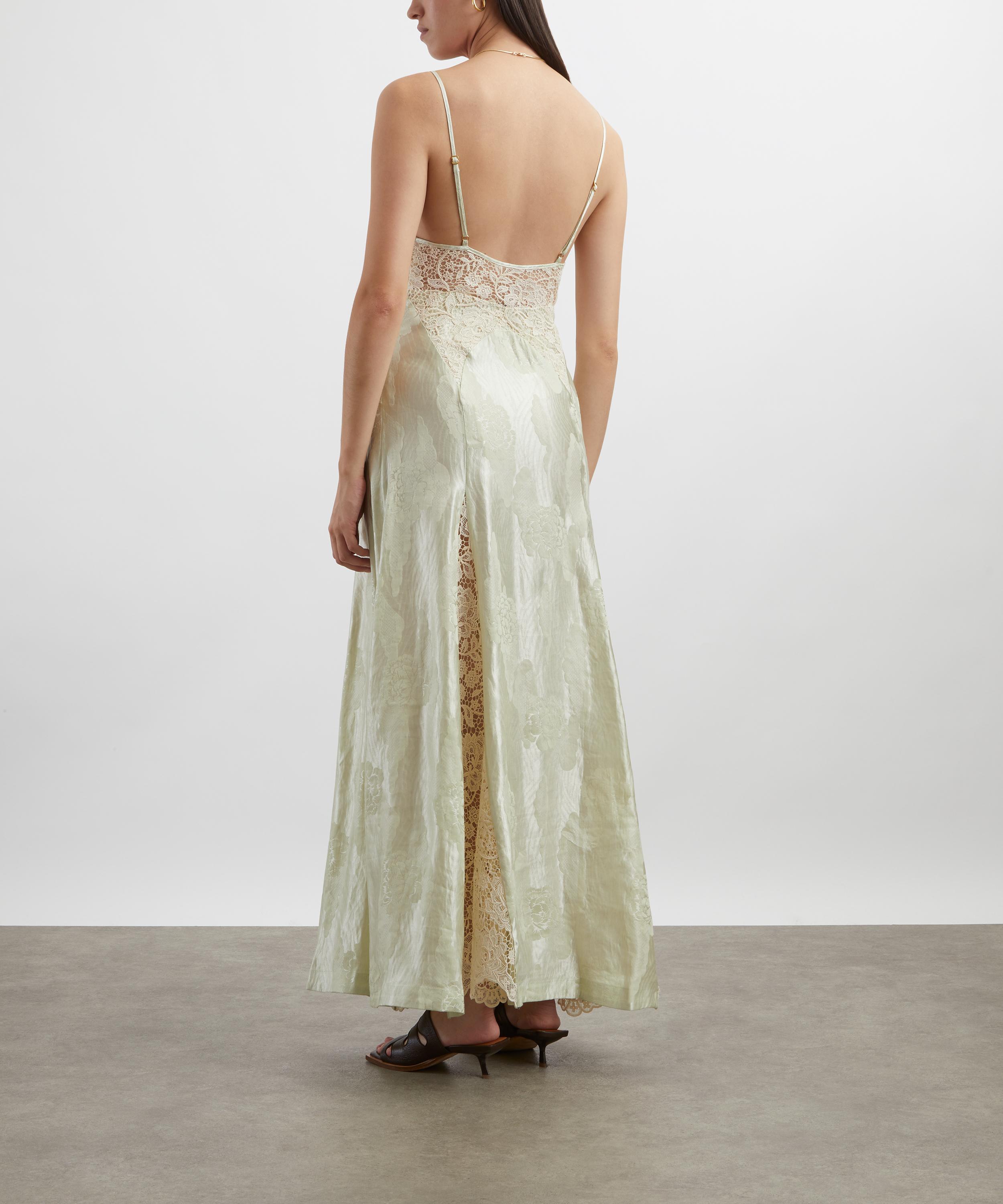 The Apollonia Slip Dress features a flattering midi silhouette with a plunging V-neckline, crafted from lightweight linen-silk blend floral jacquard fabric and finished with delicate lace panels for an elegant, feminine touch.