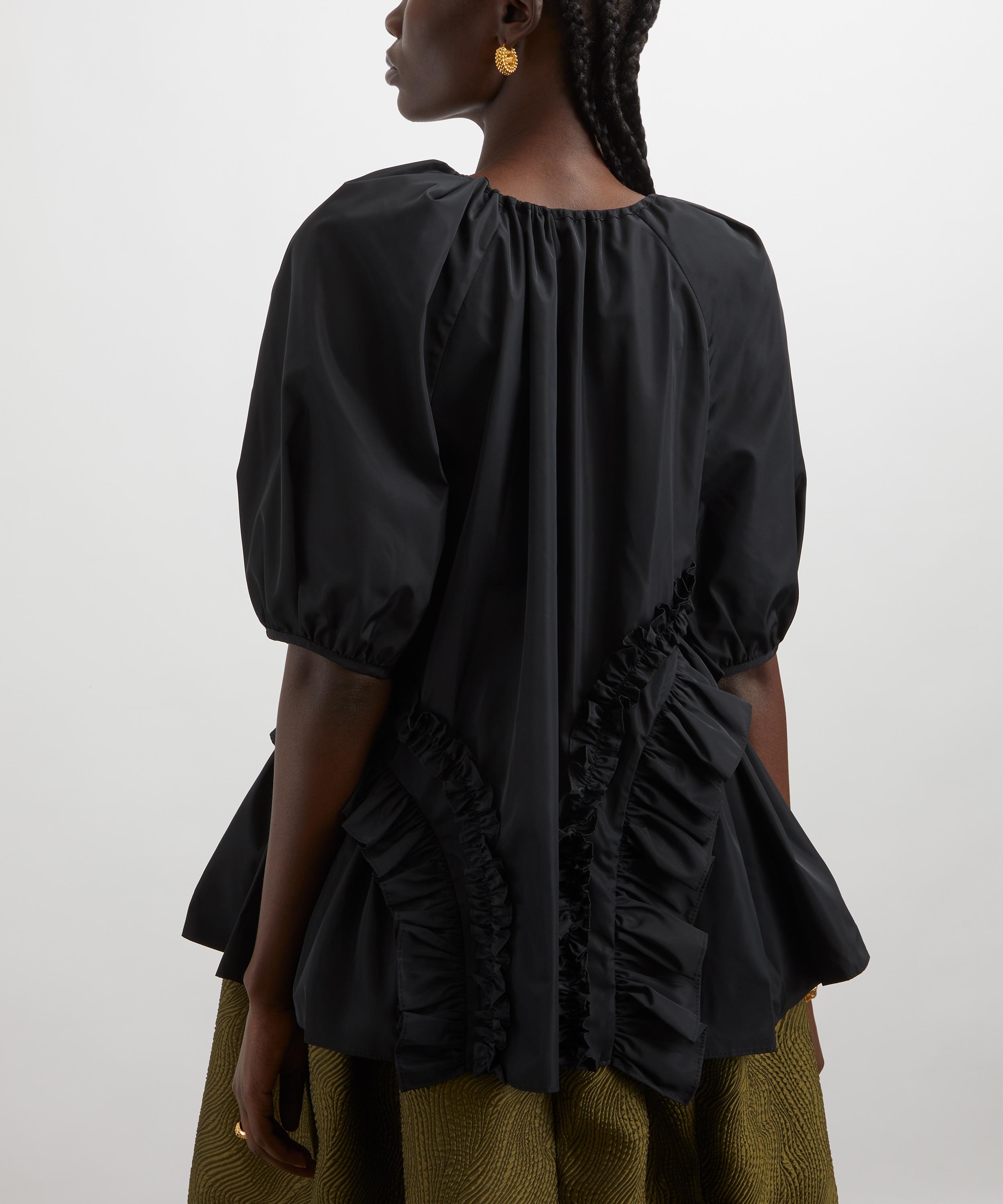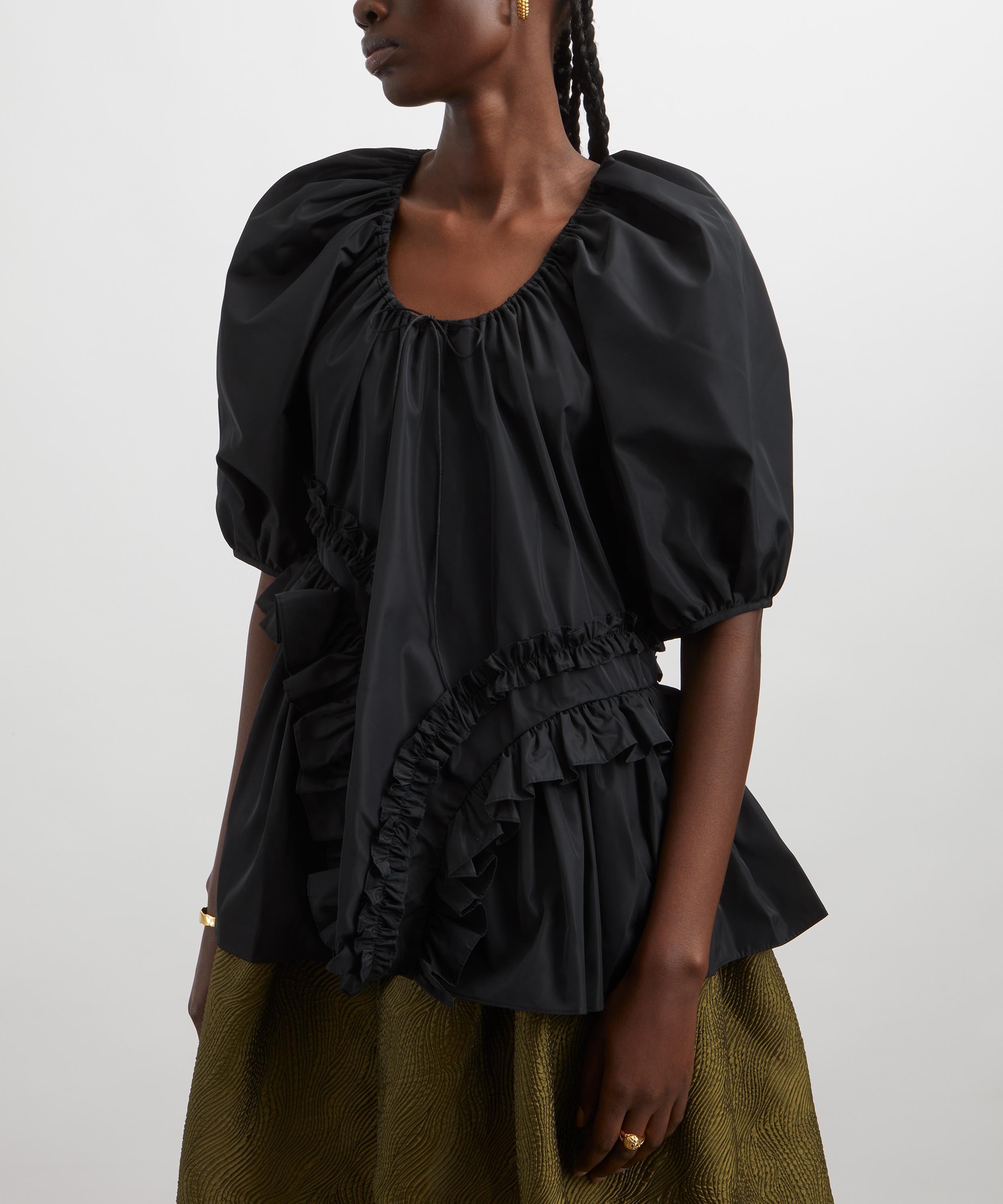 A new expression of everyday couture, the Arabella Top combines elegance with modern flair. Crafted from faille, asymmetrical ruffles create flattering volume around the hips, while billowing puff sleeves and a bow-embellished scoop neckline add an effortless touch of contemporary femininity.