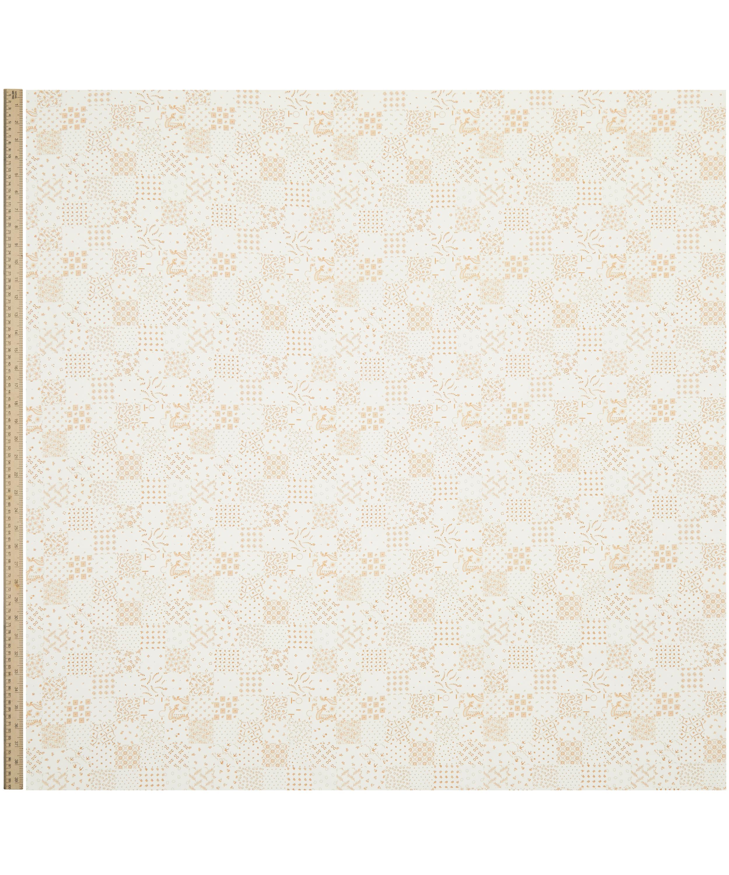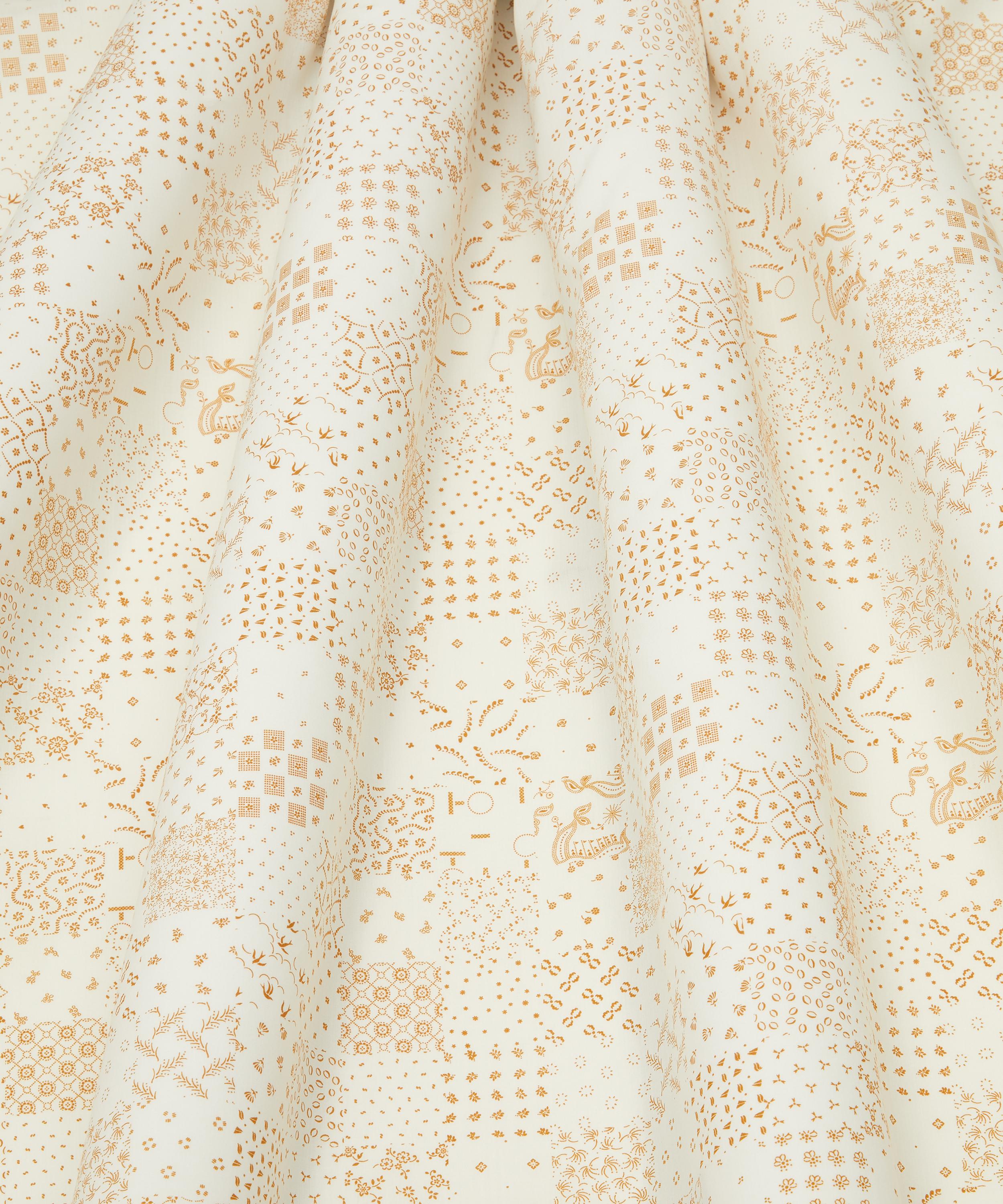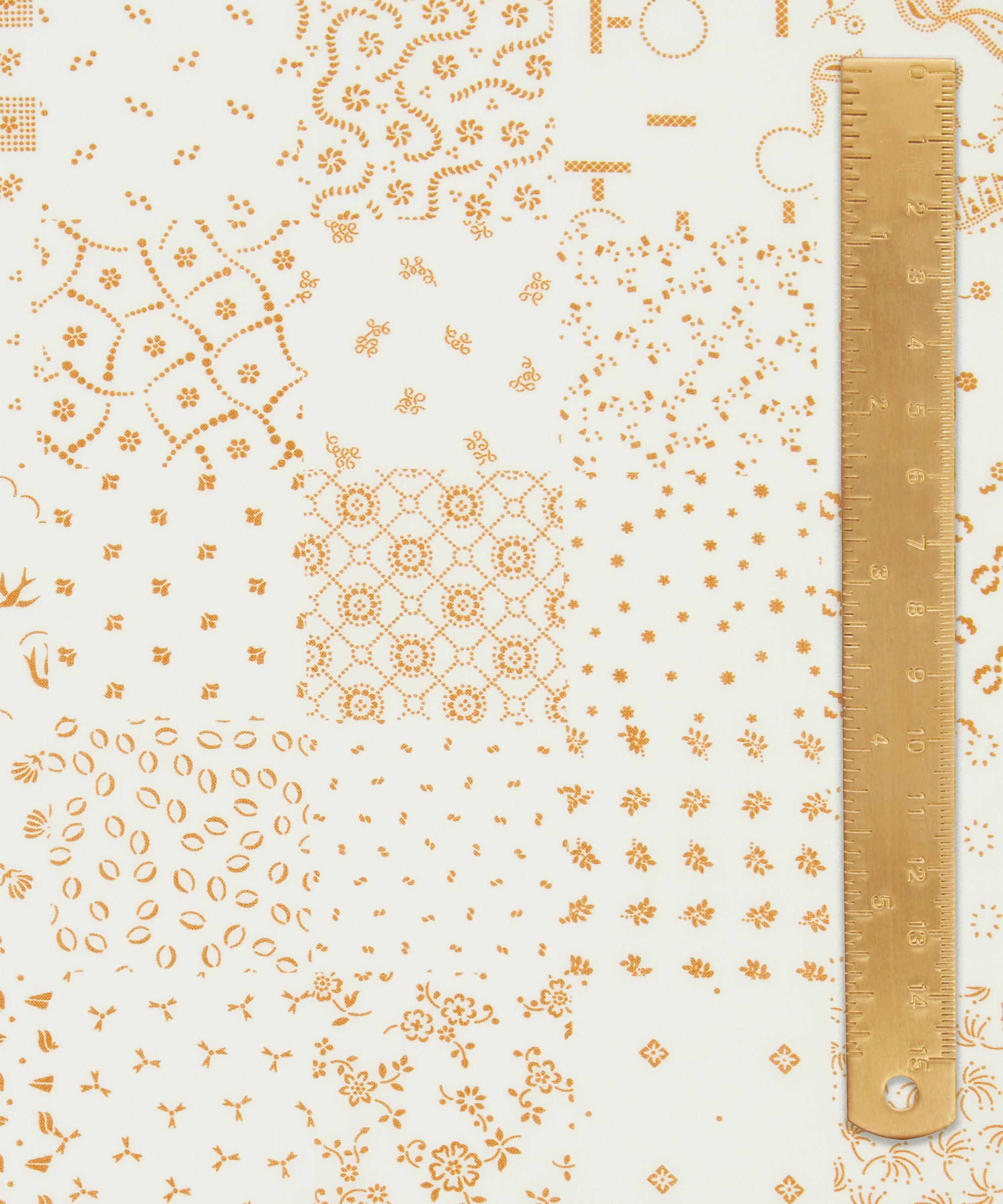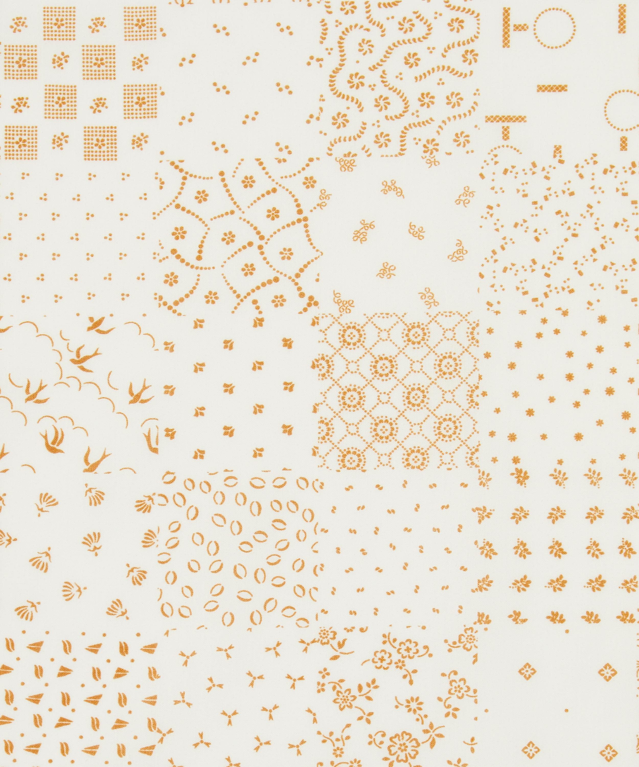 Archive Medley was inspired by a series of miniature artworks from the Liberty archive, originally created using white paint on black paper. Reimagined into a lively collective resembling a patchwork, the composition blends an eclectic mix of motifs- from tiny spots and leaves to floral geometrics, tile patterns, and even whimsical dancing figures. With its monochromatic stencil style, the design exudes a nostalgic yet contemporary edge.