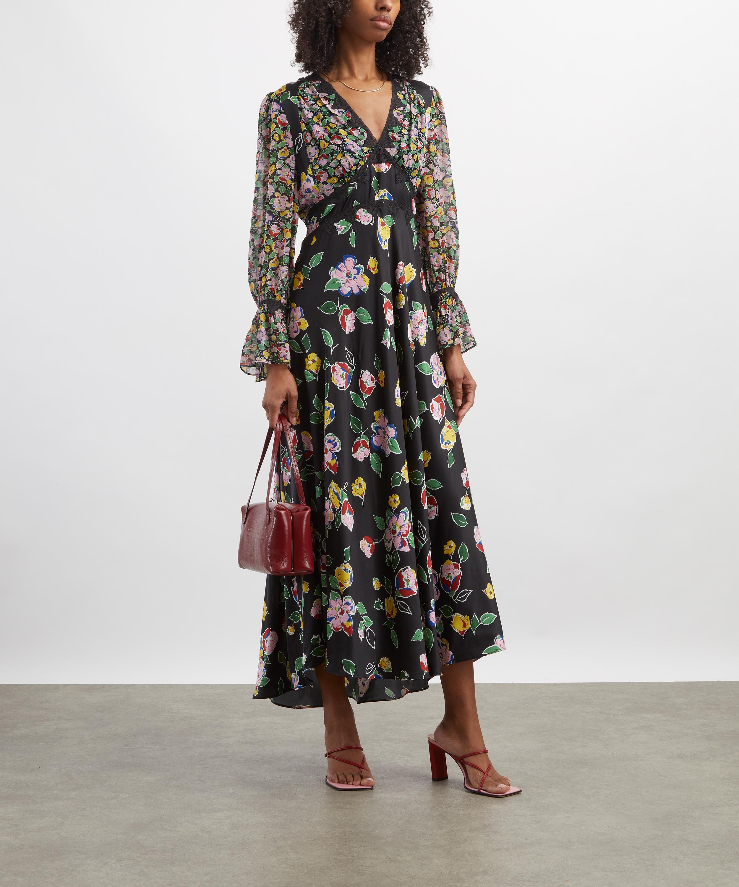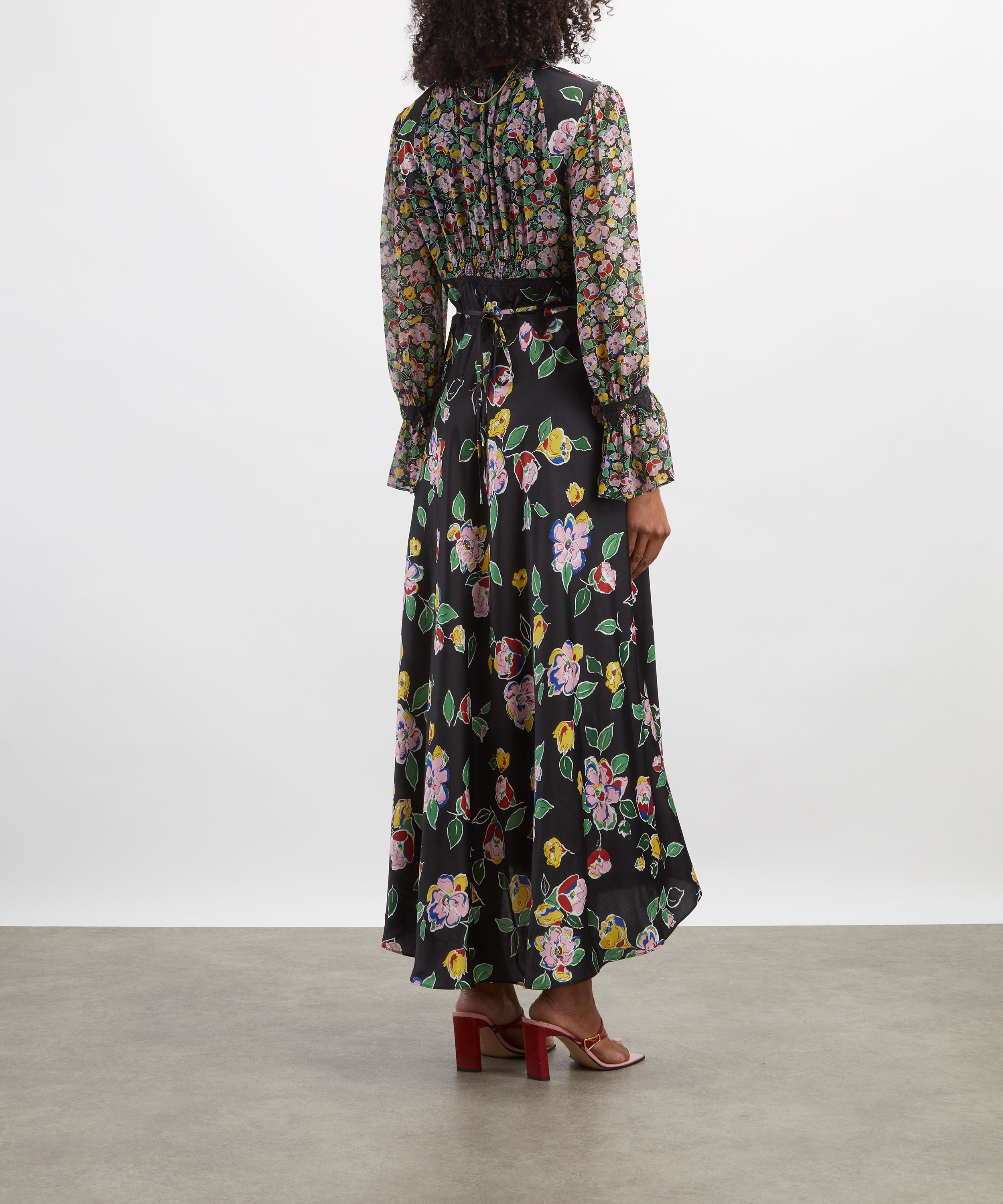 Crafted from a sumptuous silk-satin blend, this romantic, vintage-inspired dress features whimsical florals and delicate lace trims for timeless occasion appeal. A deep V-neckline and long sleeves frame the silhouette, while the empire waist flows into a graceful ankle-length skirt.