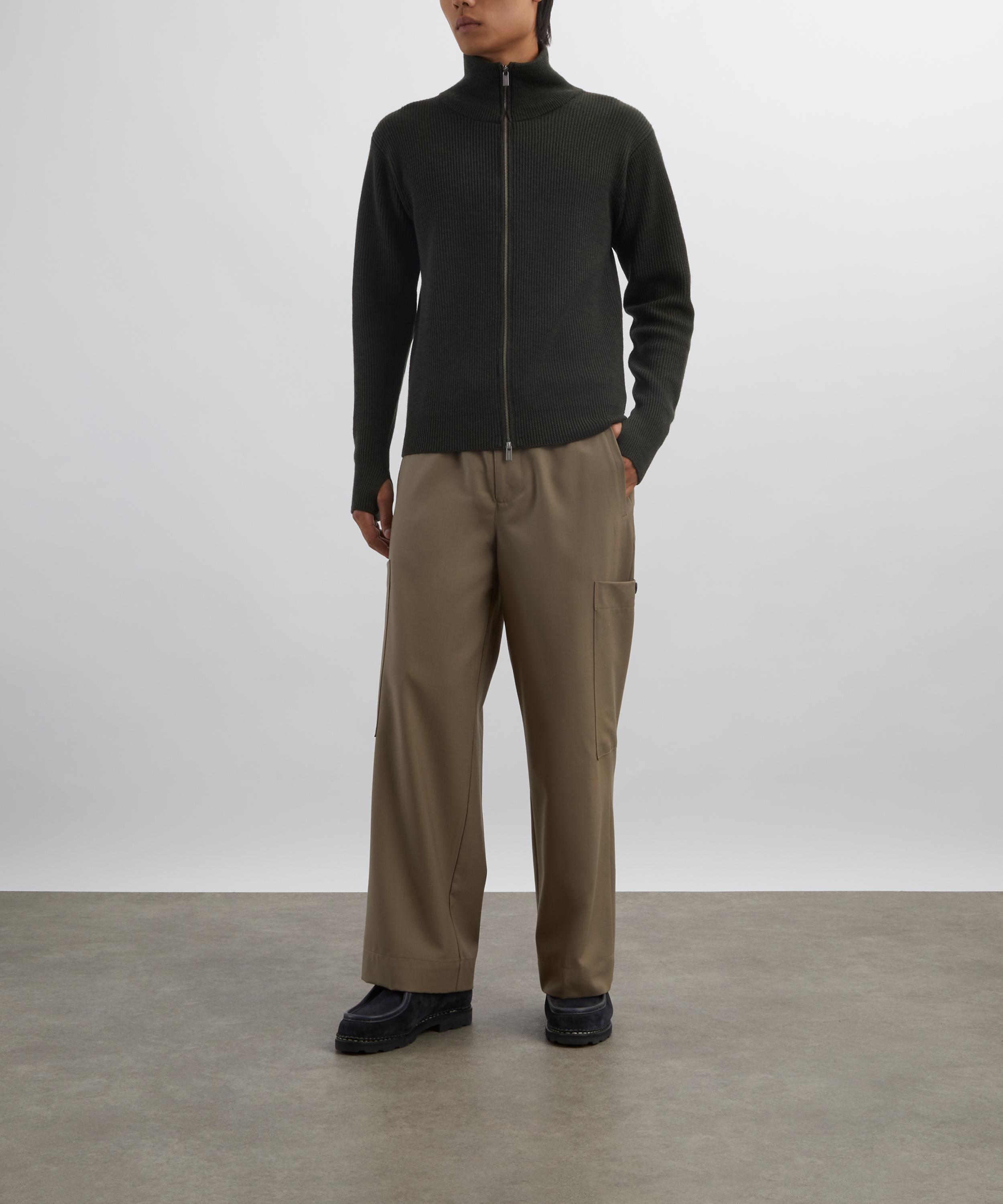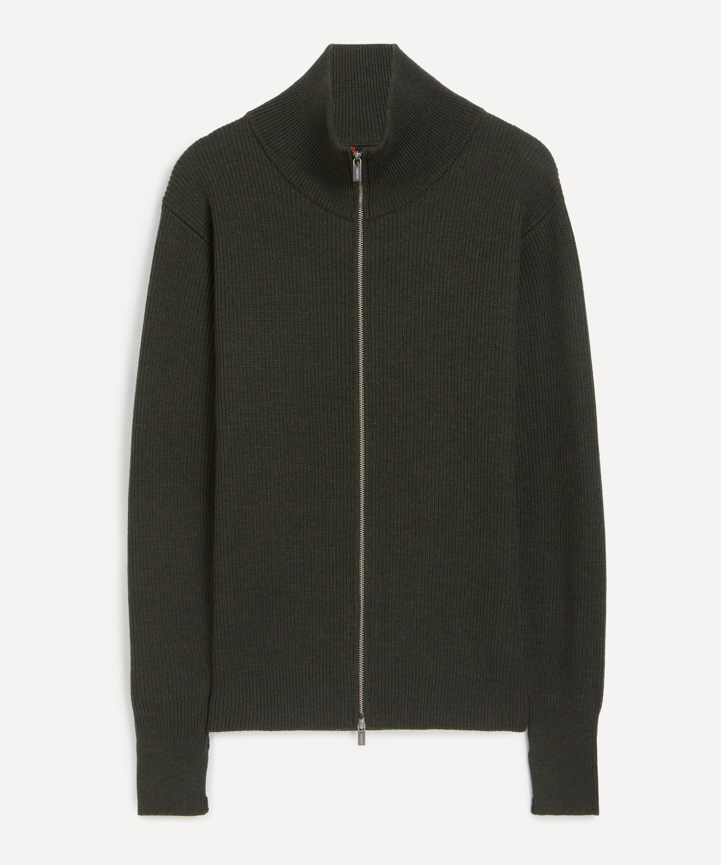 Finely knitted in Italy from virgin wool in a classic army-green hue, this rib-knit cardigan features a cosy turtleneck, thumbholes at the cuffs for added warmth, and a double-ended zip fastening for versatile styling.