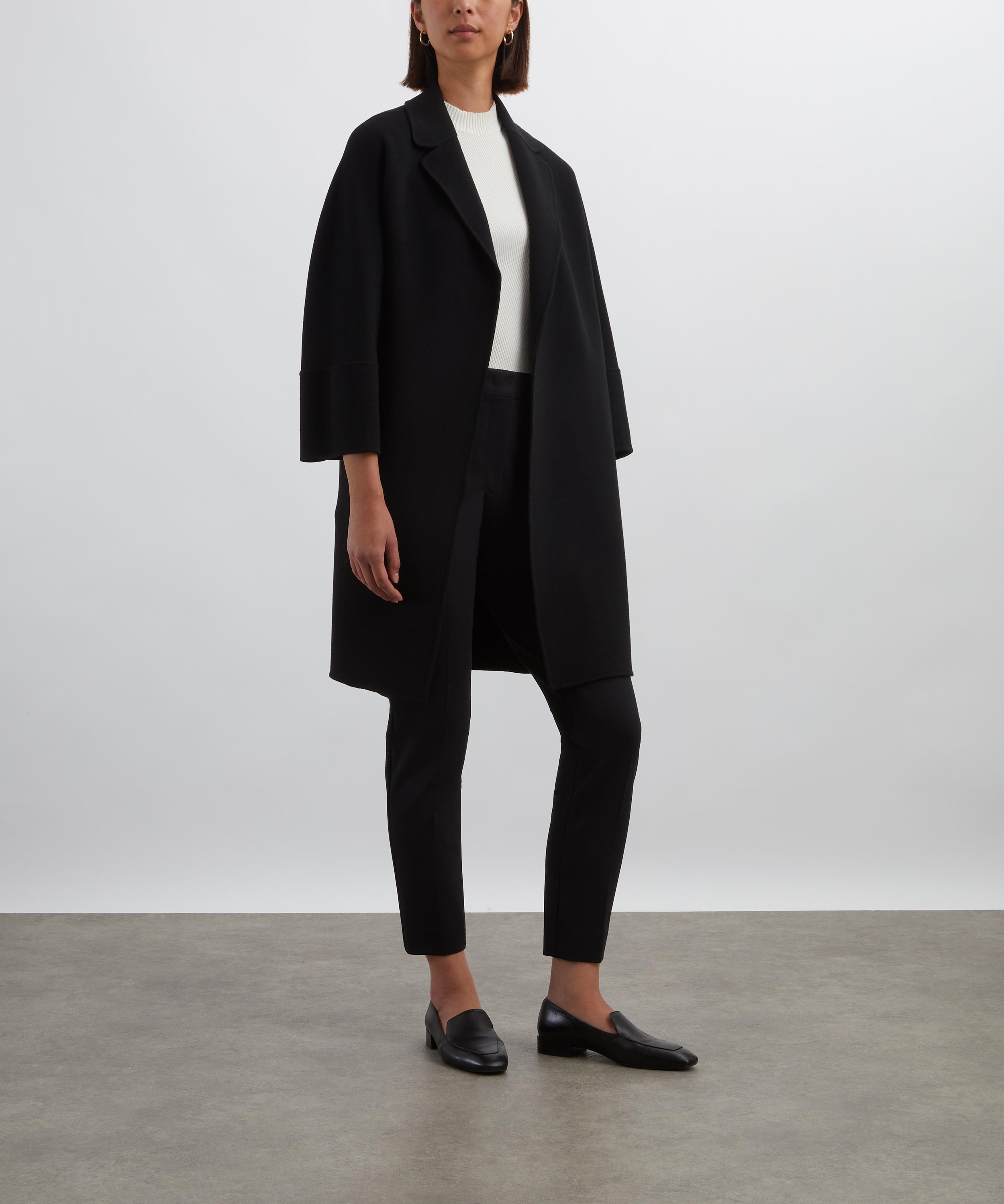 Crafted from a luxurious, double-faced wool, this short, cocoon-shaped coat exudes understated elegance with a lapel collar, kimono-raglan sleeves, and a matching belt at the waist for a cinched silhouette.