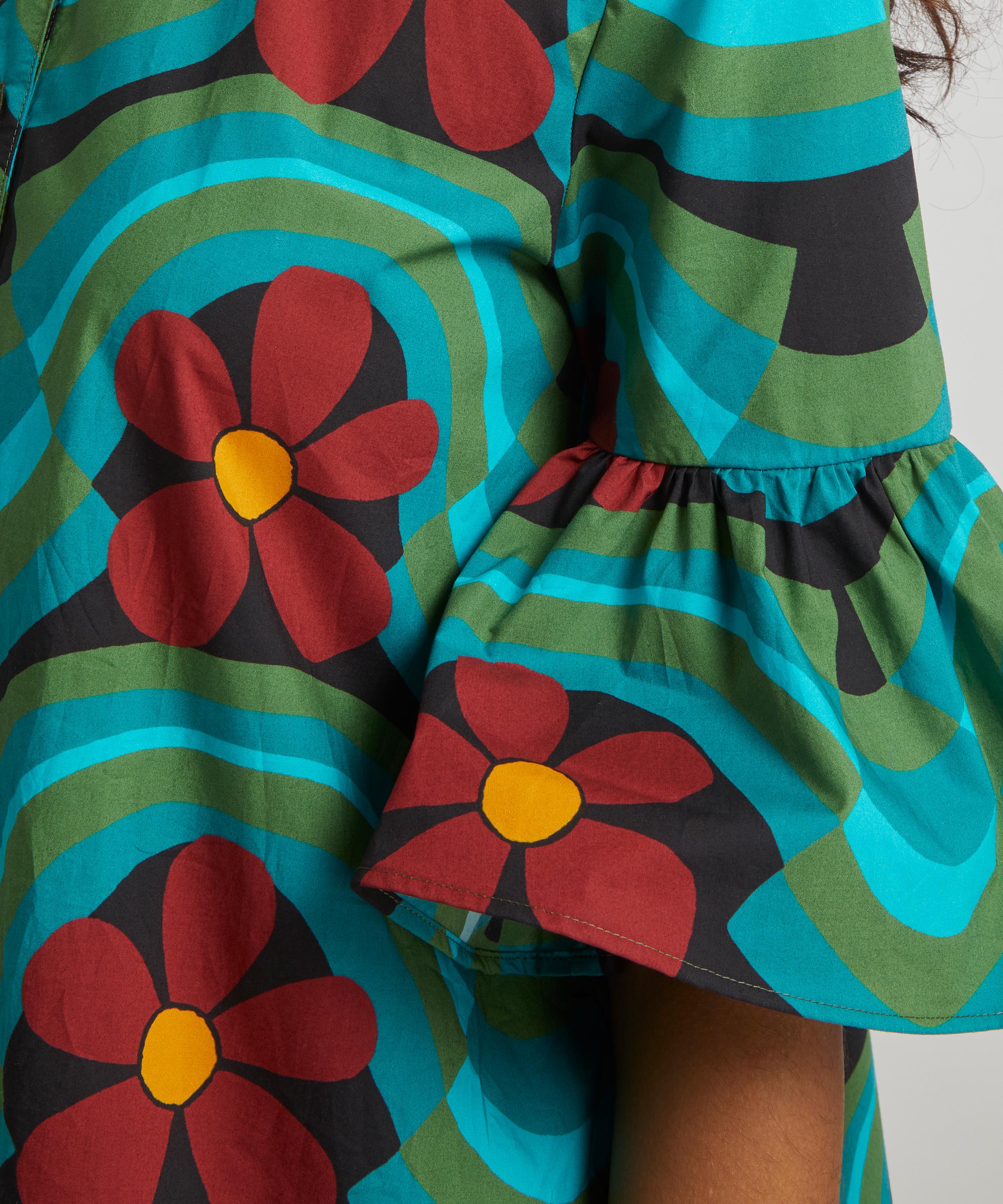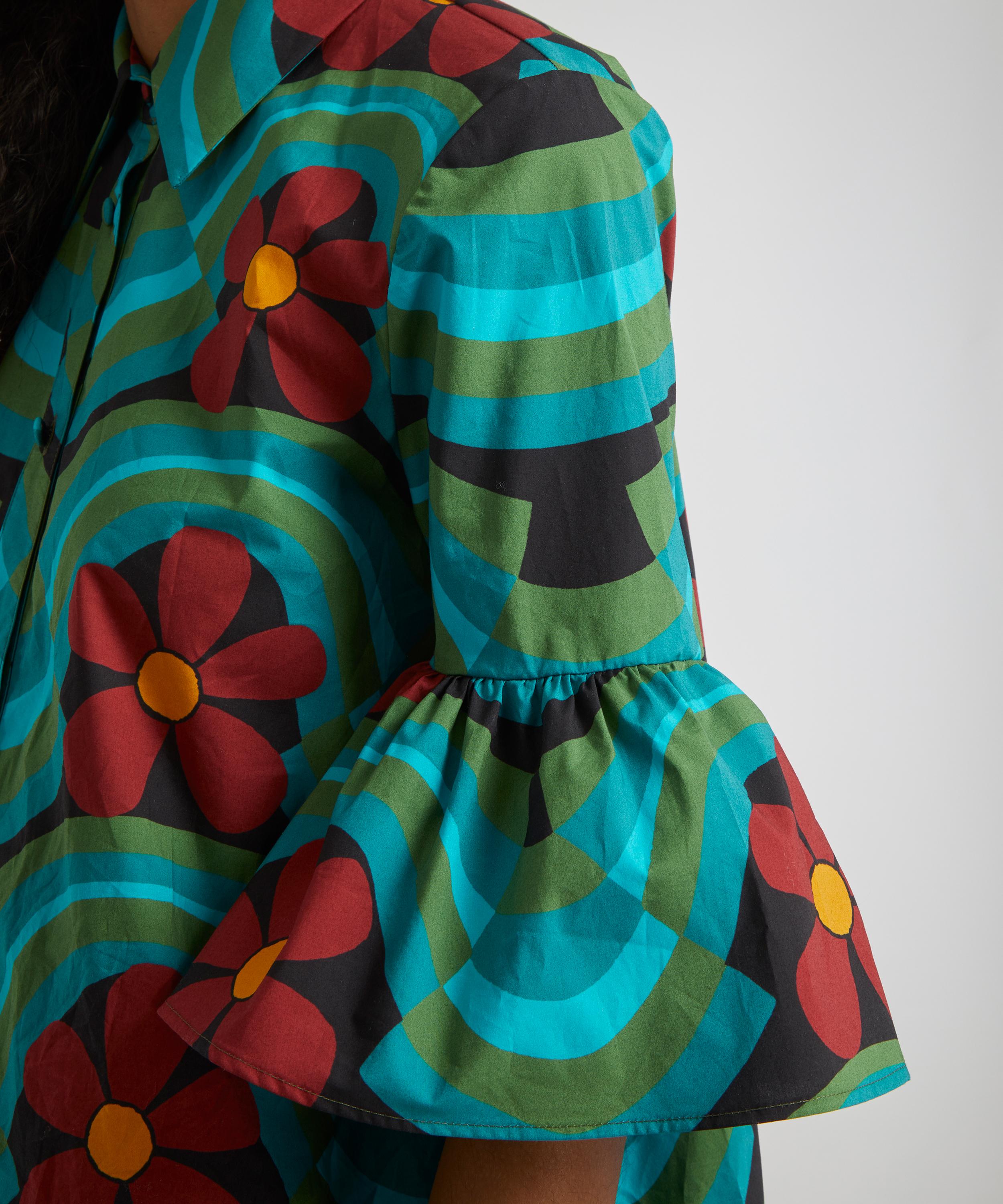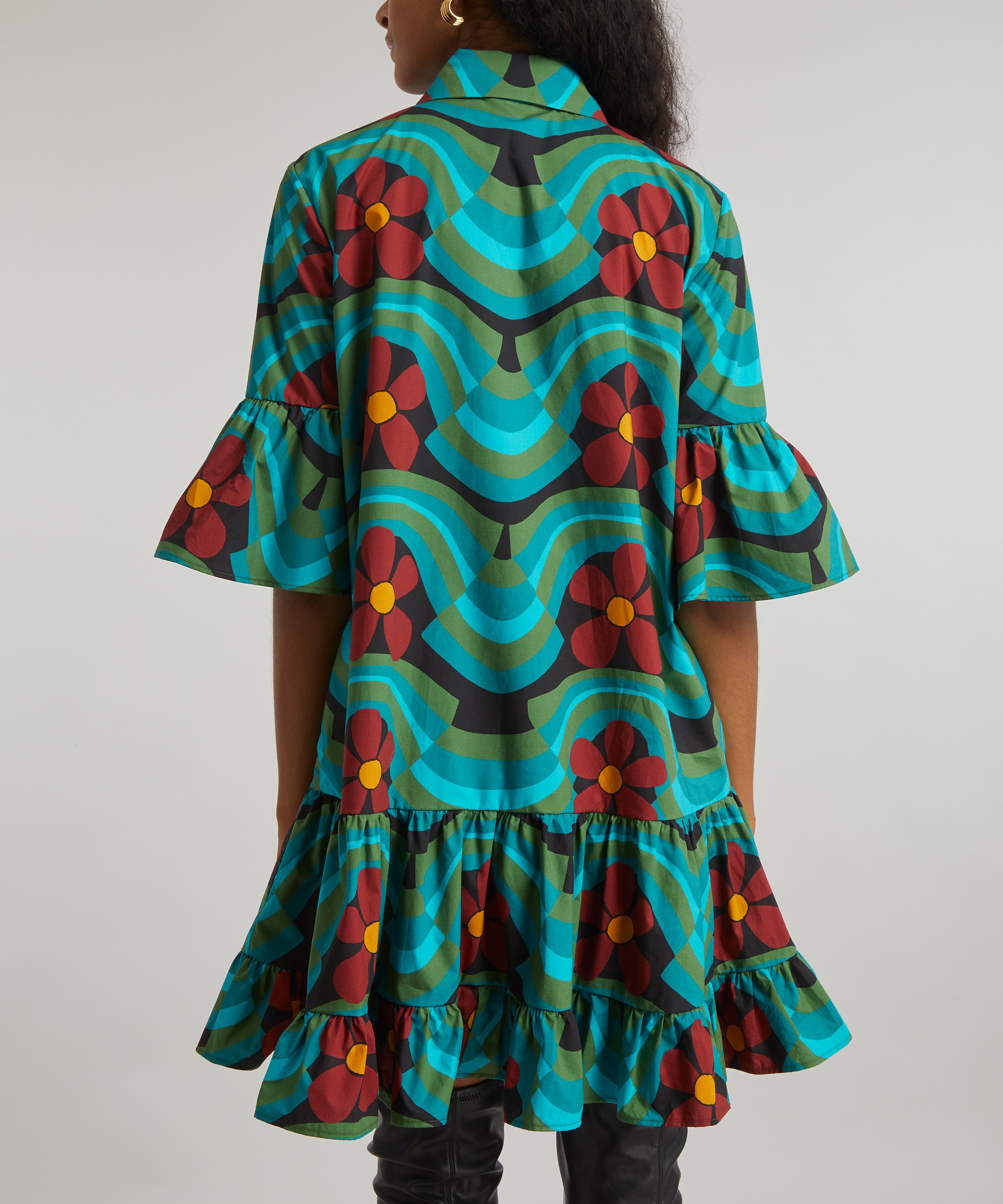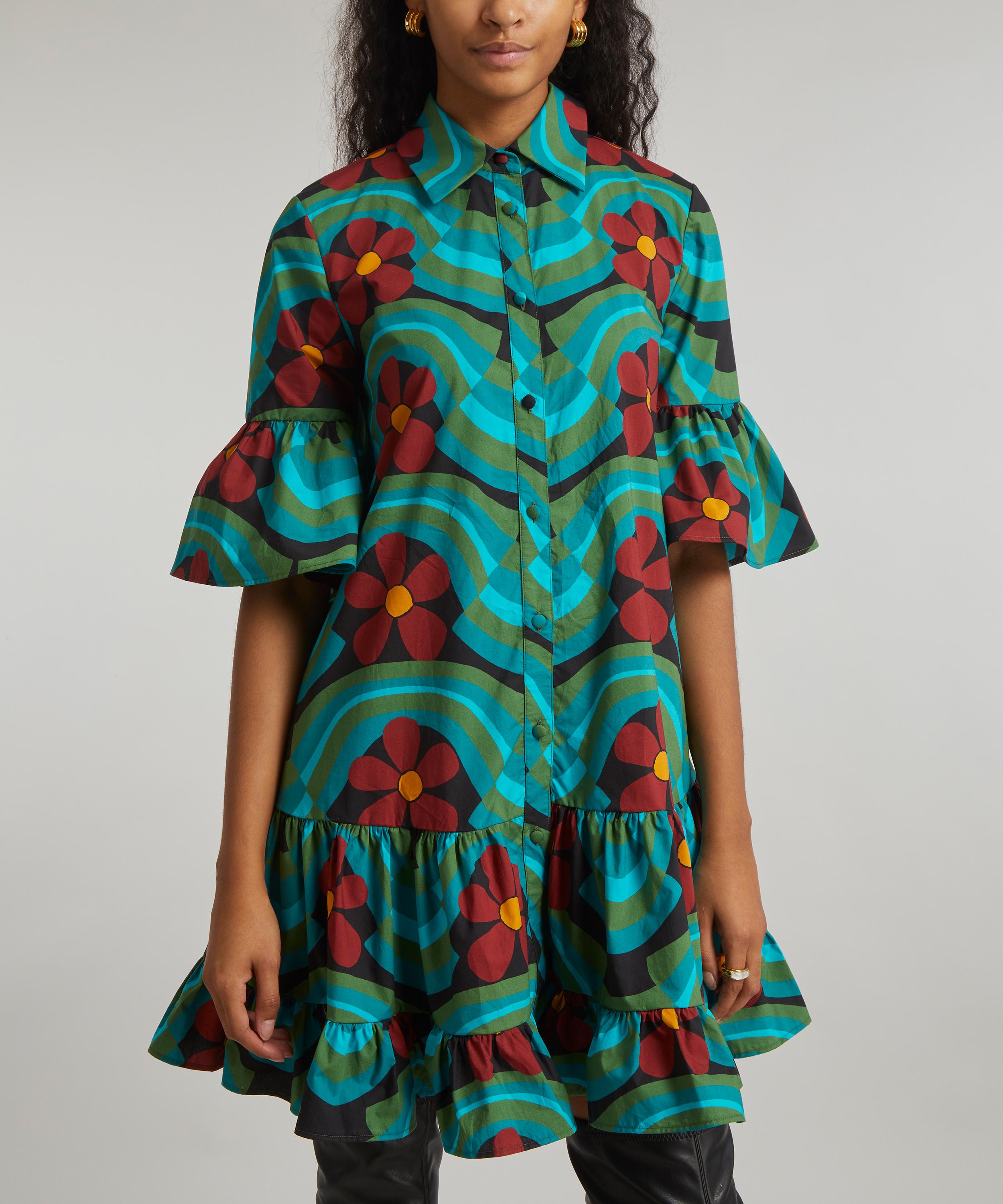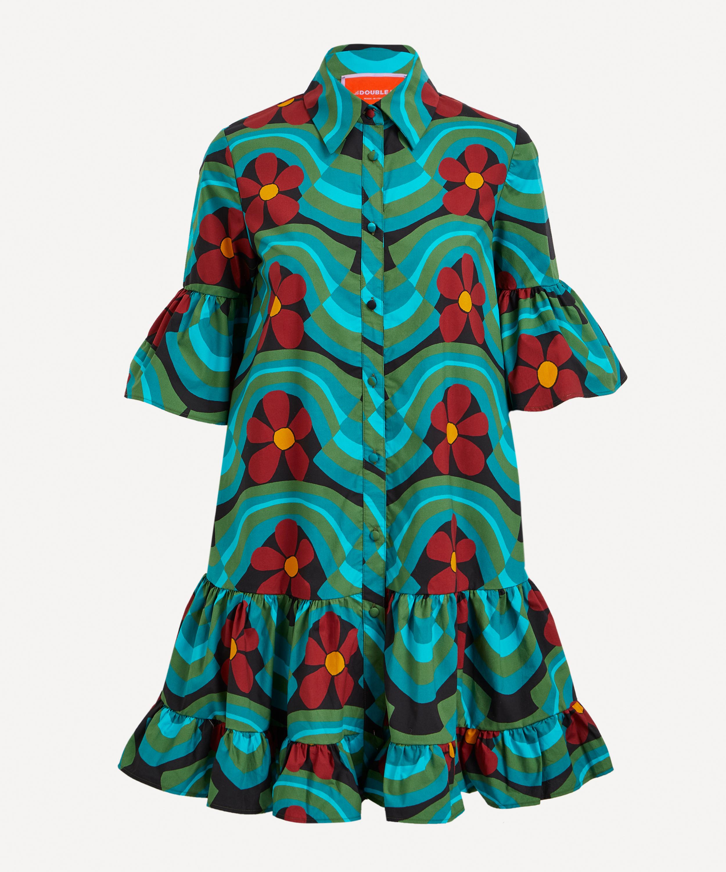 Italian label La DoubleJ updates its signature Choux dress in the ravishingly retro Ashbury print. Vibrant and voluminous, this cotton-poplin mini-dress features fluted-short sleeves and a tiered rara skirt for a playfully fun finish.