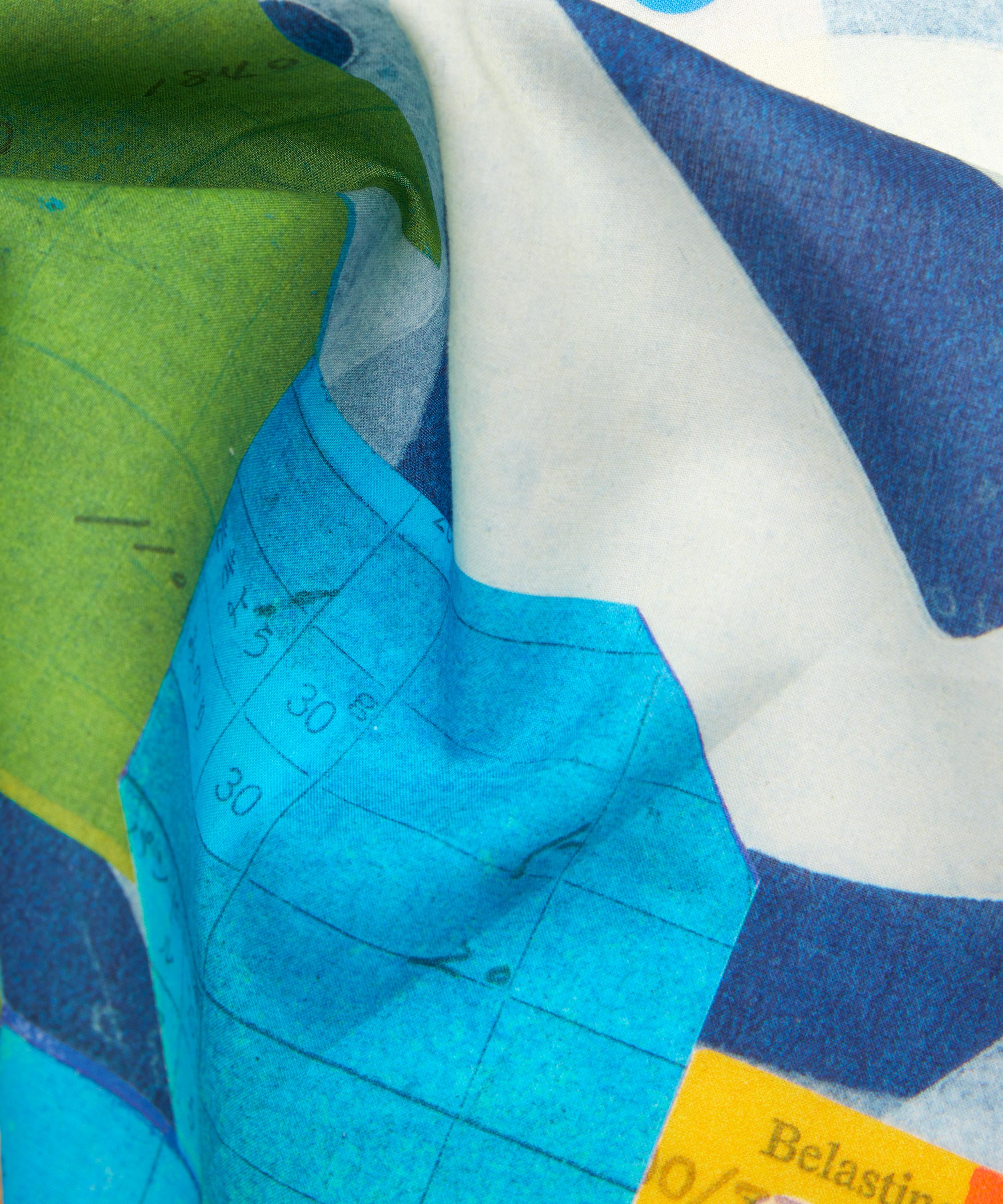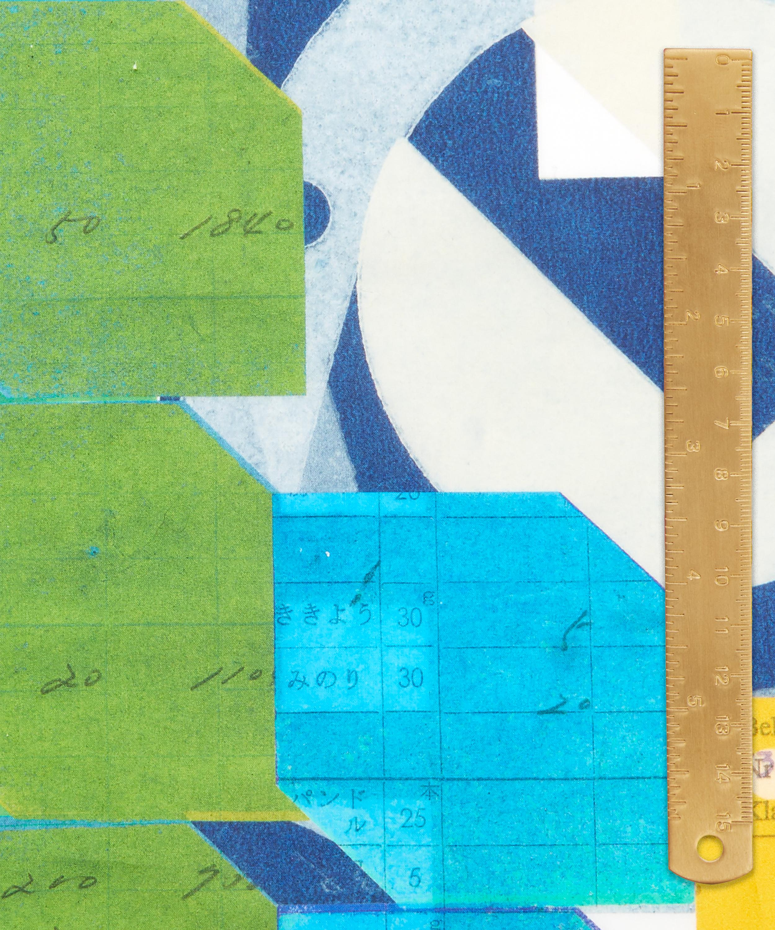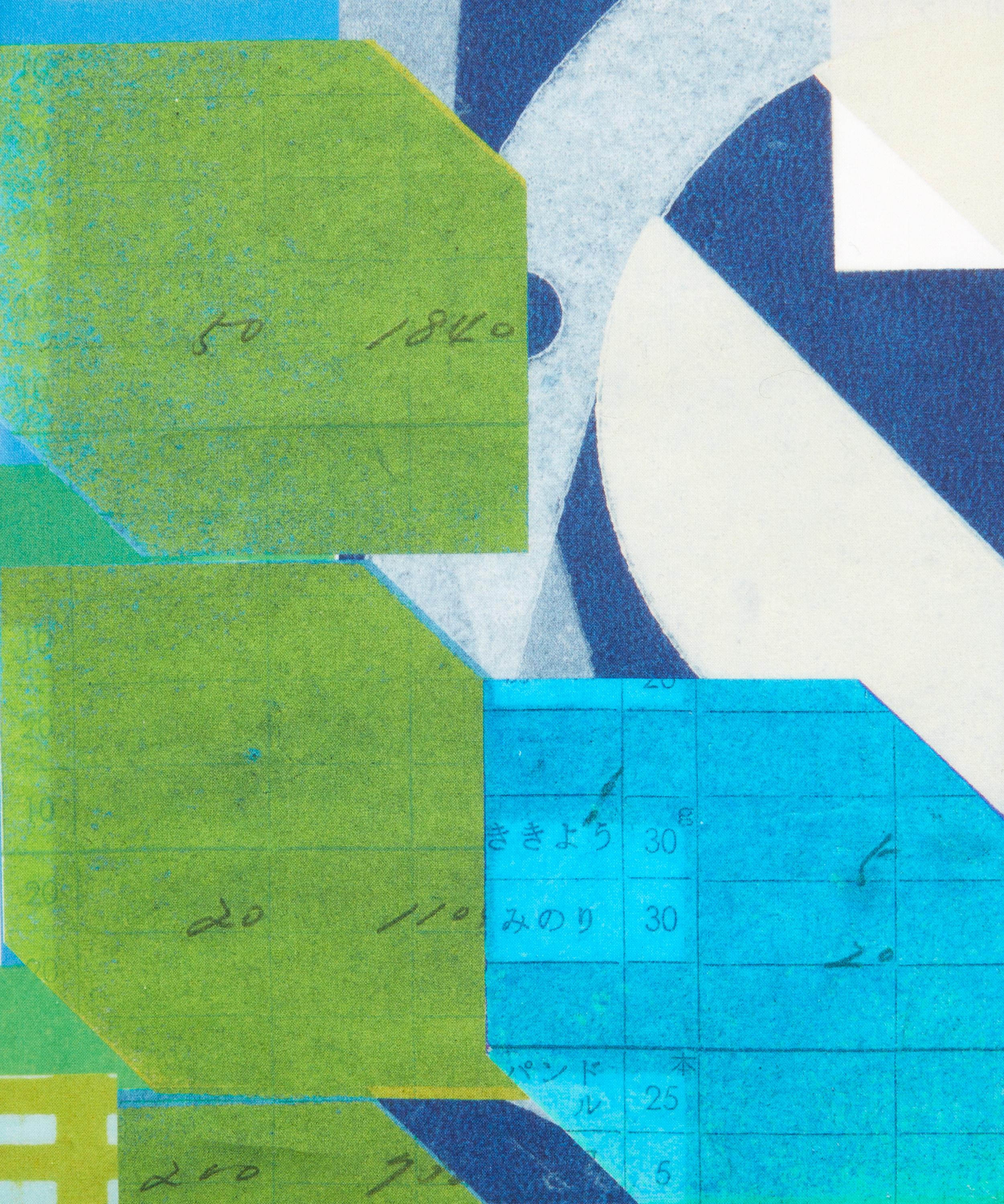 Impactful geometric shapes interact with encrypted typographic fragments in this captivating large-scale collage. Blurring the lines between accidental and carefully planned constructions, the graphic elements in this design are suggestive of machine age modernism- centrifugal rings, fastenings, repeating blocks and curiously engineered compartments.