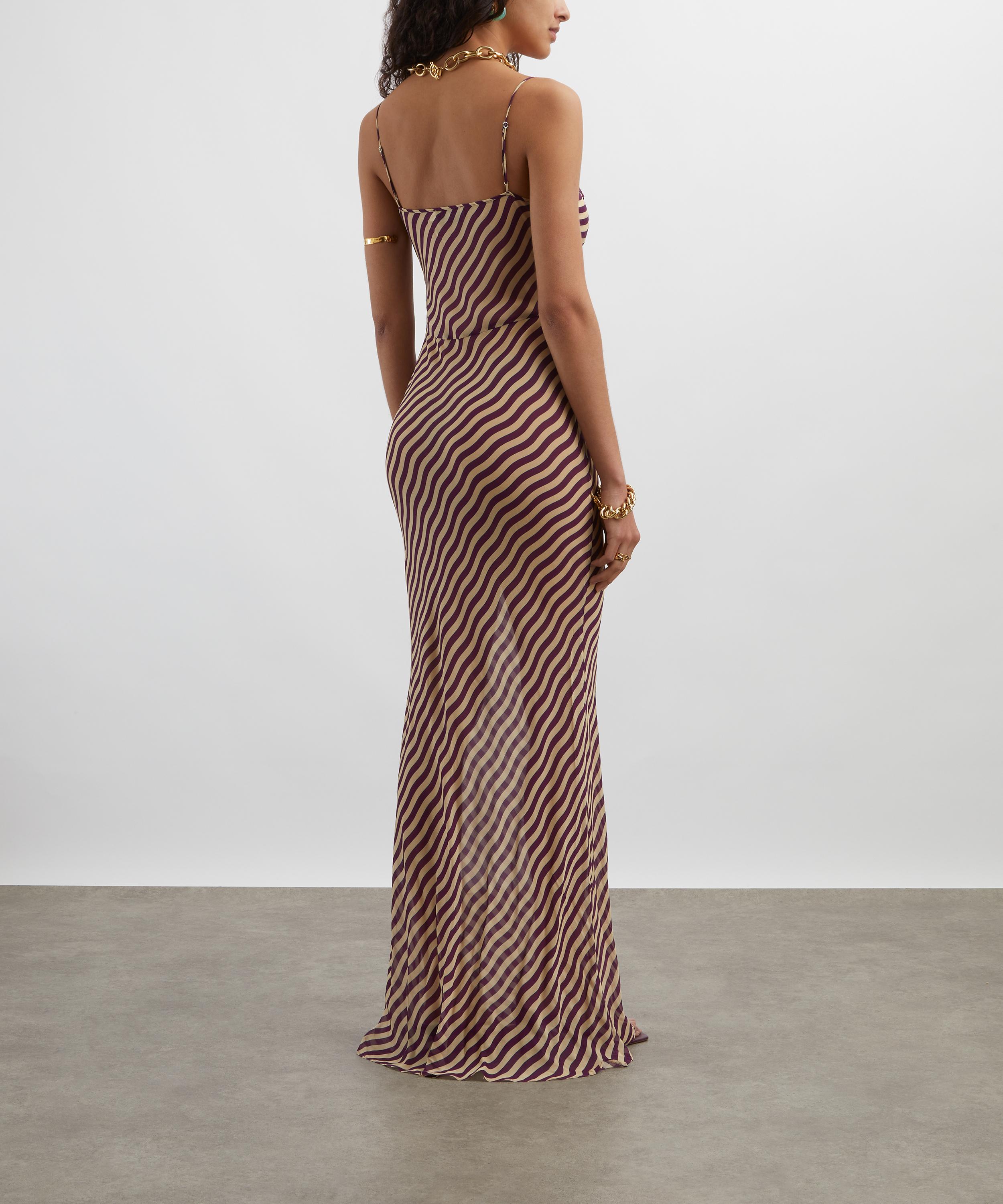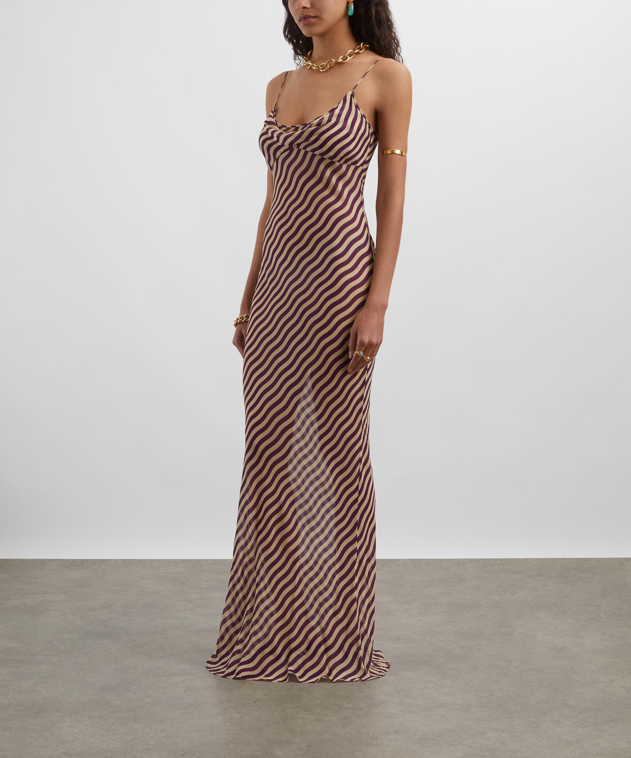 Crafted from semi-sheer viscose georgette and emblazoned with striking waves in rich, dark purple, this maxi dress exudes sophistication with its figure-skimming bias-cut silhouette, cowl neckline, and delicate straps.