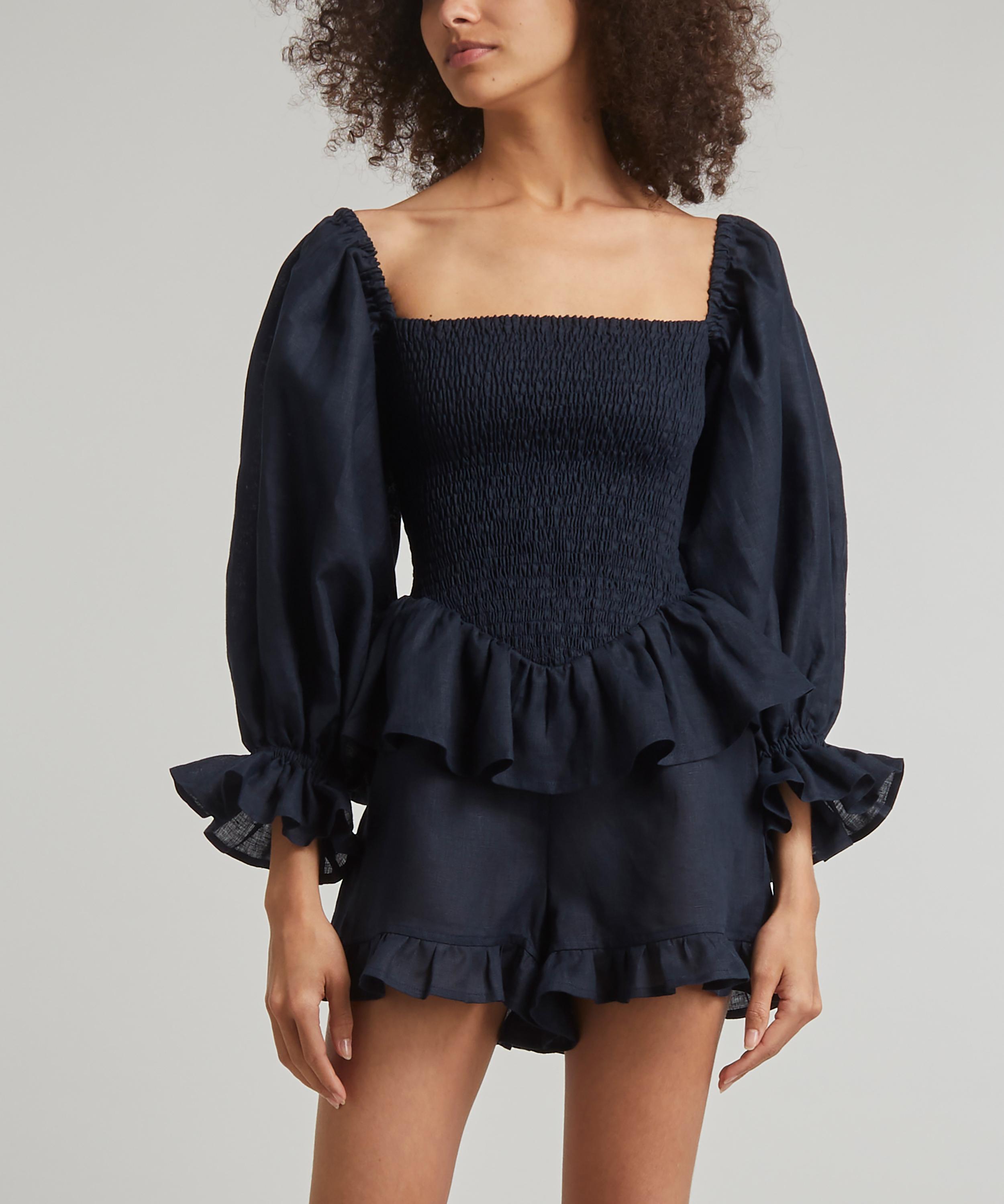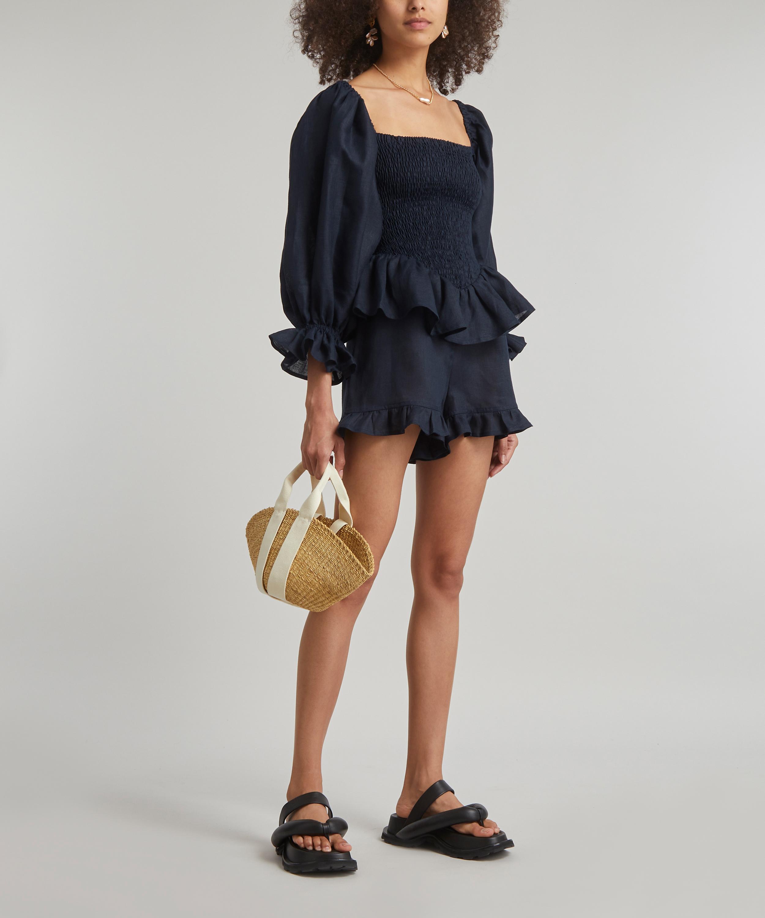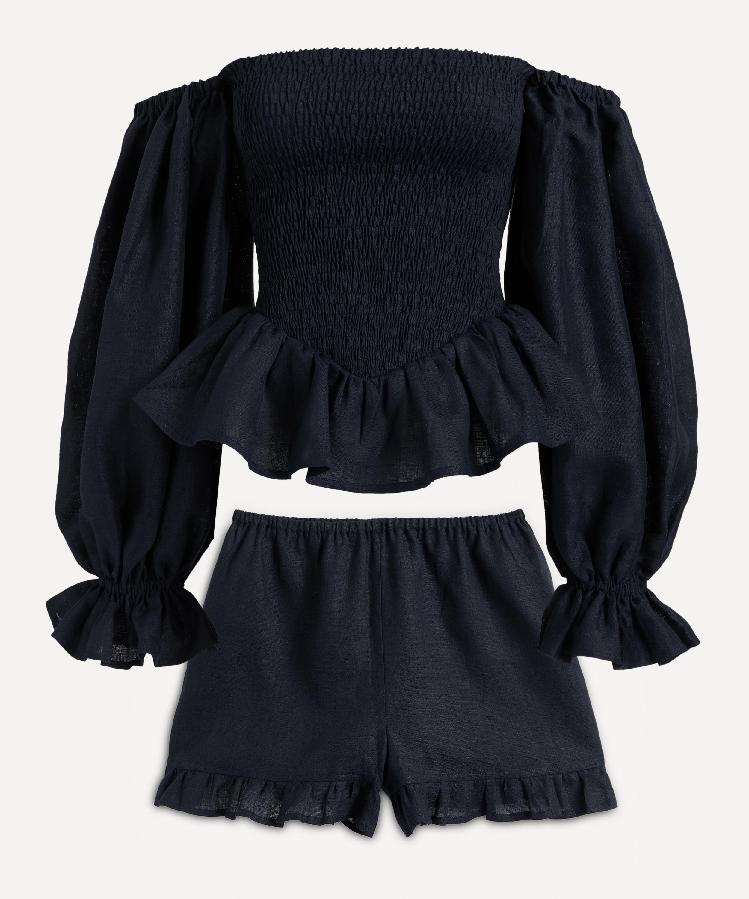 Crafted from ethically sourced linen, the Atlanta top and shorts set retains the beloved billowing sleeves and shirred bodice of Sleeper’s signature Atlanta dress, while the addition of ruffled shorts gives the two-piece a relaxed finish. Stylish and snug in equal measures, it has an elasticated waistband and shoulders for ultimate comfort and ease.