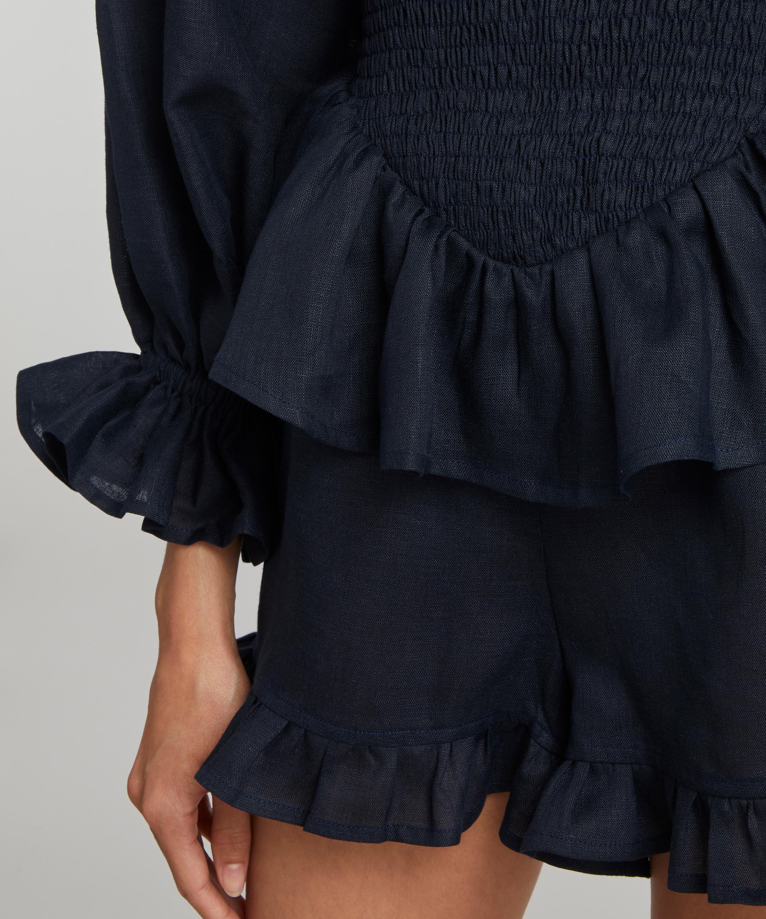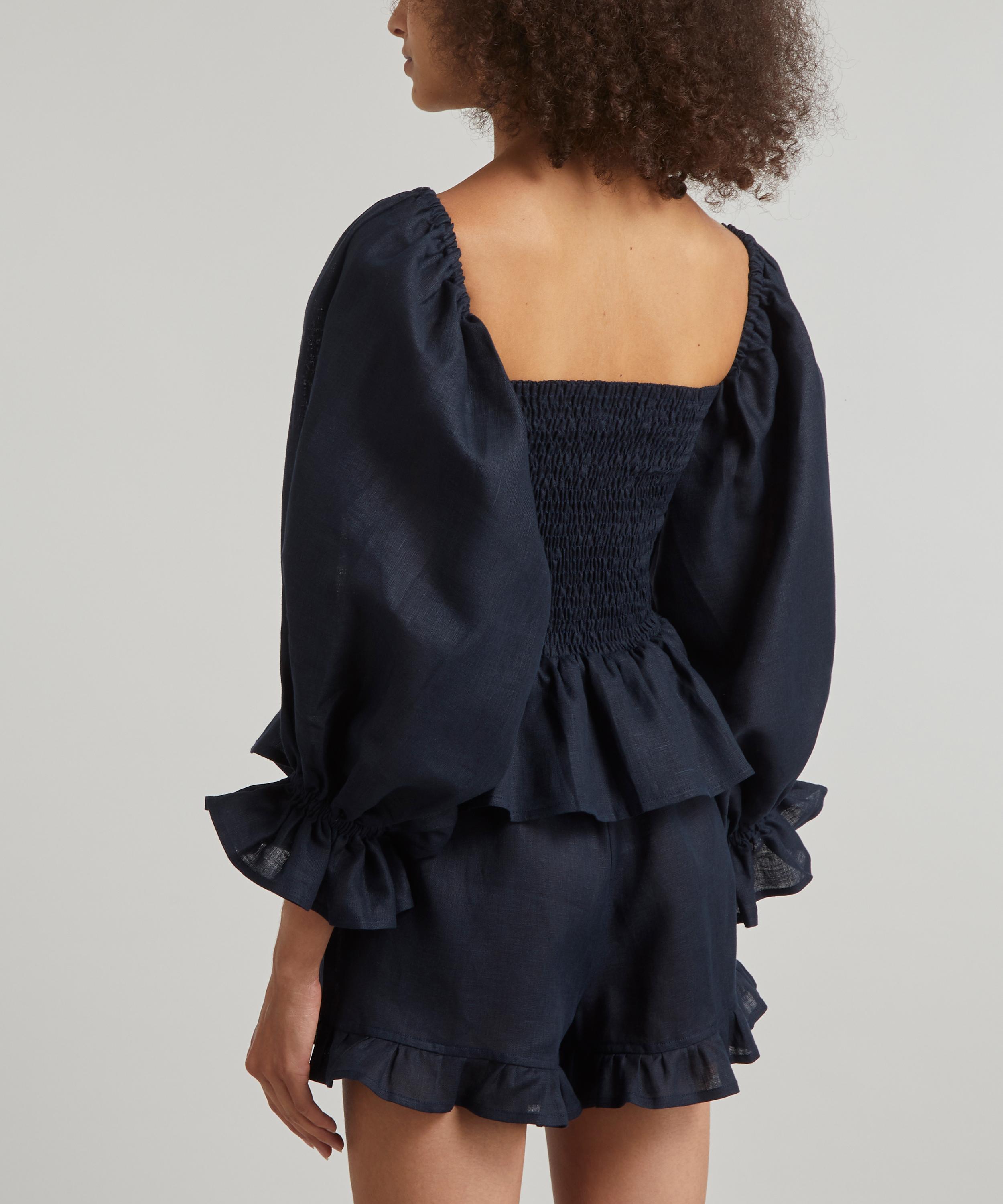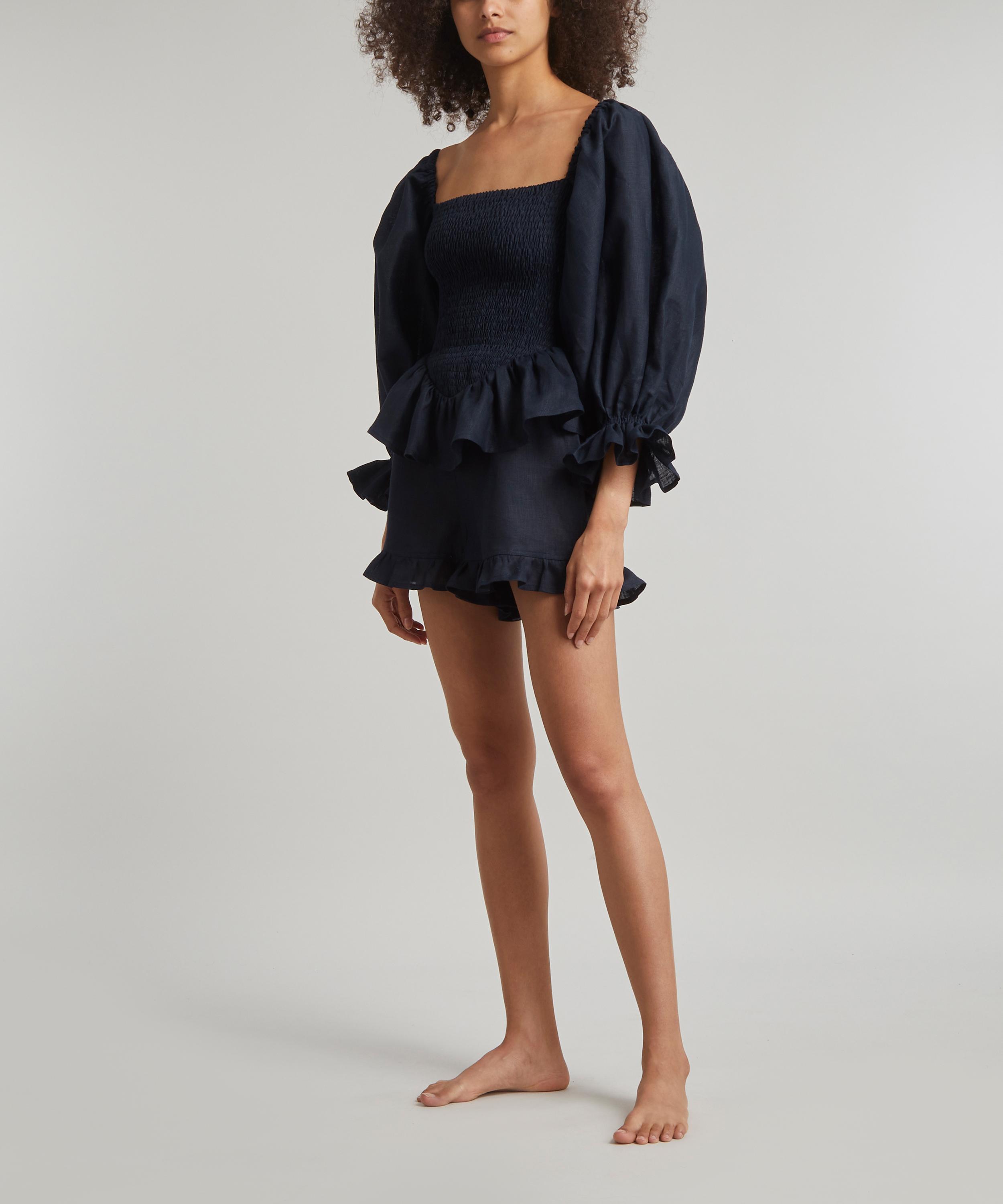 Crafted from ethically sourced linen, the Atlanta top and shorts set retains the beloved billowing sleeves and shirred bodice of Sleeper’s signature Atlanta dress, while the addition of ruffled shorts gives the two-piece a relaxed finish. Stylish and snug in equal measures, it has an elasticated waistband and shoulders for ultimate comfort and ease.