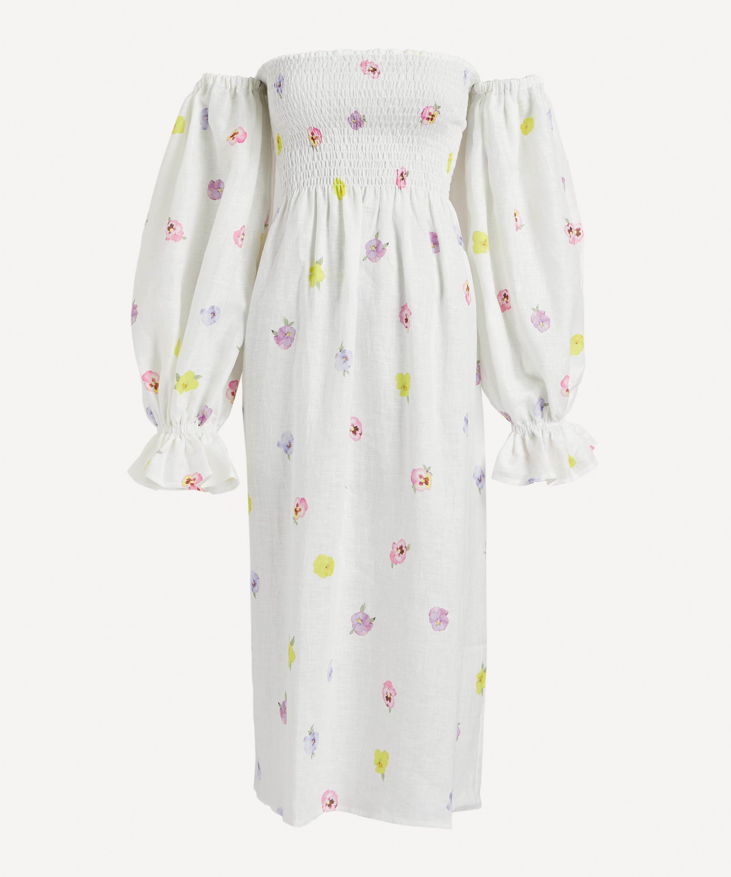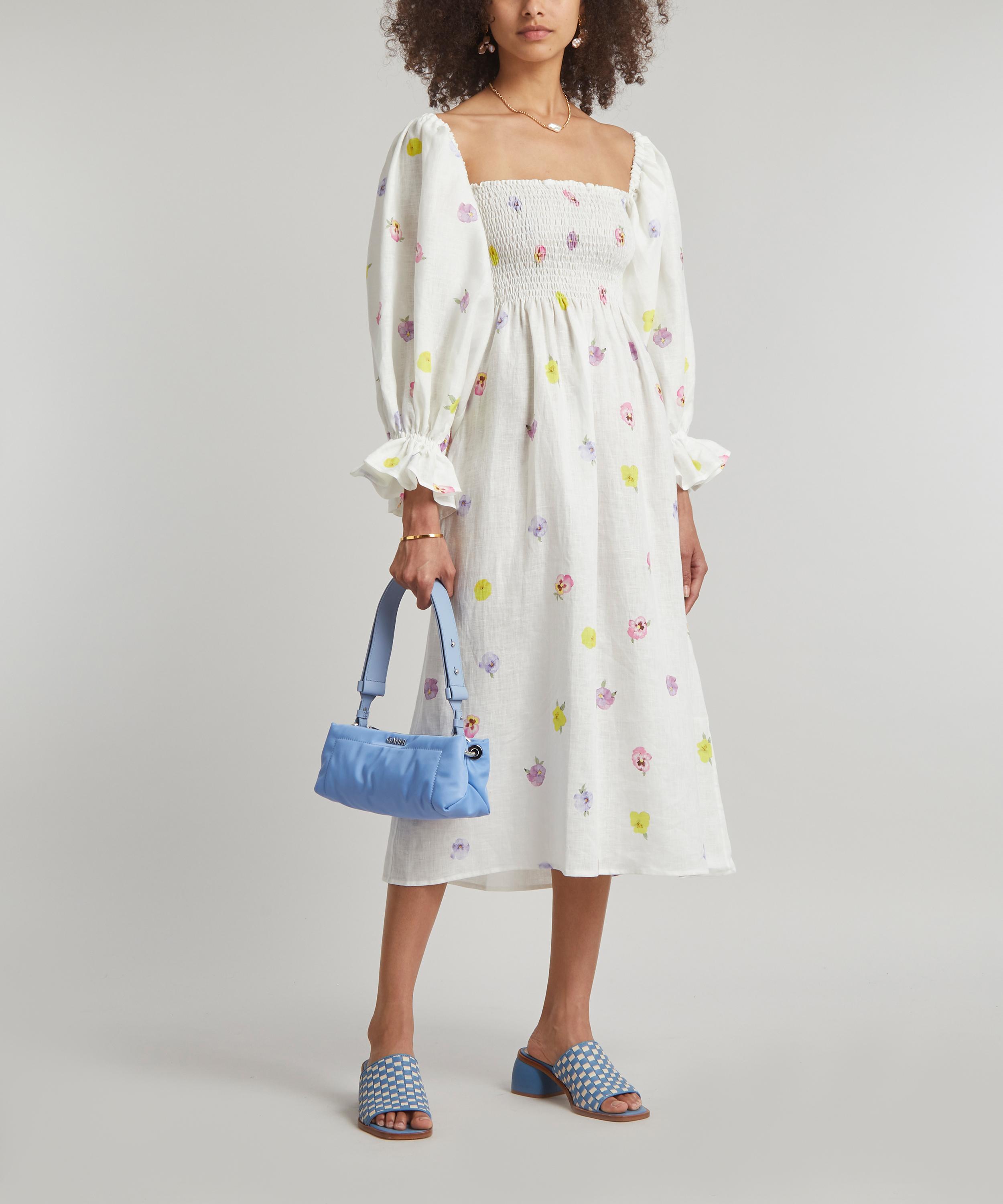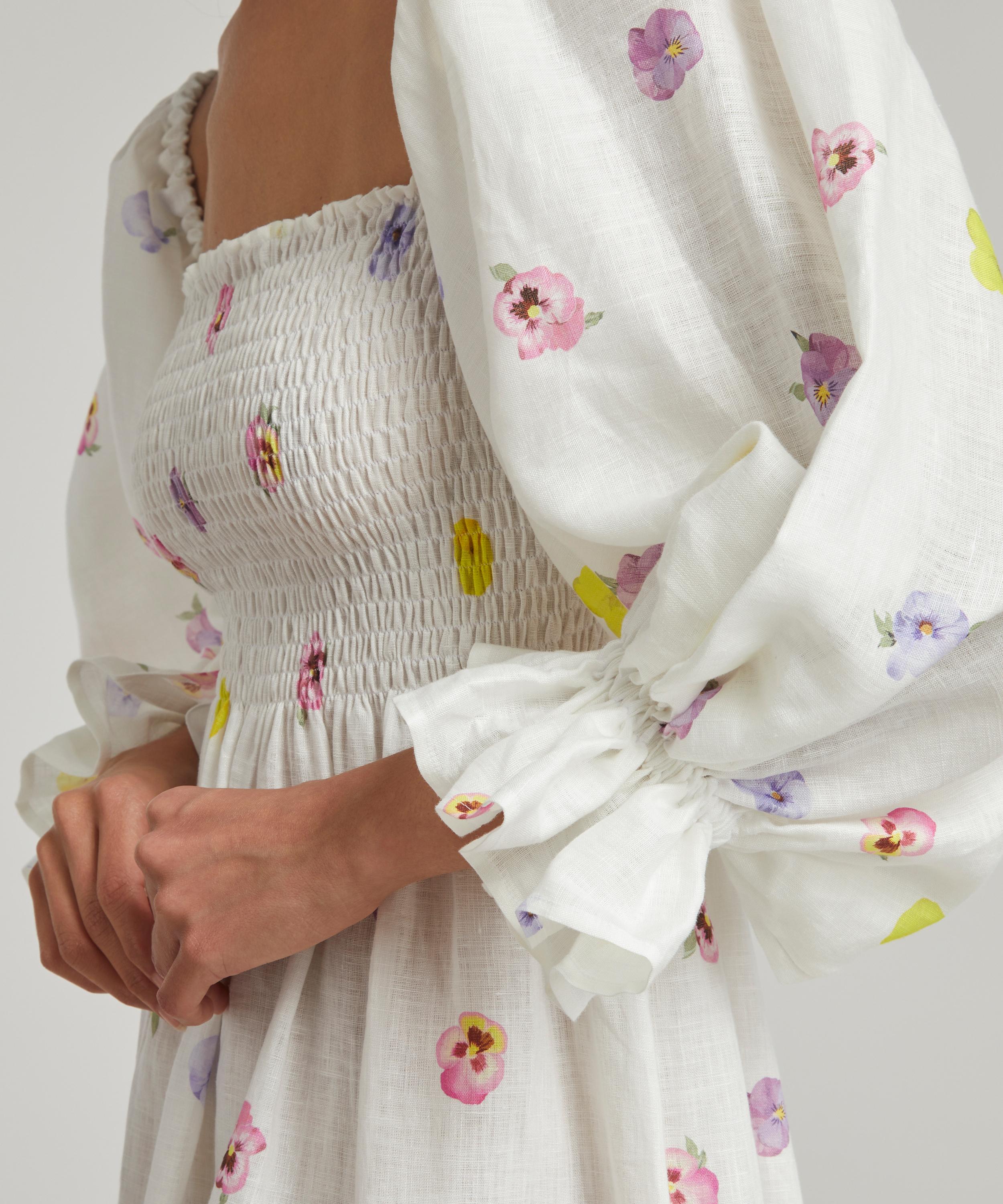 Crafted from ethically sourced linen adorned all-over with a pretty pansy-flower print, this joyful gown has dramatic puff-sleeves that can be worn on or off the shoulders. The smocked bodice and ruffled cuffs reference detailing found on vintage pieces – pair it with pastel-blue mules and a matching baguette bag for an elegant look.