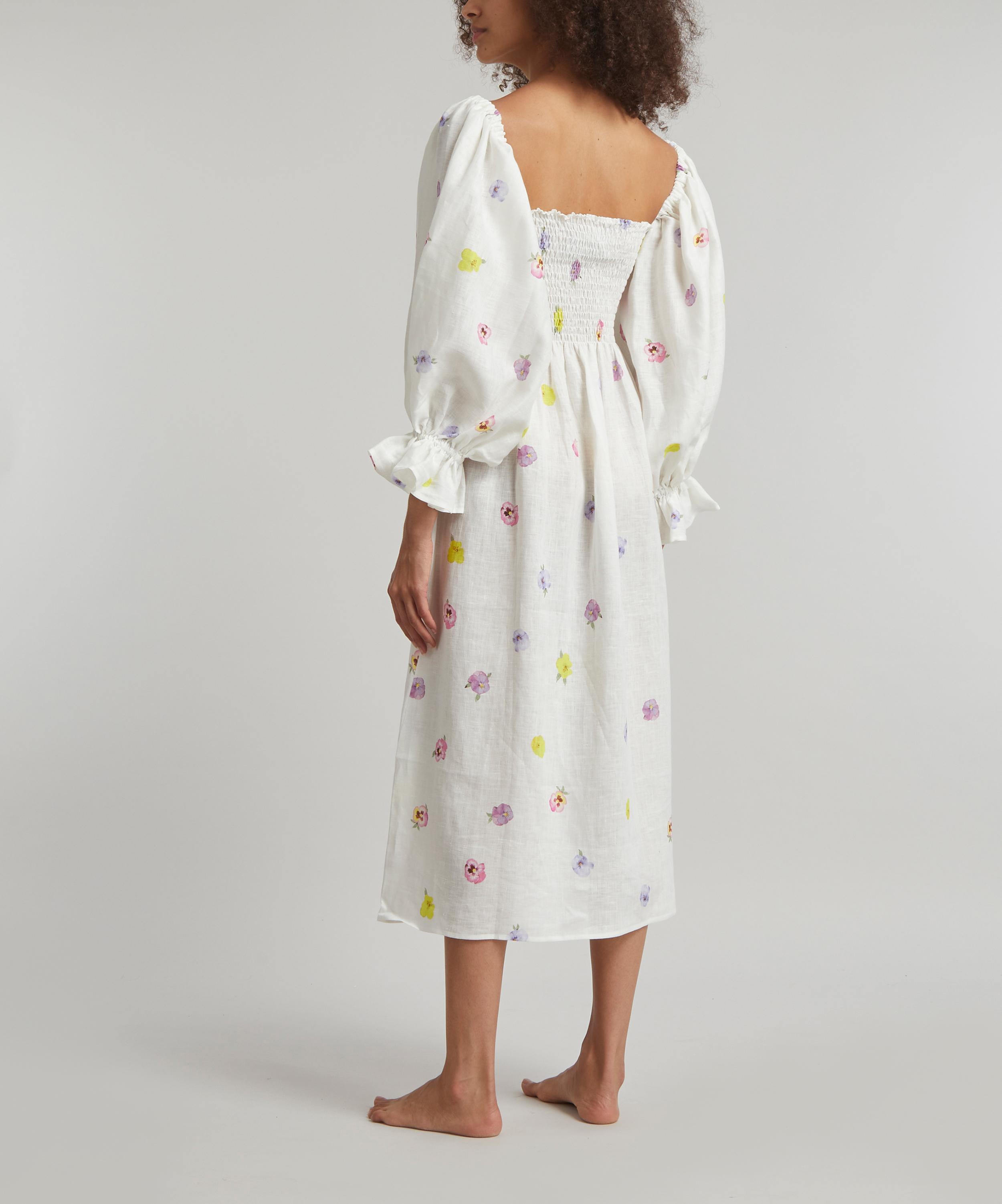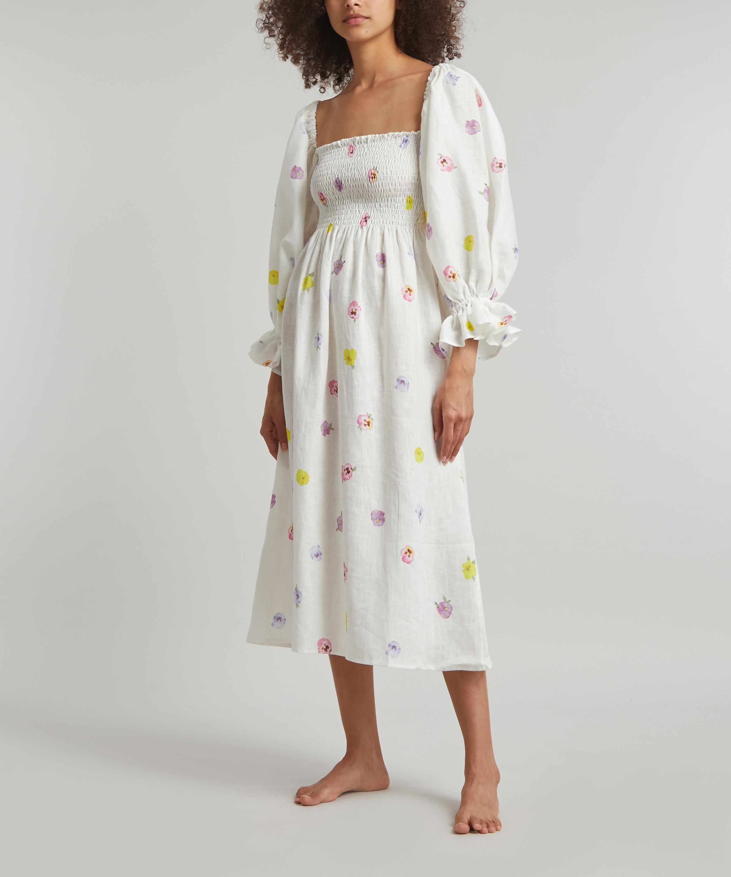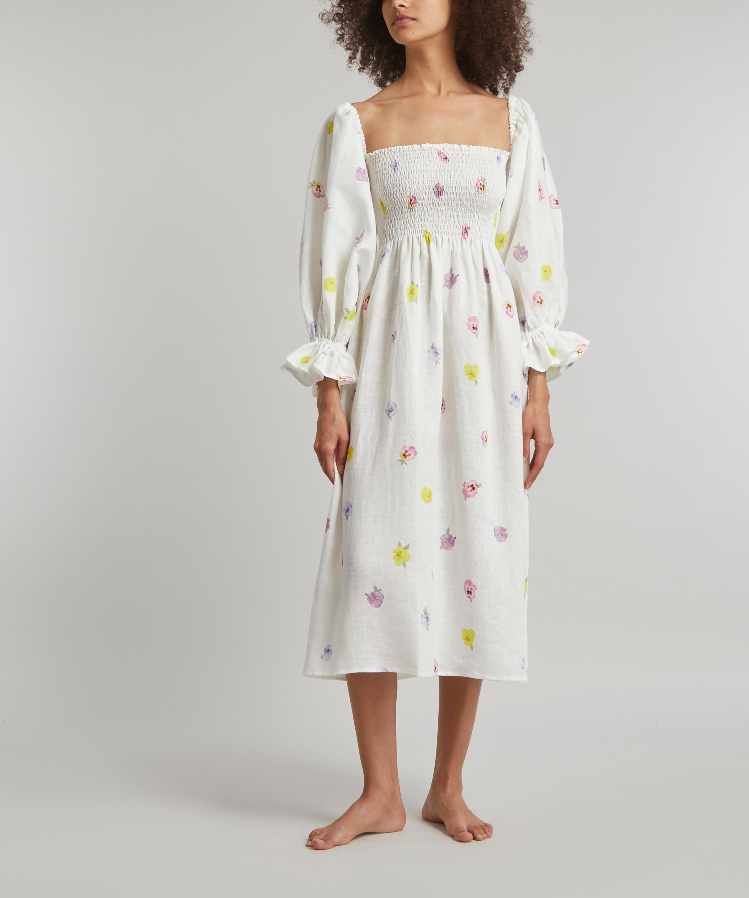 Crafted from ethically sourced linen adorned all-over with a pretty pansy-flower print, this joyful gown has dramatic puff-sleeves that can be worn on or off the shoulders. The smocked bodice and ruffled cuffs reference detailing found on vintage pieces – pair it with pastel-blue mules and a matching baguette bag for an elegant look.