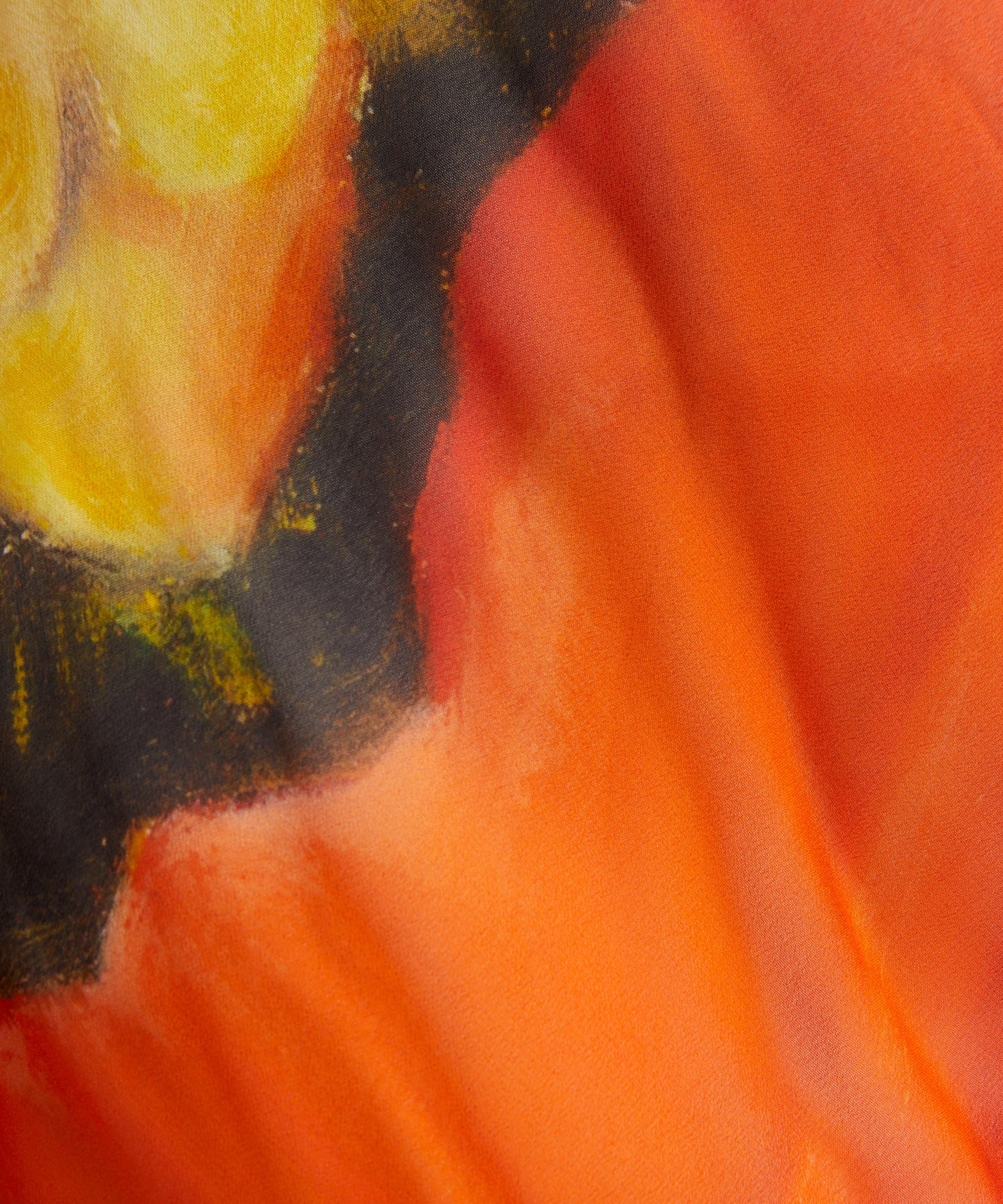 Adorned with painterly poppies, this maxi dress features an ankle-length, bias-cut silhouette in lightweight georgette. Semi-sheer sleeves, a fitted bodice, and flared hem create fluid movement, while an asymmetrical open back adds an architectural edge - ideal for formal or elevated evening wear.