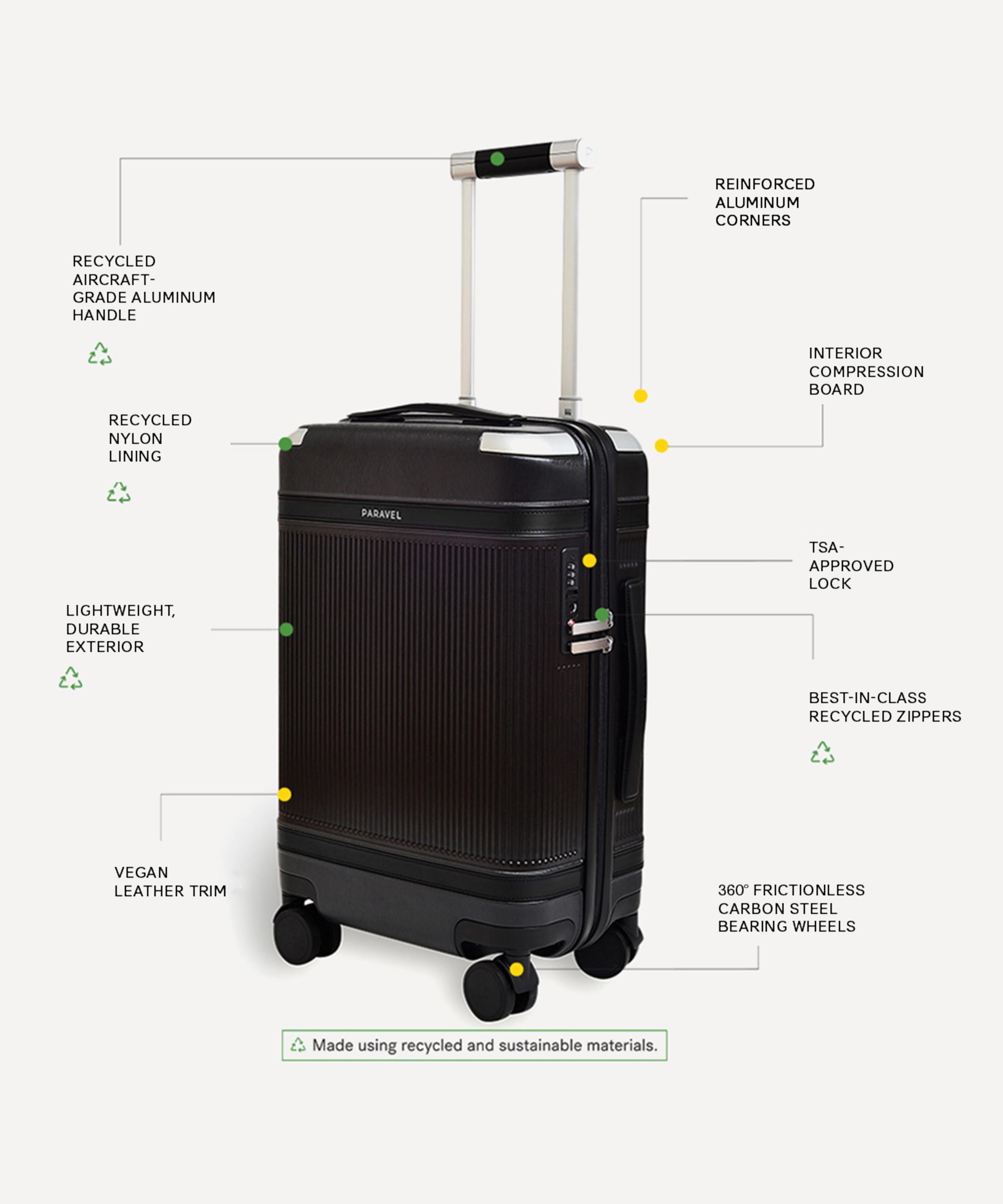 Leather accents and wrapped steel handles: Recycled Vegan Leather; Handle and corner protectors: Aluminium; Wheels: Carbon Steel
