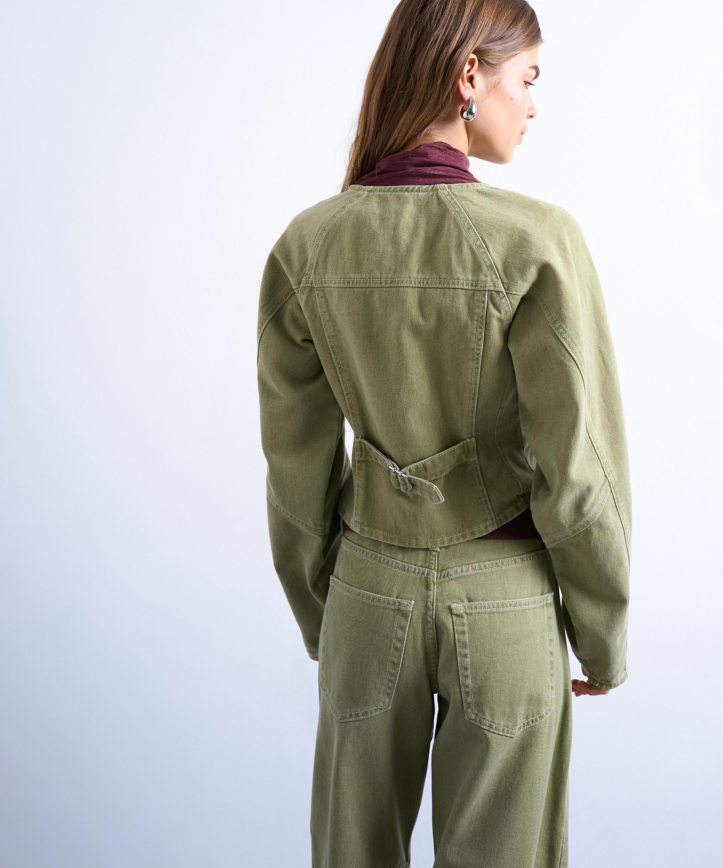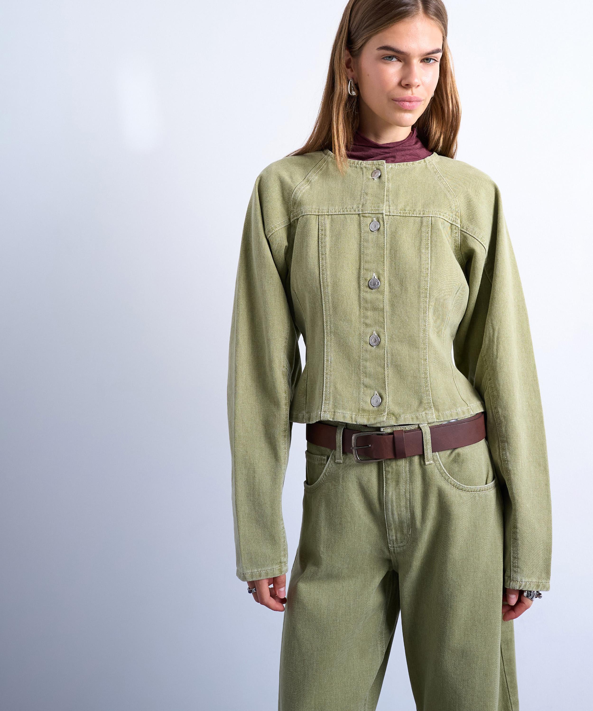 Crafted from denim in a washed avocado-green hue, this shirt is designed with a cinched waist and features a collarless round neckline, sculptural ovoid sleeves, and a front button fastening for a modern take on a classic staple.