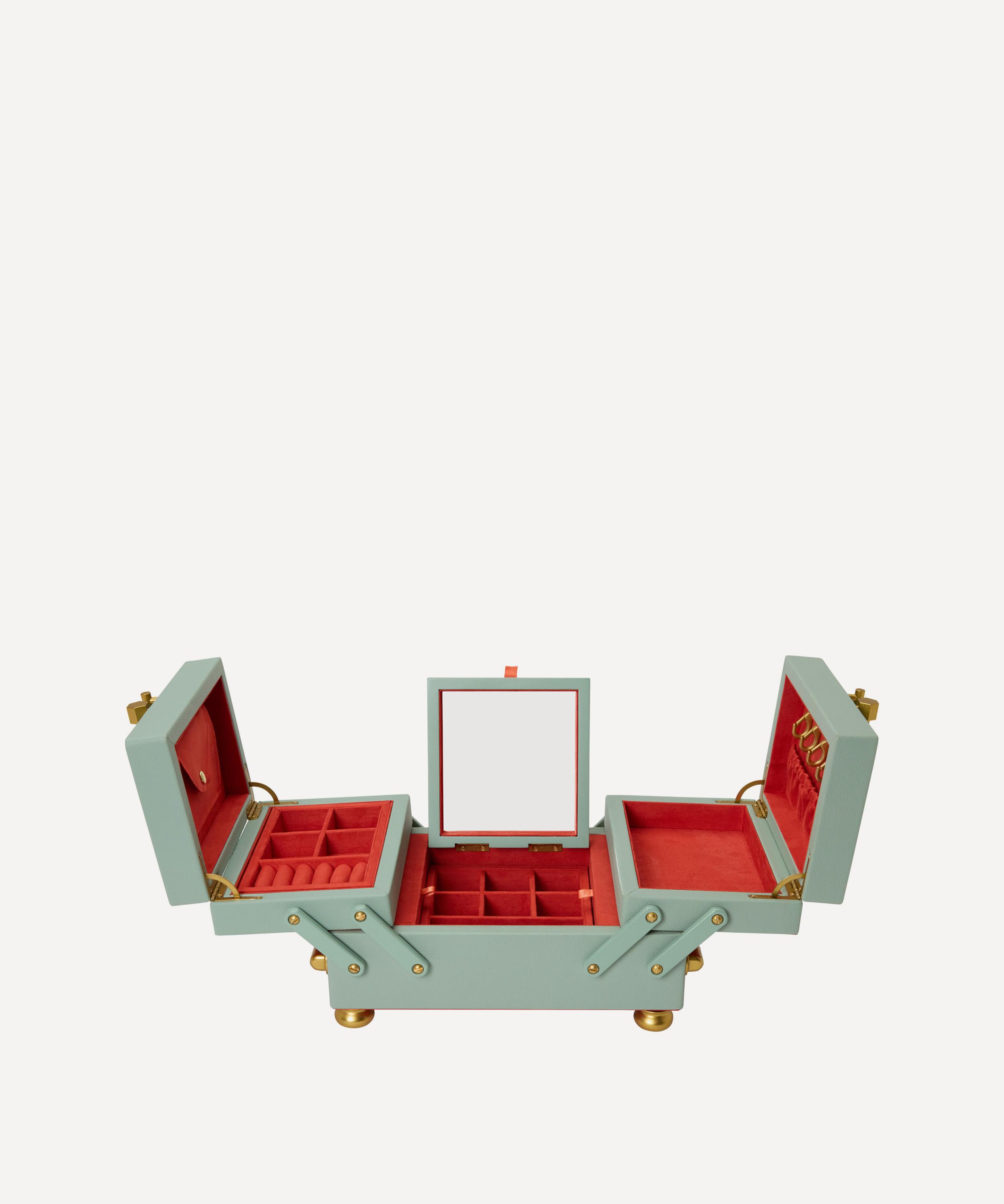 Crafted in faux leather, it’s a feat of precision engineering with carry handles on either side and two removable trays that you can fill and store either inside or outside the box. It opens and closes with a satisfying tactility due to the brand’s signature lock mechanism – inside you’ll find a wall of brass hooks that are perfect for hanging chains and necklaces, an envelope pocket for important papers, two secret compartments and a mirror. Whether used for housing letters and meaningful mementos or your favourite jewellery pieces, it holds space – both literal and symbolic – for the stories we choose to carry.