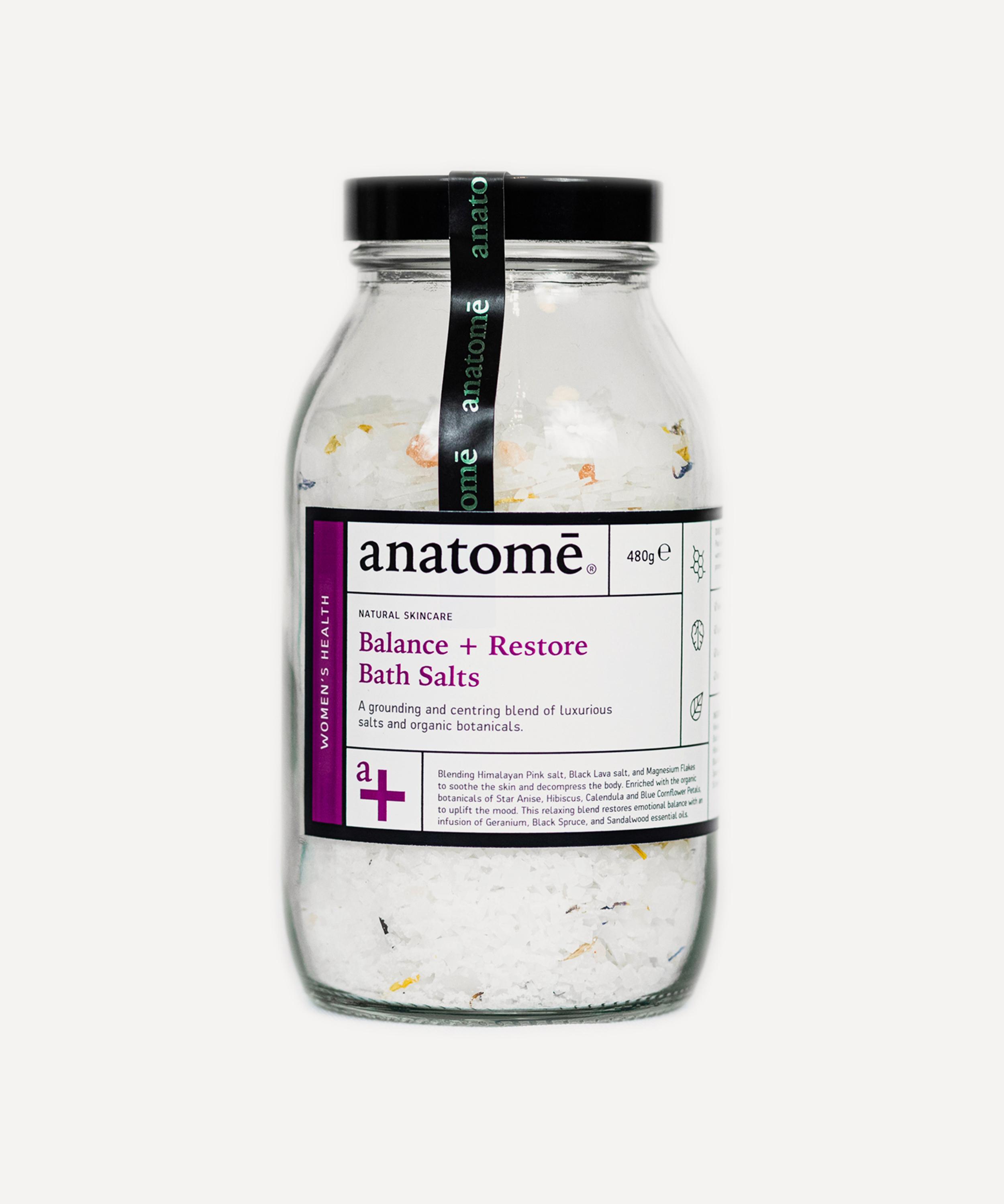 The luxurious Balance + Restore Bath Salts from wellness experts anatomē are the perfect addition to your bathing routine, calming the mind and relaxing the body.