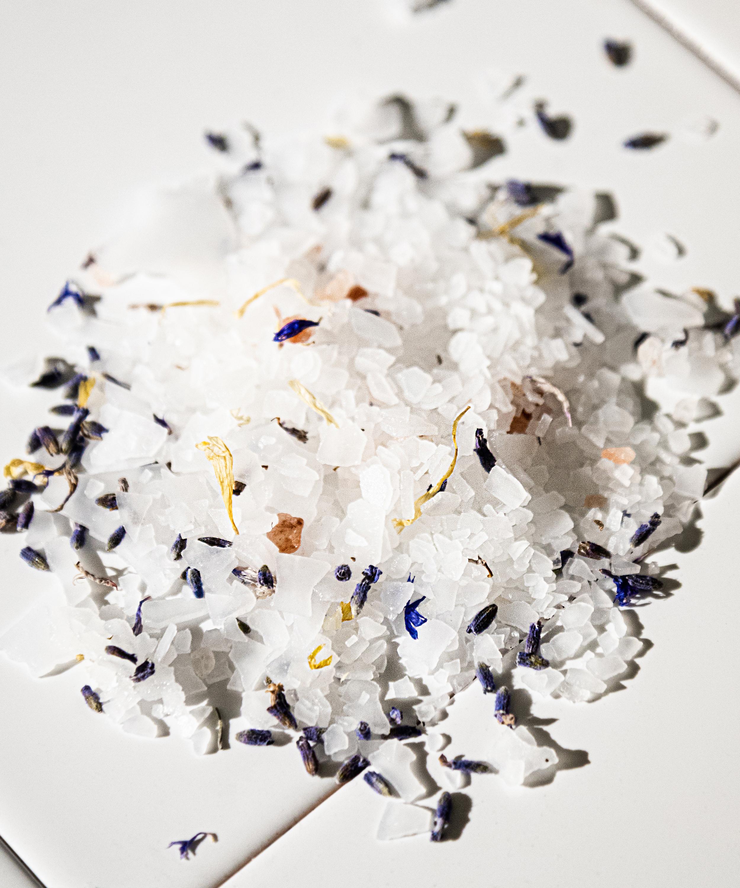 Himalayan Pink Salt, Magnesium Flakes, Black Lava Hawaiian Sea Salt, Star Anise, Hibiscus Blossoms, Calendula Petals, Blue Cornflower Petals, Black Spruce, Geranium Bourbon, Sandalwood and St John’s Wort.