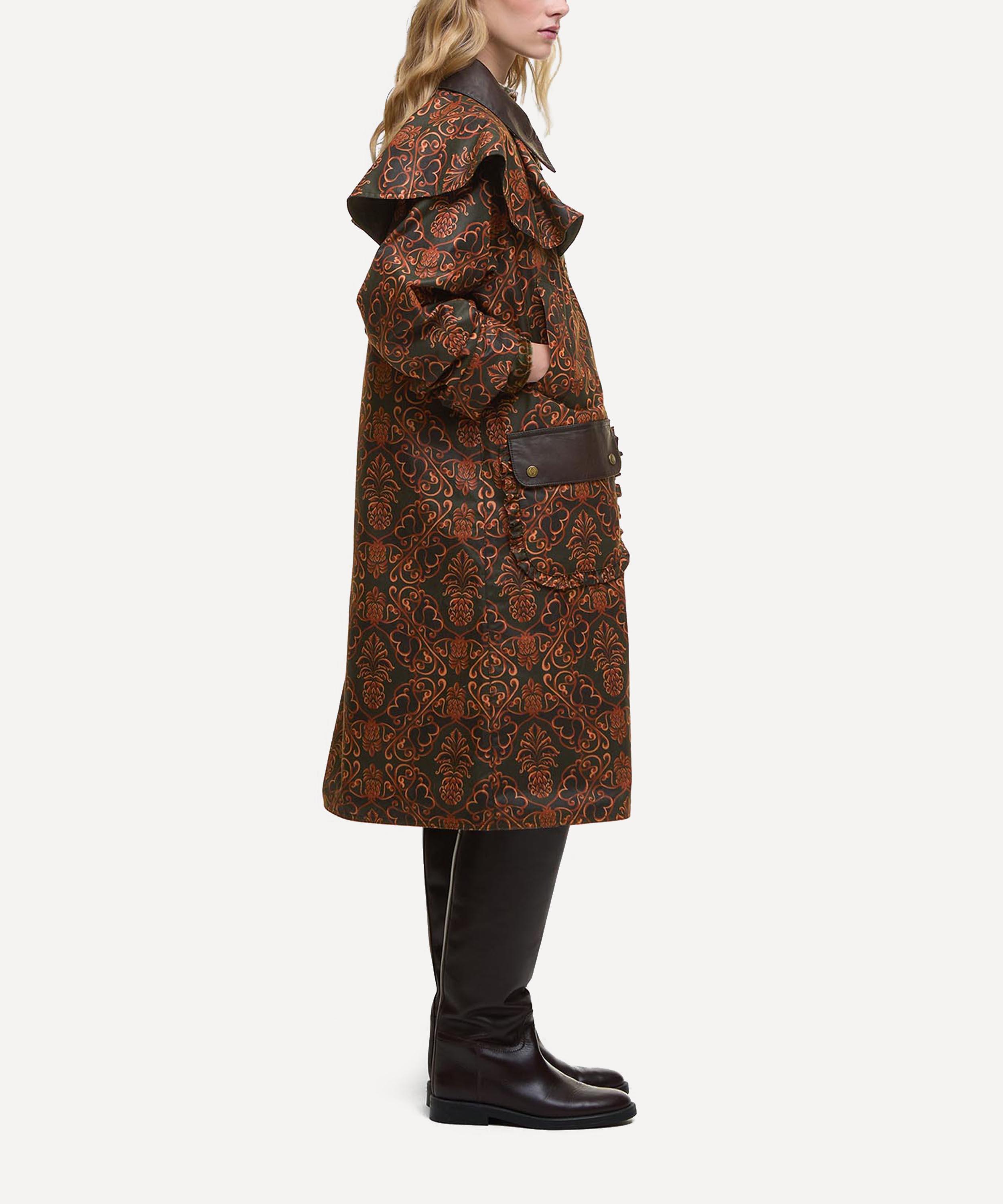 The Barbour x FARM Rio Luana Waxed Jacket showcases the exclusive Barbour x FARM Rio Pineapple print for a statement look. This longline waxed jacket doesn't just stop there - exaggerated frills and faux-leather trims to the collar and pocket flaps give it a premium finishing touch. Complete with dual-branded hardware, this bold style captures FARM Rio's effortless Brazilian charm with ease.