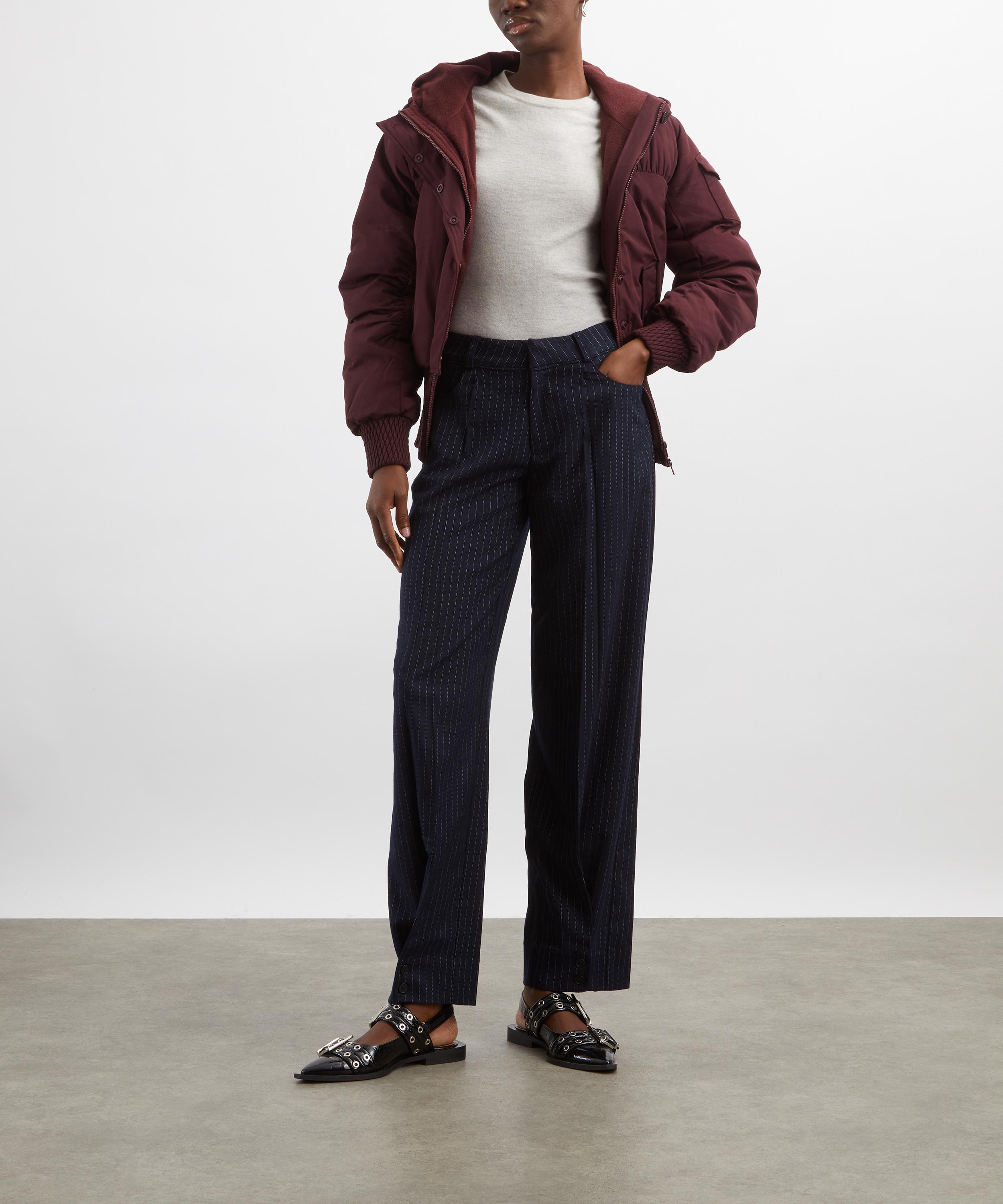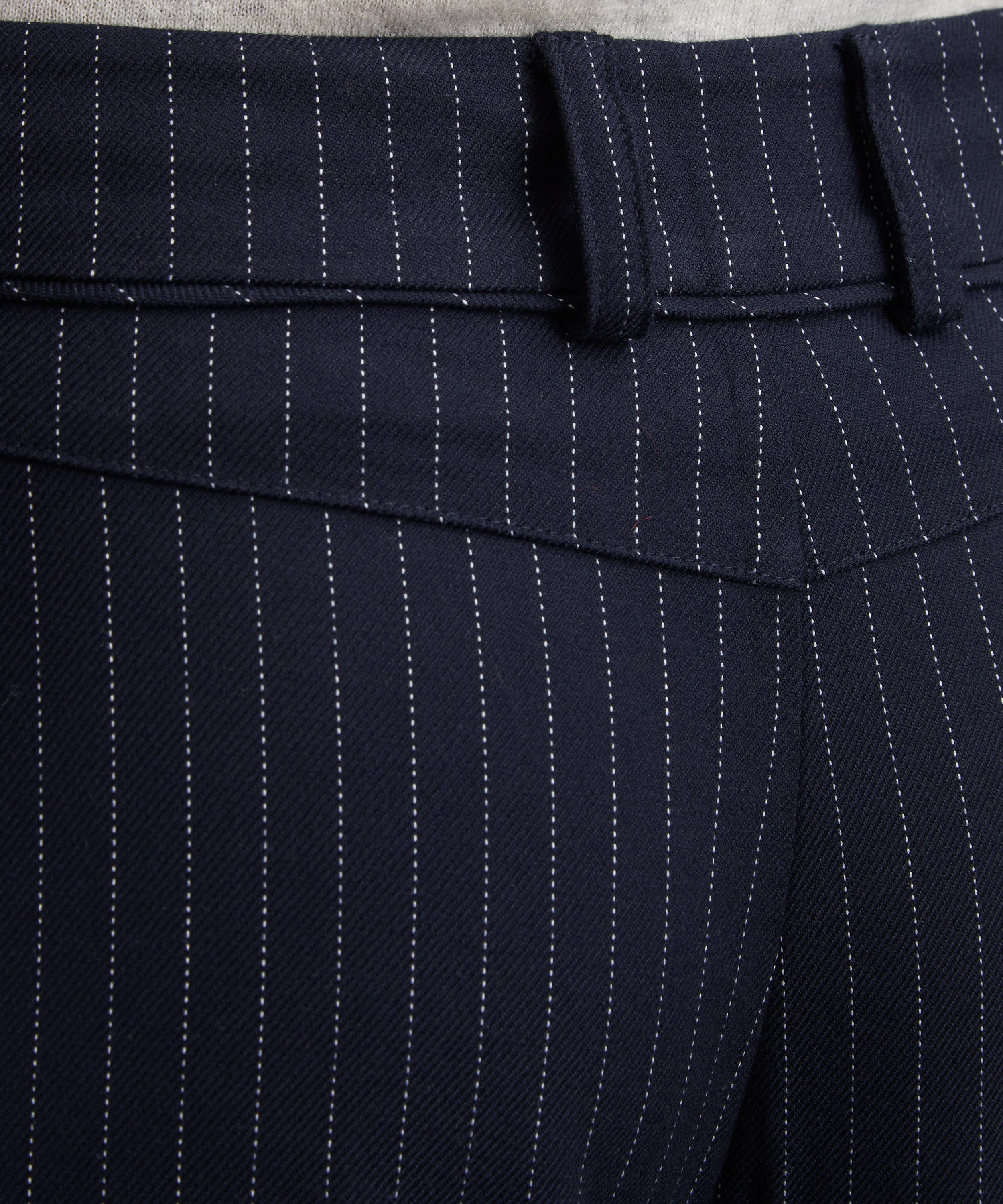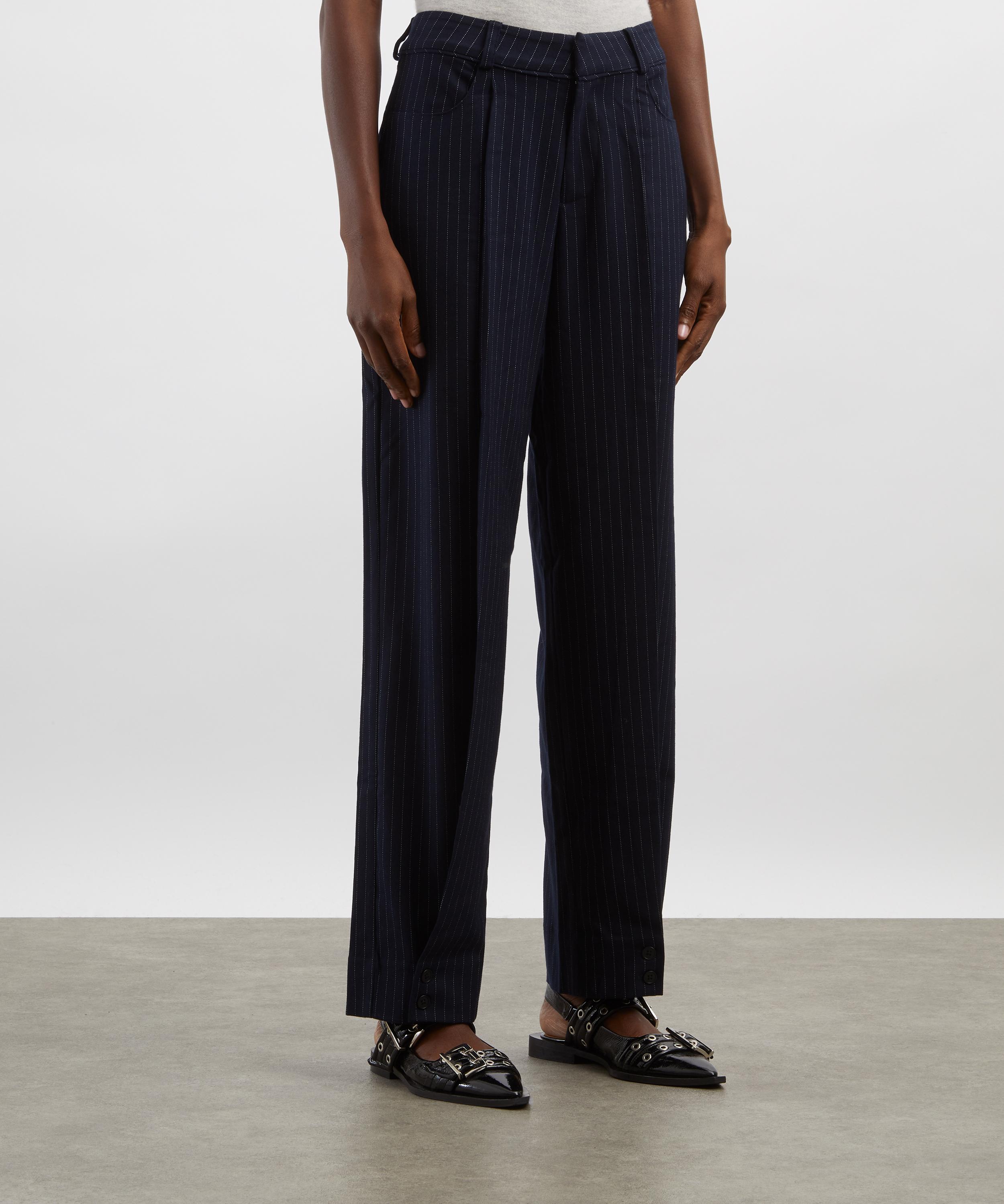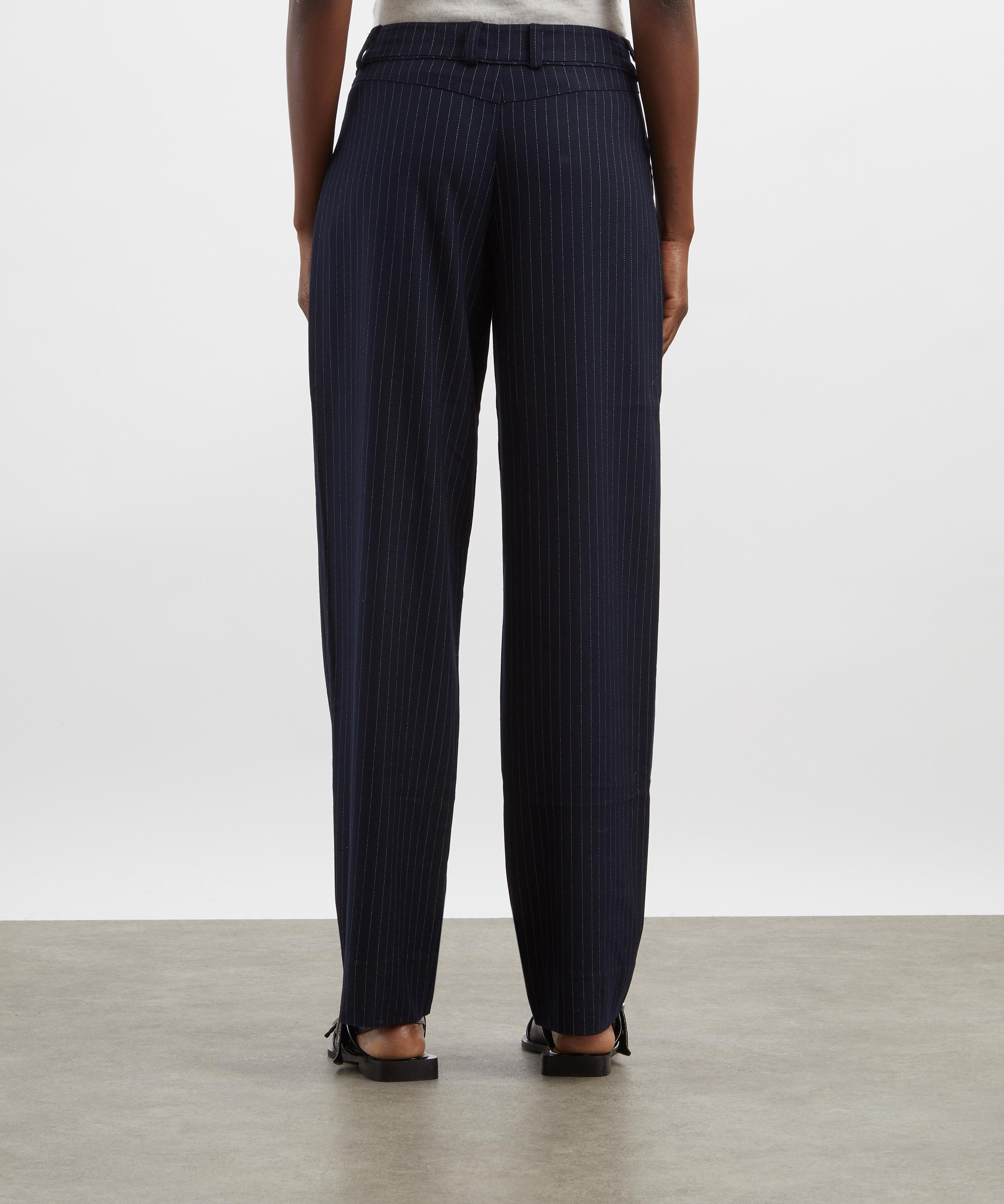 Crafted from tailored suiting fabric with a subtle navy pinstripe, the Bardot trousers feature a relaxed wide leg that sits low on the hips, creating an effortlessly laid-back silhouette. Minimalist in detail, they fasten with a concealed hook-and-eye closure.
