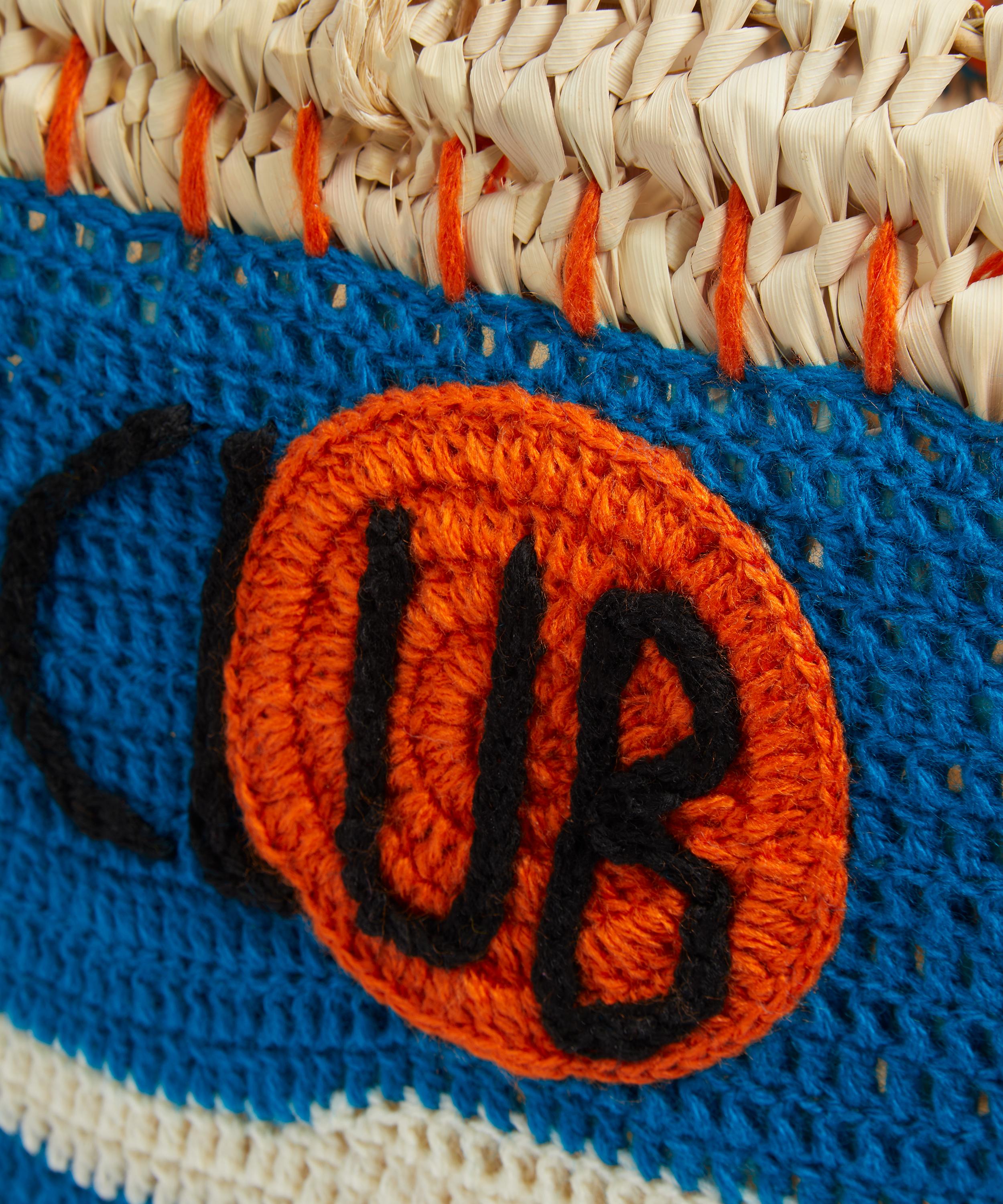 Made using time-honoured, traditional techniques cherished in Moroccan artisanship, this meticulously hand-woven palm straw bag features a colourful design, complete with text stitched across the front and two short top handles – ideal for enhancing your everyday look on trips to the market, city strolls, or balmy beach days.