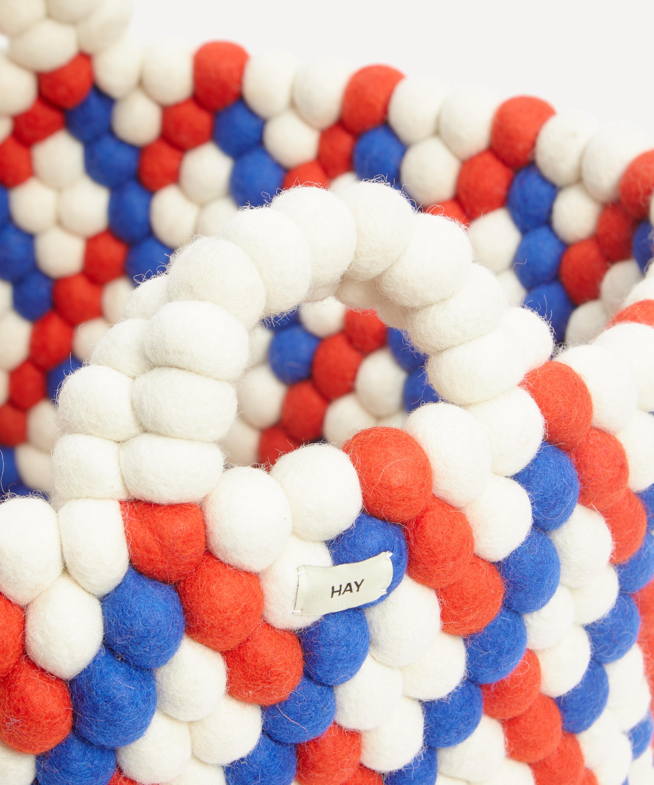 Meticulously crafted from hundreds of felt balls that are individually hand rolled into vibrant graphic patterns, these baskets are a contemporary storage solution for eclectic interiors.