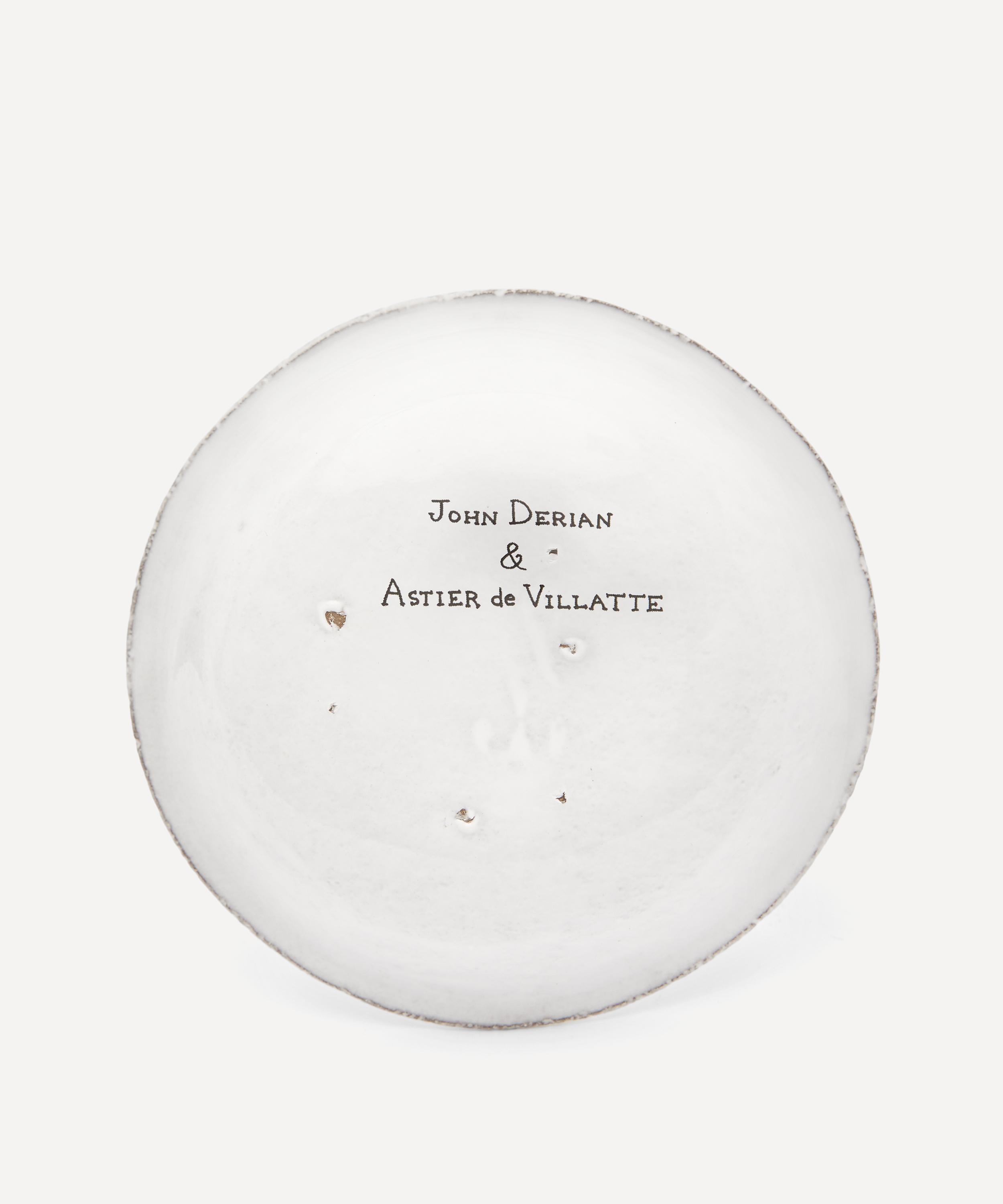Votary of pre-industrial fabrication, Astier de Villatte is celebrated for being the one and only studio in Paris to hold and harbour the traditions of artisanal ceramic production. Restoring the ancestral systems of moulding and stamping, the Beetle saucer is made using techniques from the Middle Ages which involve moulding a sheet of handmade clay, double firing the ‘biscuit’ piece and glazing the product in white enamel – a lengthy process that requires a drying time of up to one month. Characterised by John Derian’s beetle découpage, the saucer is engraved with the brand’s signature crest - depicting an interlacing A & V - alongside the collaborator's name in block captials. Each handmade piece tells a beautiful story, it romances and imparts a sense of nostalgia into its owner. Pair with other saucers from the John Derian collection for a coordinated decorative approach.