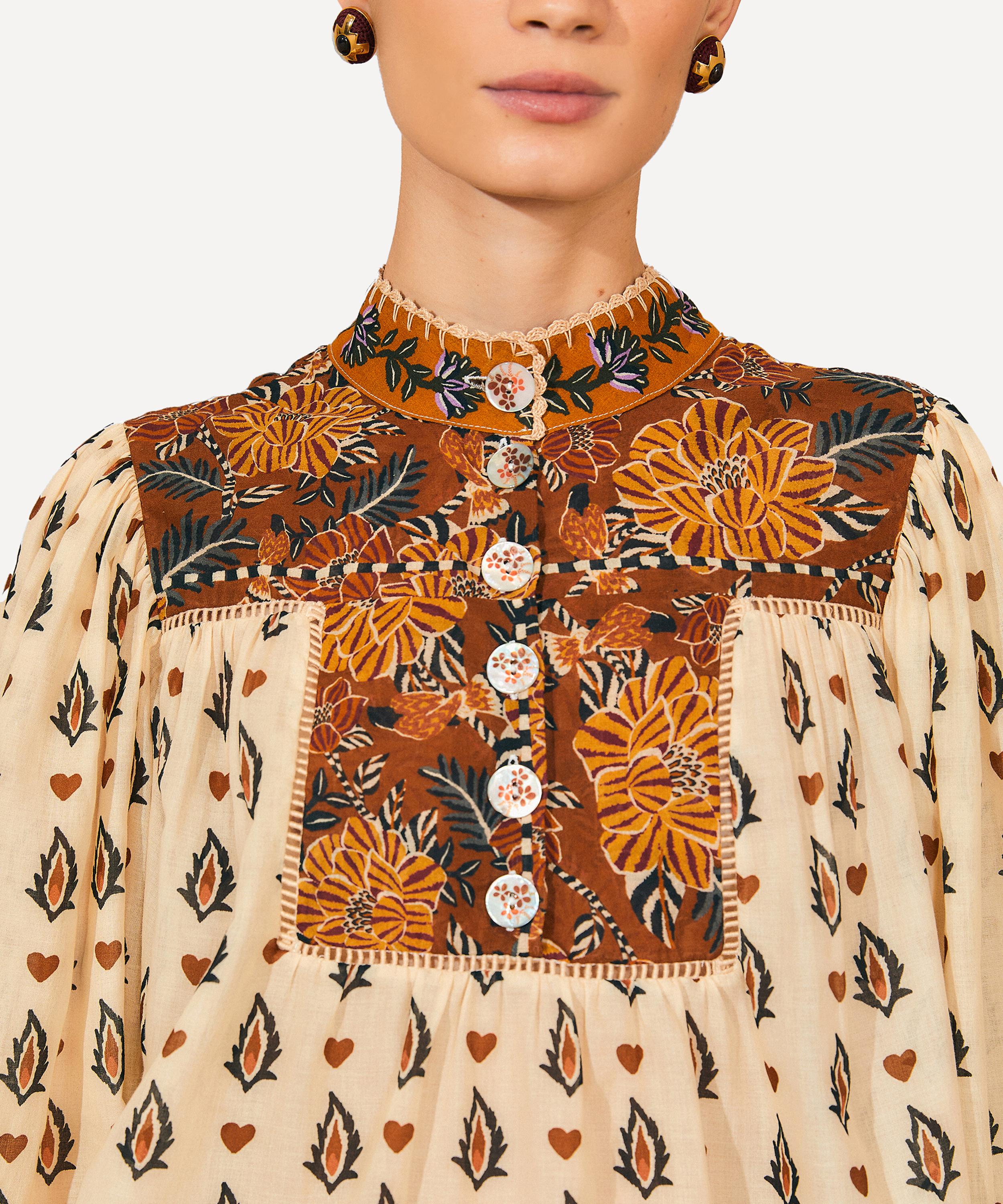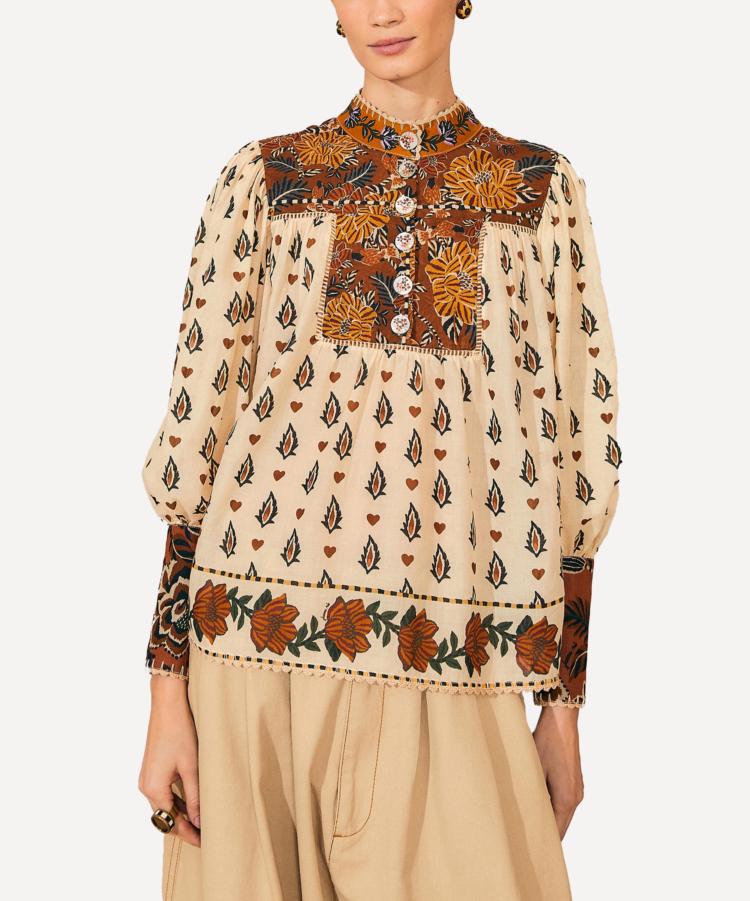 Adorned all-over in the bold and blooming Beige Ainika Flora print, this statement blouse is elevated by its earthy-toned, floral patterned yoke and cuffs. Breezy and easy-to-wear it has long puff sleeves and a banded collar, complete with a half-buttoned placket.