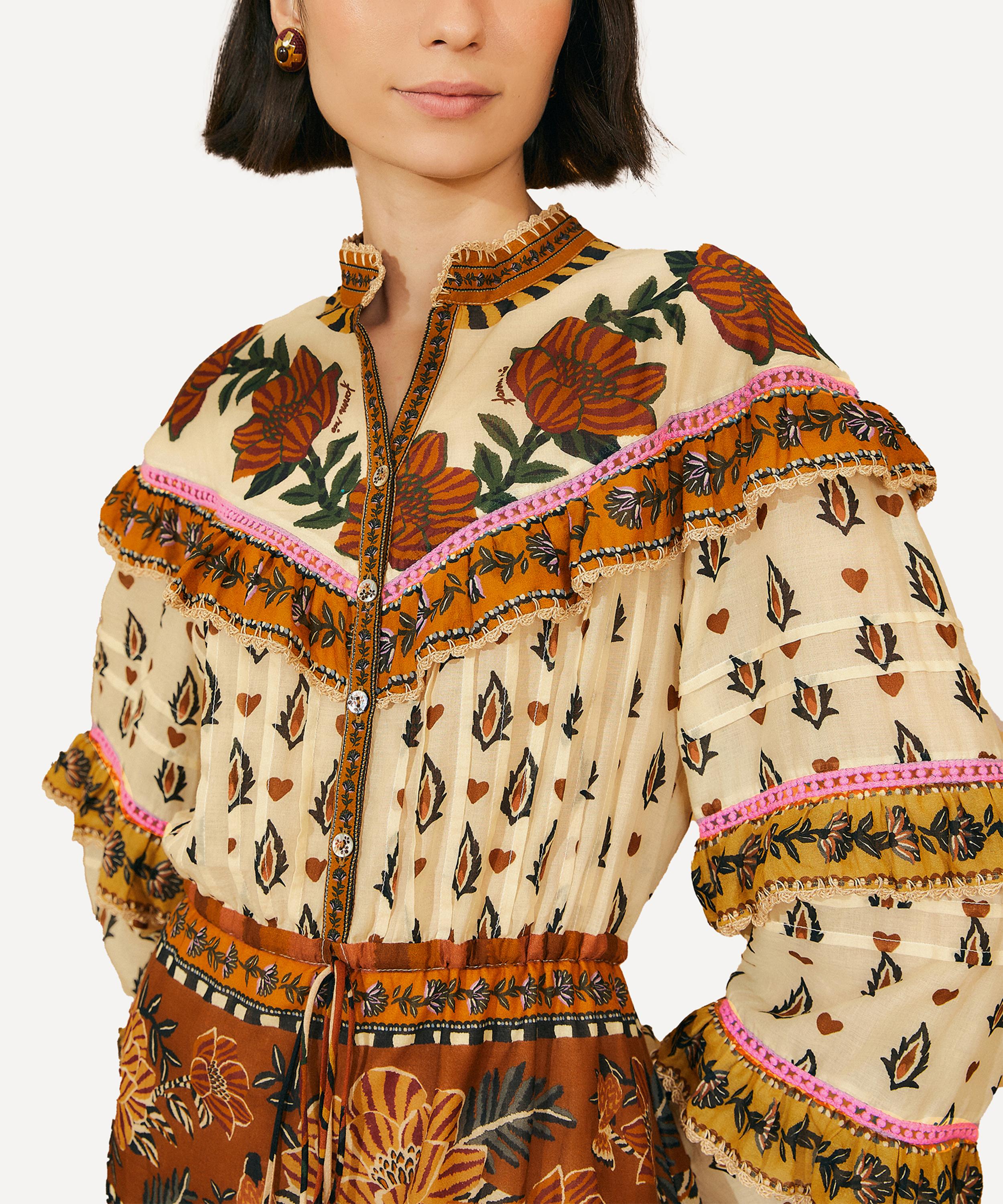 Bold and blooming with a medley of mixed floral prints and flouncy ruffle trims, this playful mini-dress is breezy and easy-to-wear with its built-in shirt and skirt design featuring a banded collar, long puff sleeves and a drawstring waist complete with beaded tassel ties.
