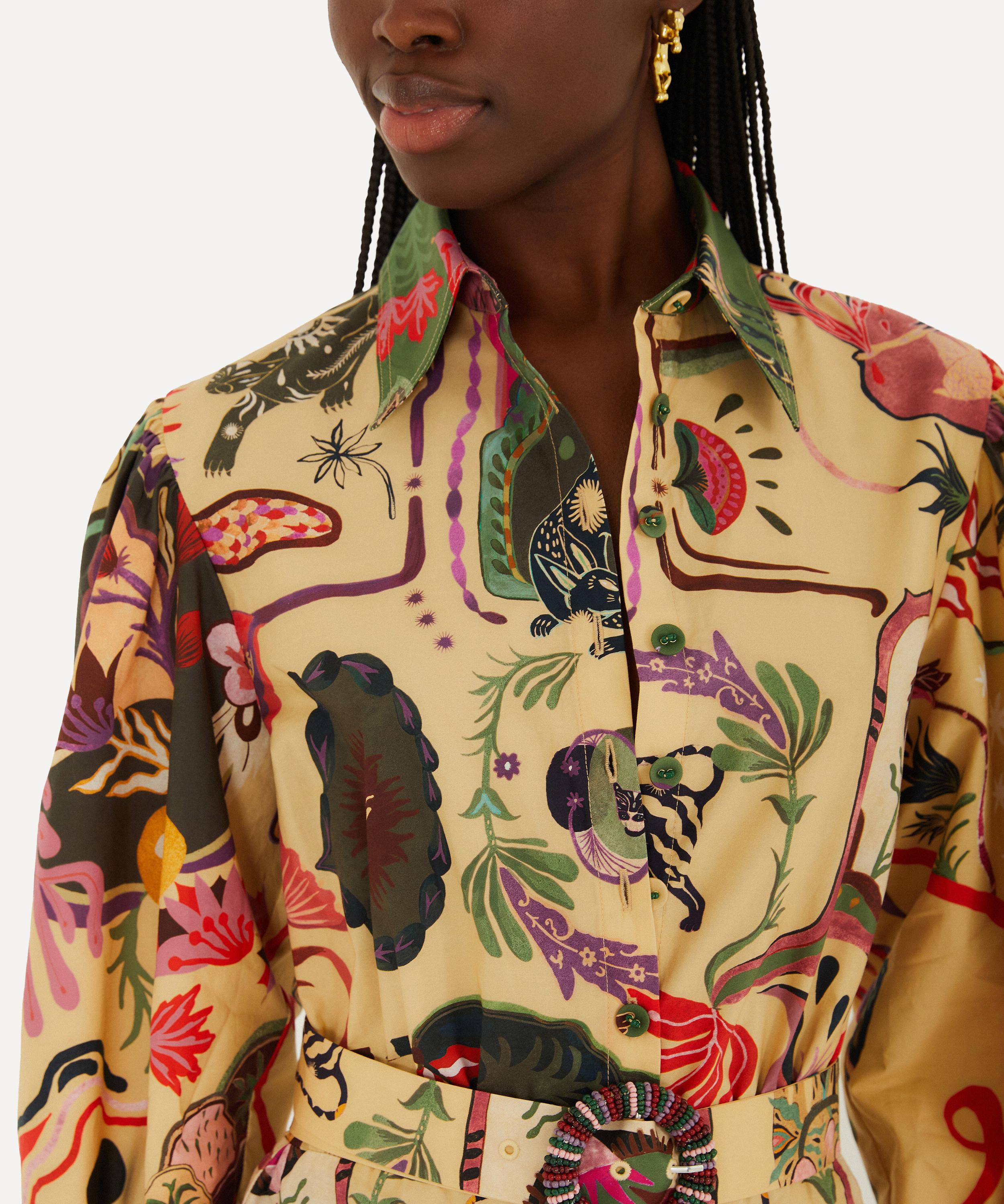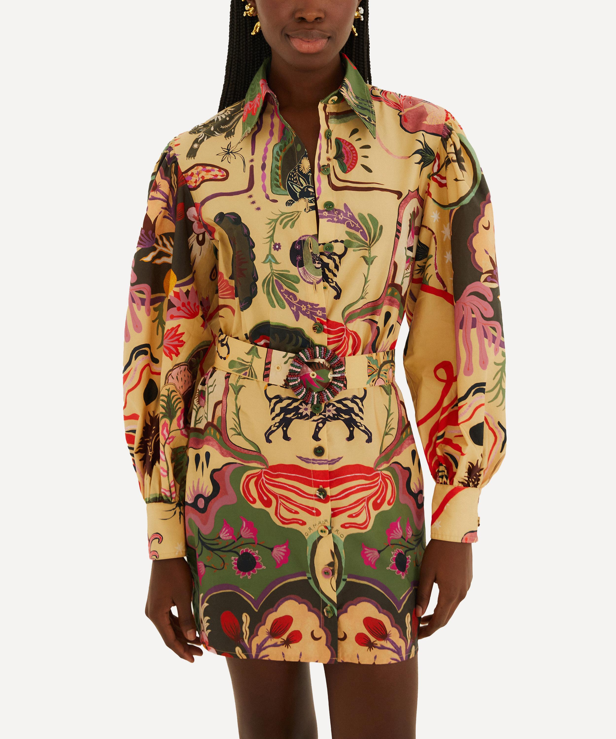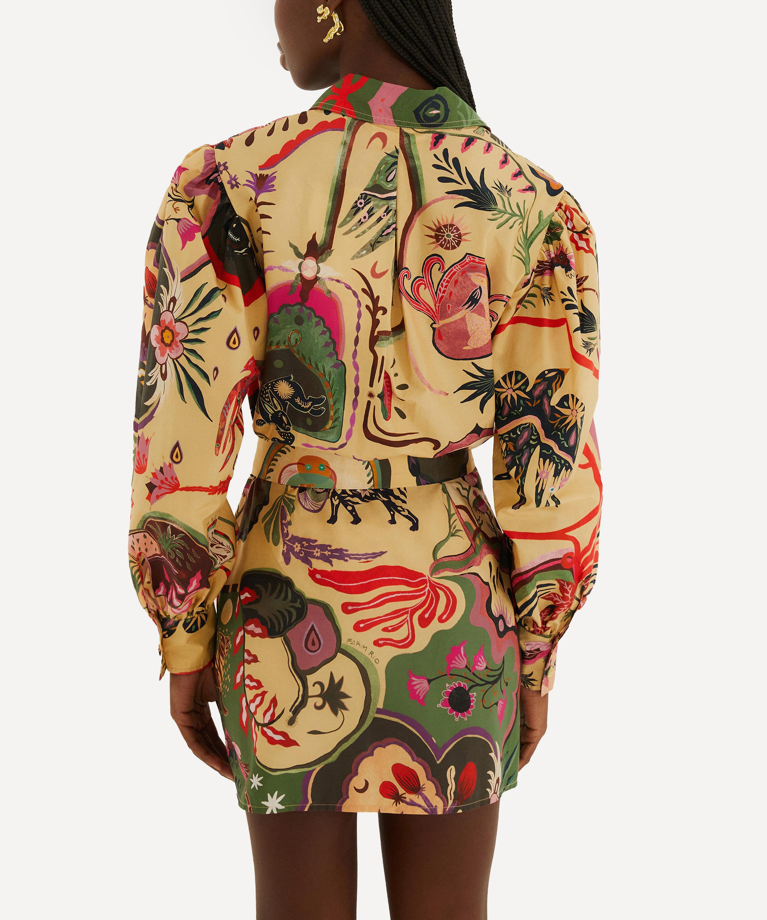 Crafted from breezy cotton, the Beige Artsy Surreal Land Beaded Belt Mini Dress by FARM Rio features a soft beige base with vibrant surreal motifs, a structured collar, and a beaded belt for a flattering, breathable silhouette.