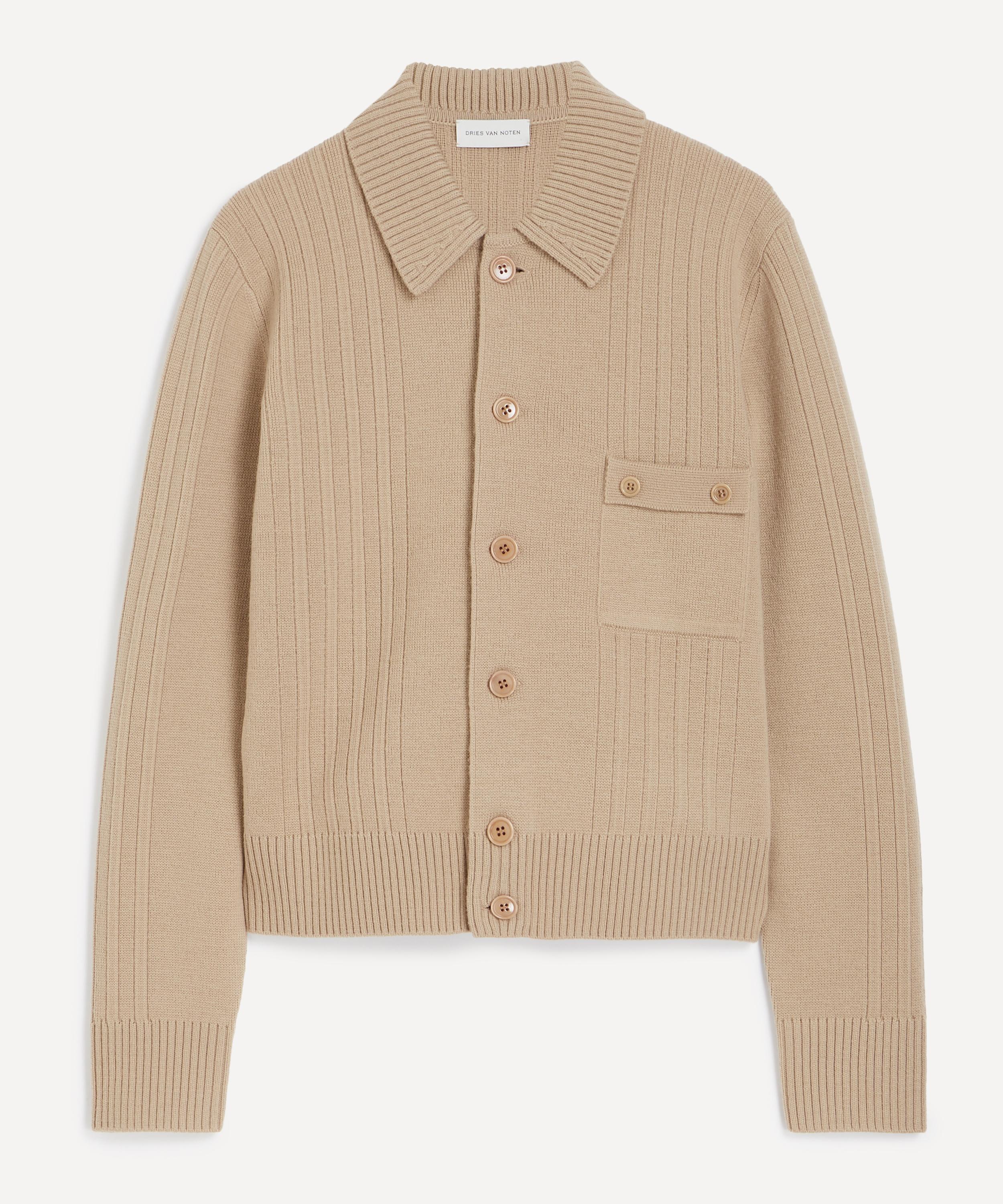 This Beige Ribbed Wool Cardigan from Dries Van Noten exemplifies the Belgian label’s avant-garde approach to contemporary fashion.