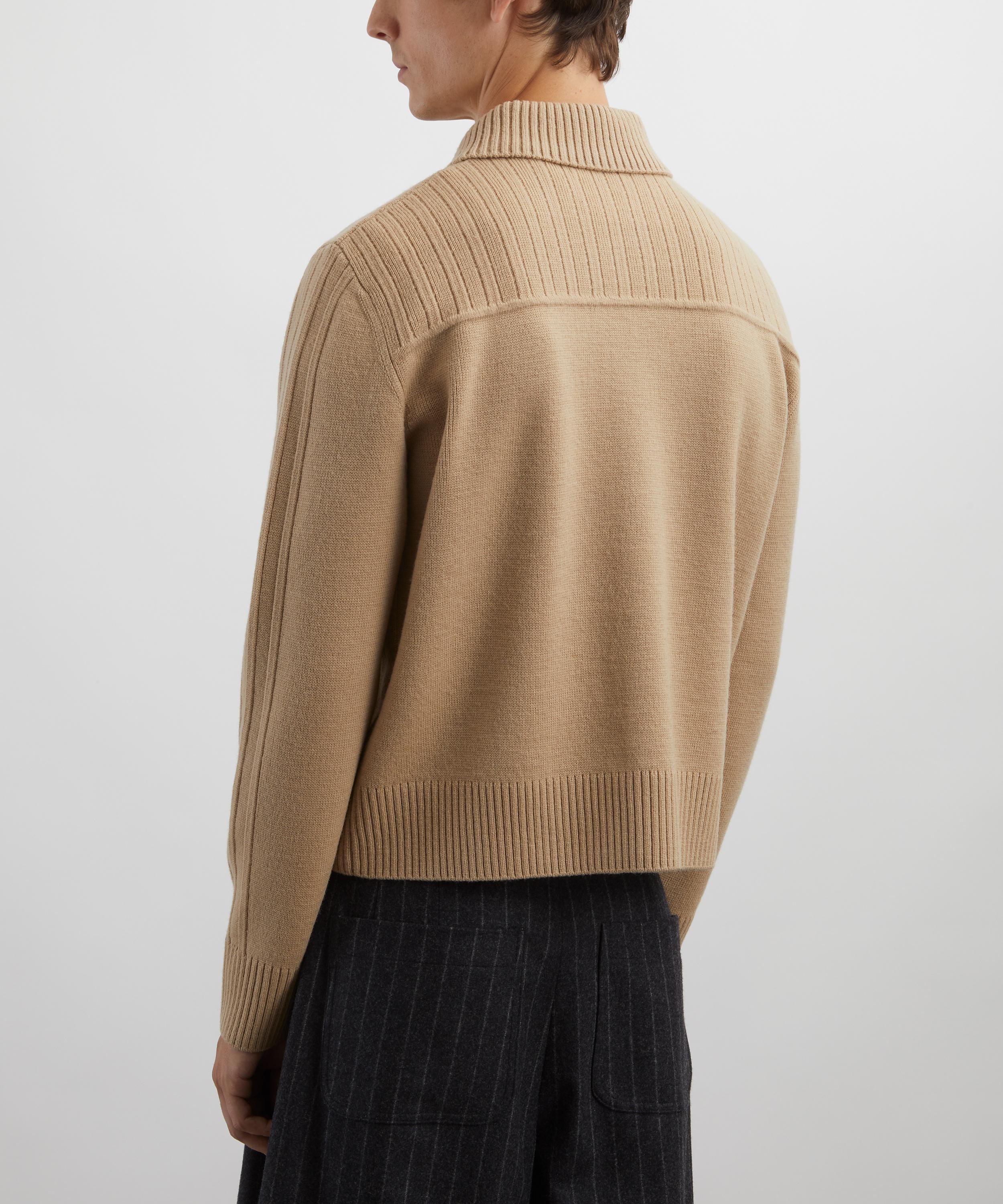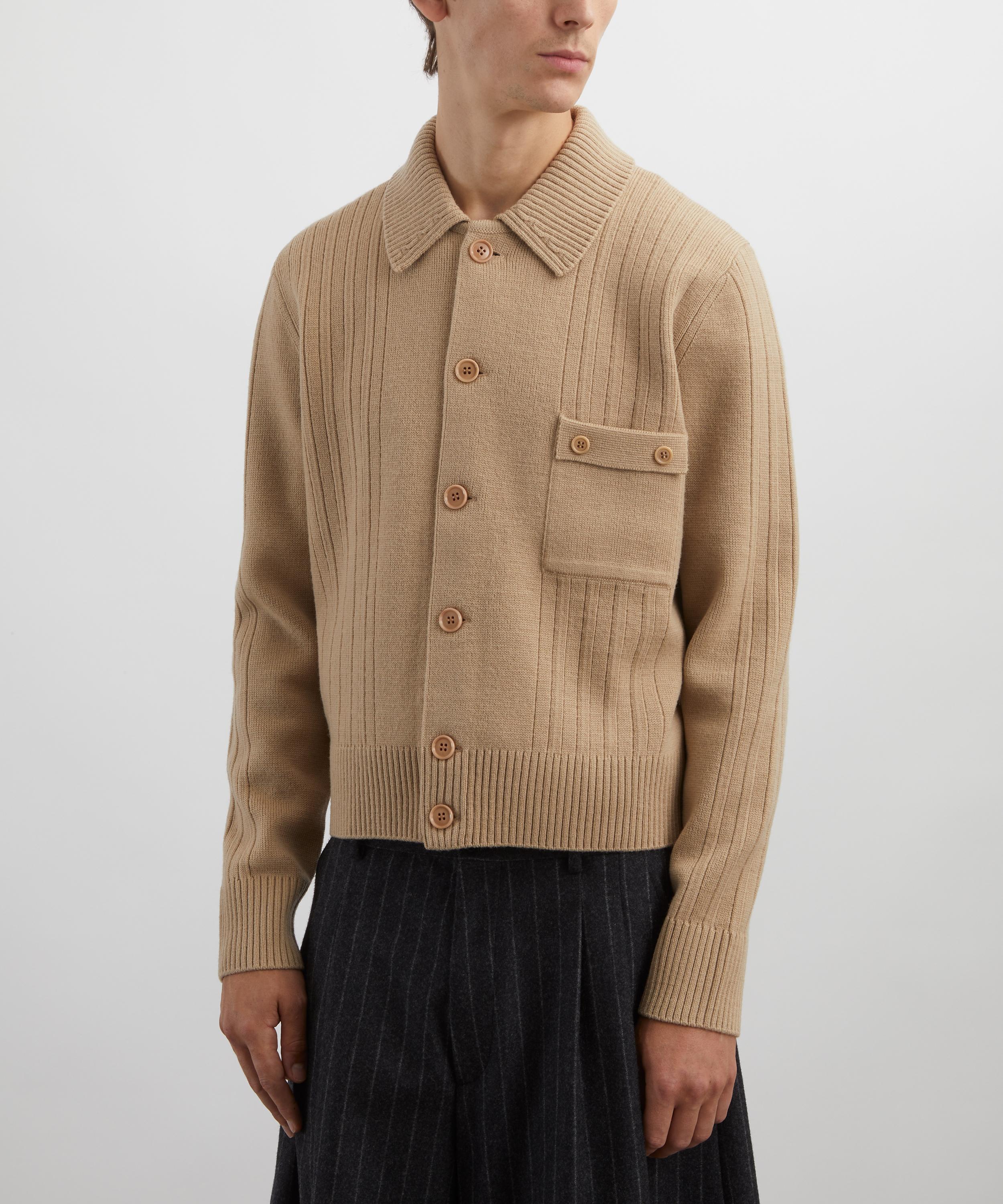 Knitted from wool with panels of wide ribbing, this relaxed button-up cardigan features a flat rib-knit collar, buttoned chest pocket, and a button fastening secured with corozo buttons - delivering understated elegance and everyday comfort.