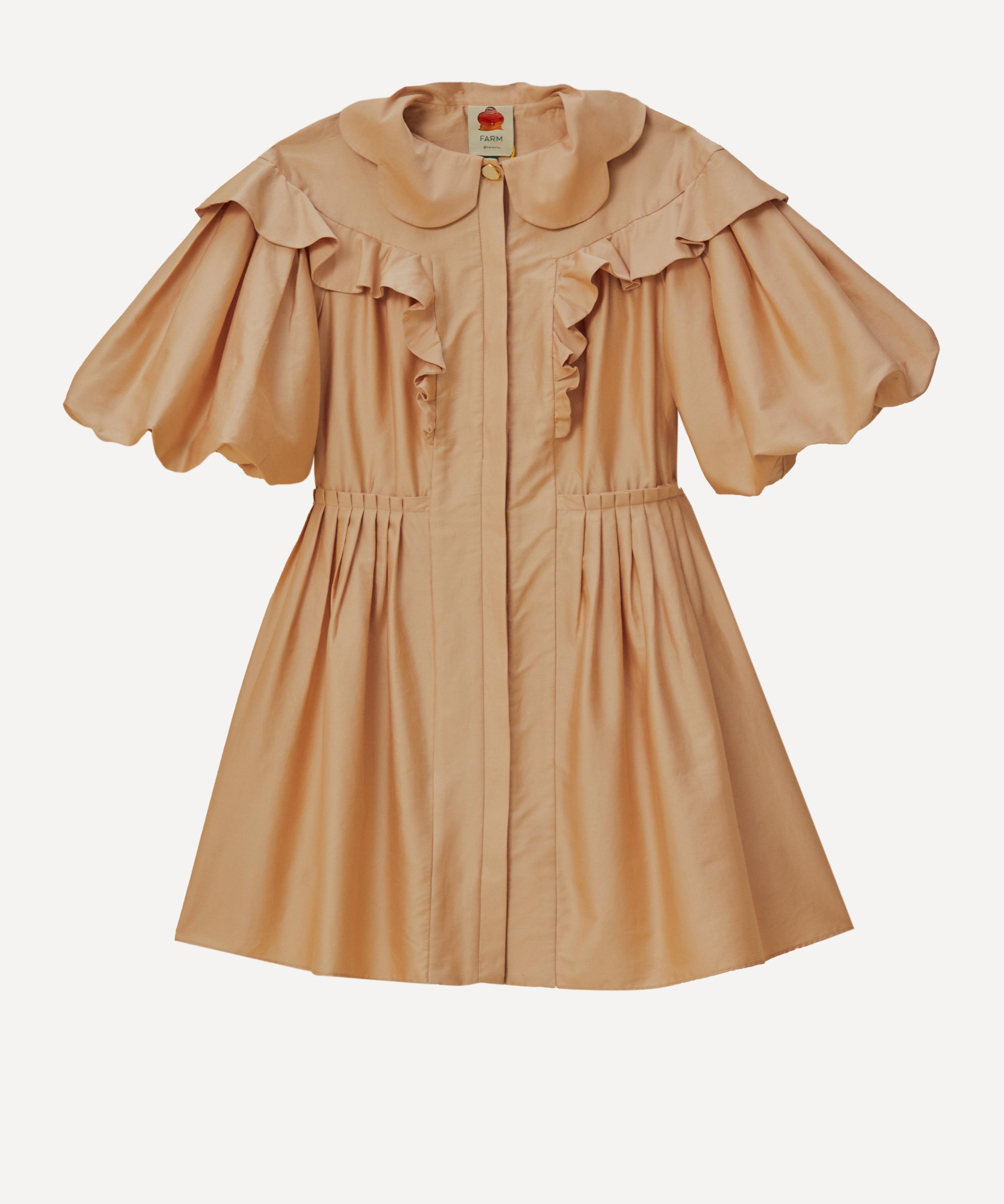 Effortlessly chic, this beige mini-dress brings a touch of whimsy to your everyday edit with its scalloped Peter Pan collar, and frilled yoke Complete with cropped puff-sleeves and a concealed button closure, it’s flattering A-line skirt is finished with intricate pleating.