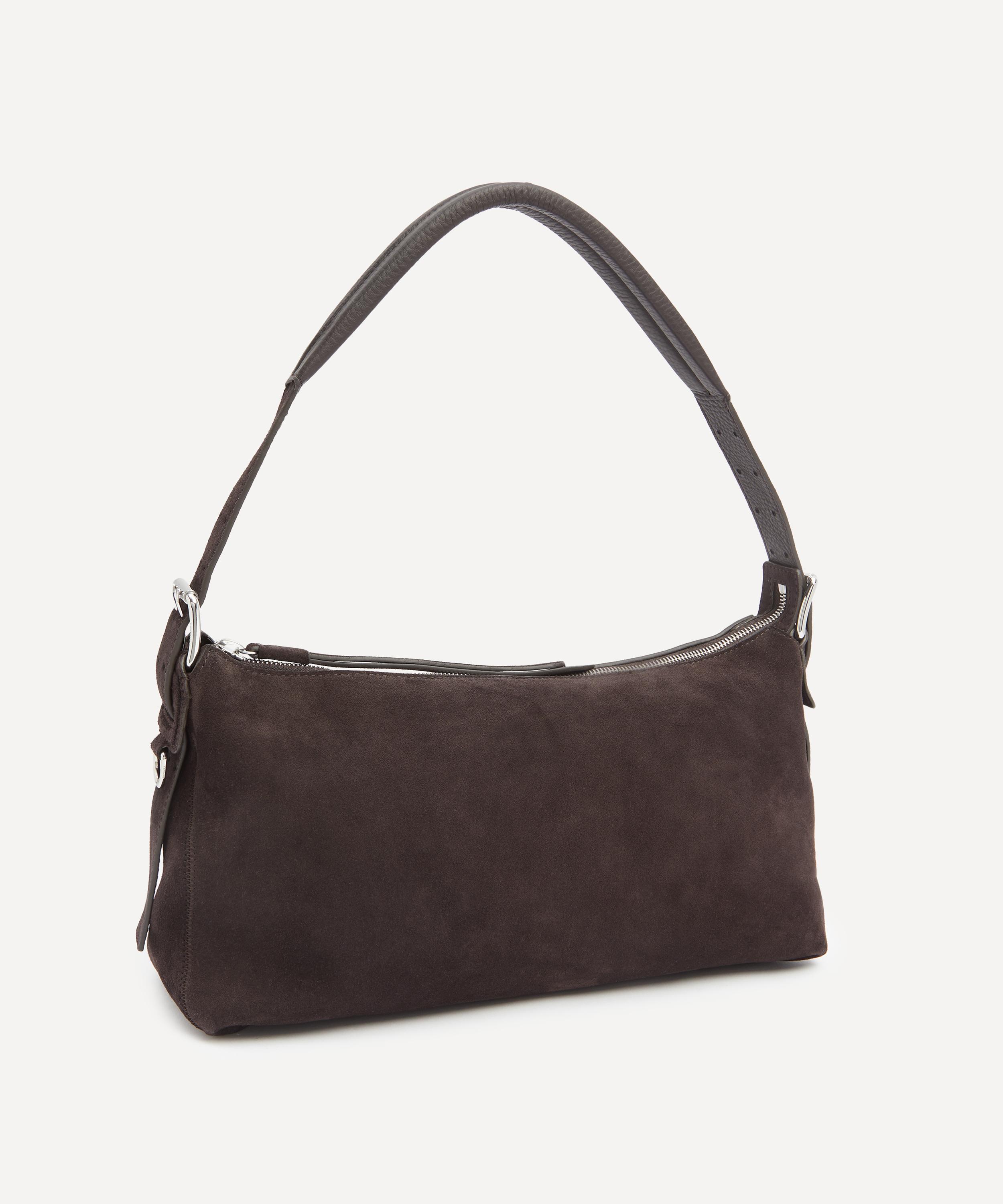 Cut from supple suede leather, this compact bag features a soft elongated, baguette silhouette, an adjustable and removeable leather strap, and a silver-toned finish for an authentic touch.