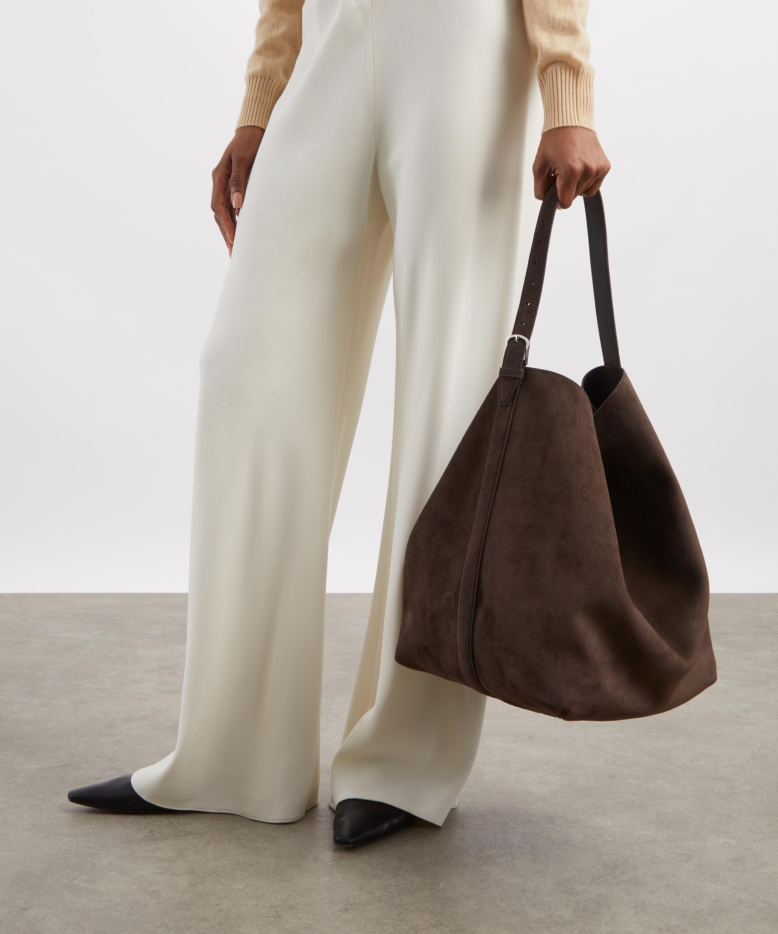 Crafted in Italy from soft, velvety suede in a warm brown hue, it features a chic, slouchy silhouette with excellent drape. Fitted with an adjustable strap and silver-tone buckle, it opens to reveal a roomy interior with slot pockets for valuables and small essentials. Style it over the shoulder or carry by hand to capture the brand's elegant, minimalist aesthetic.