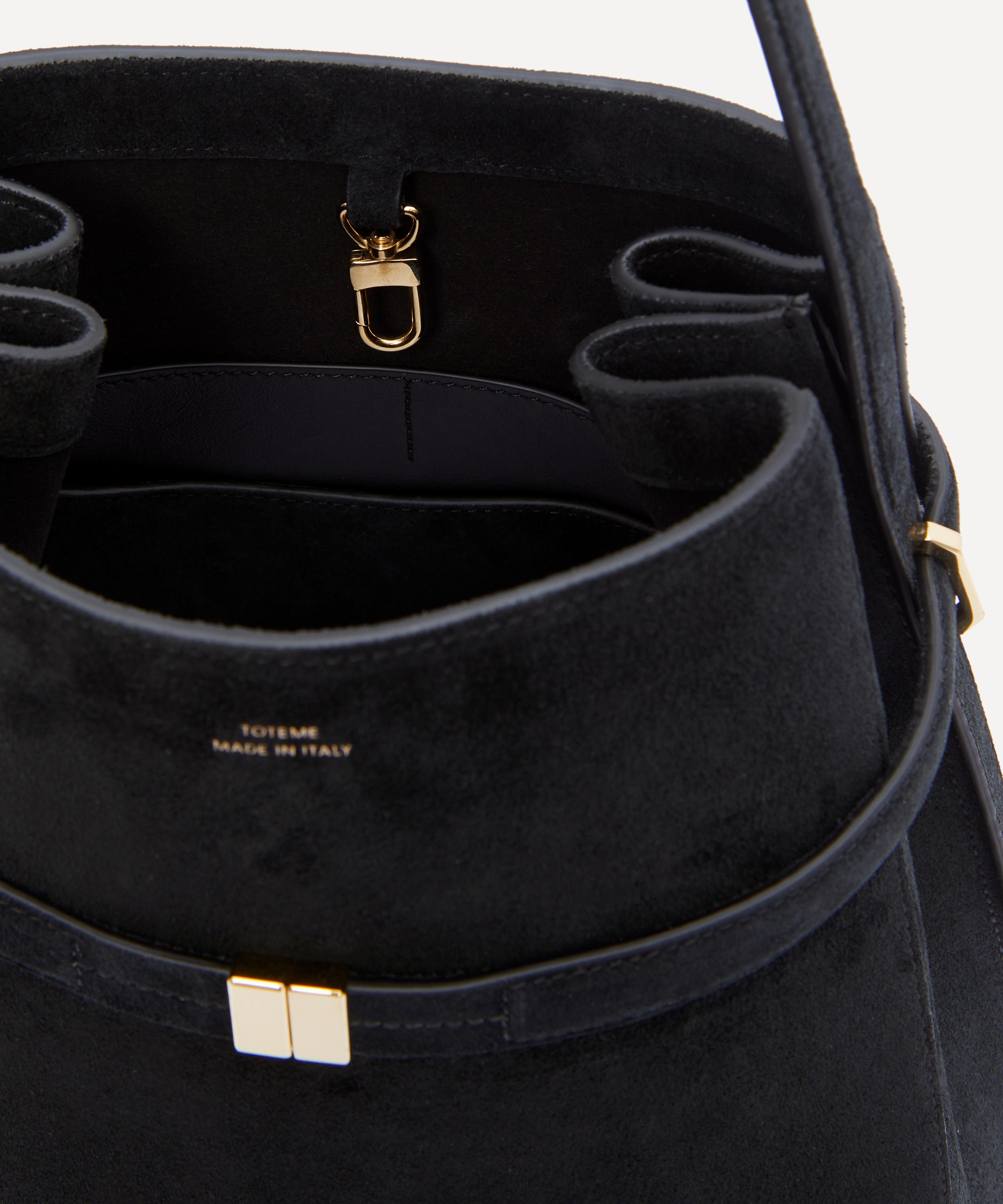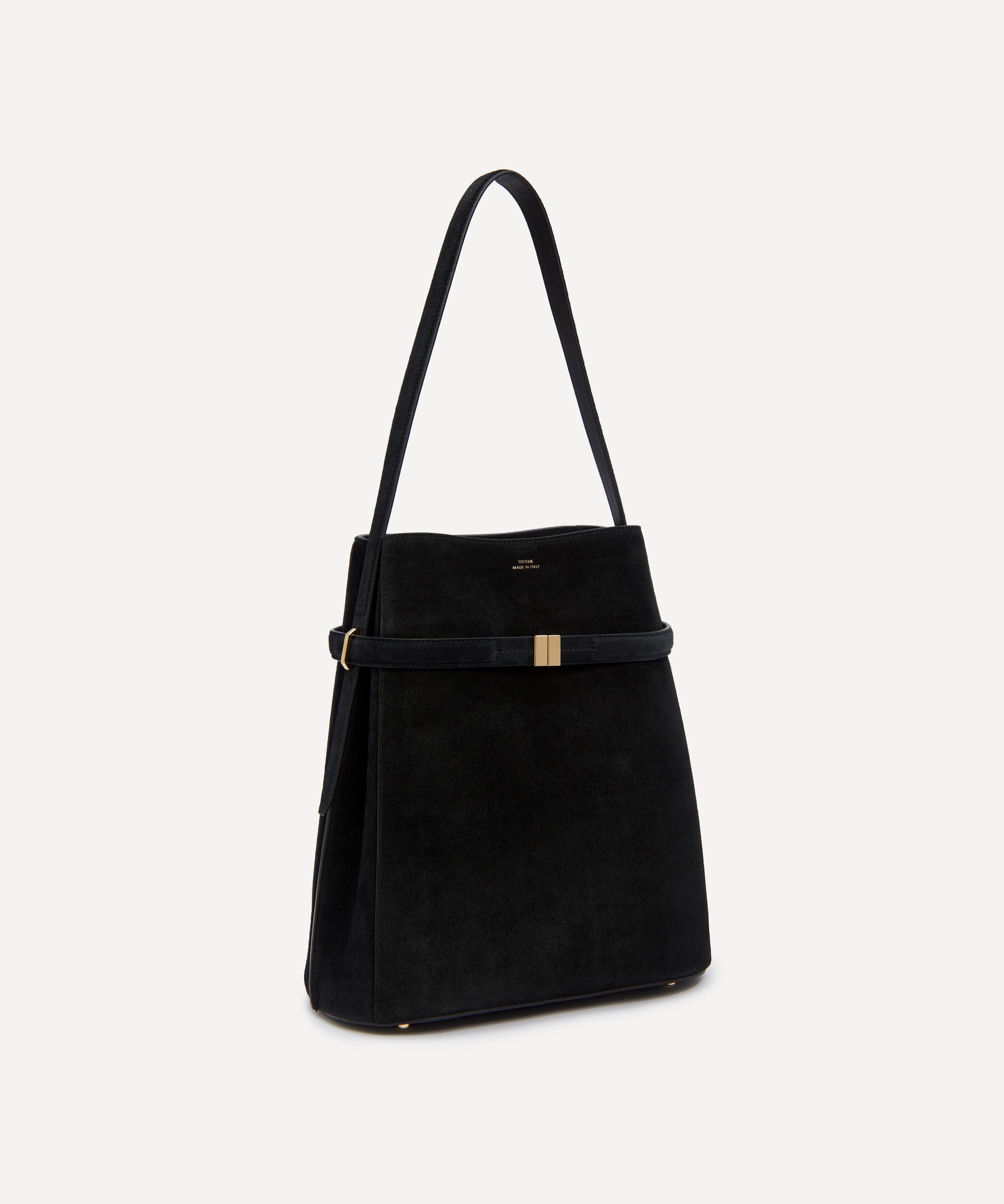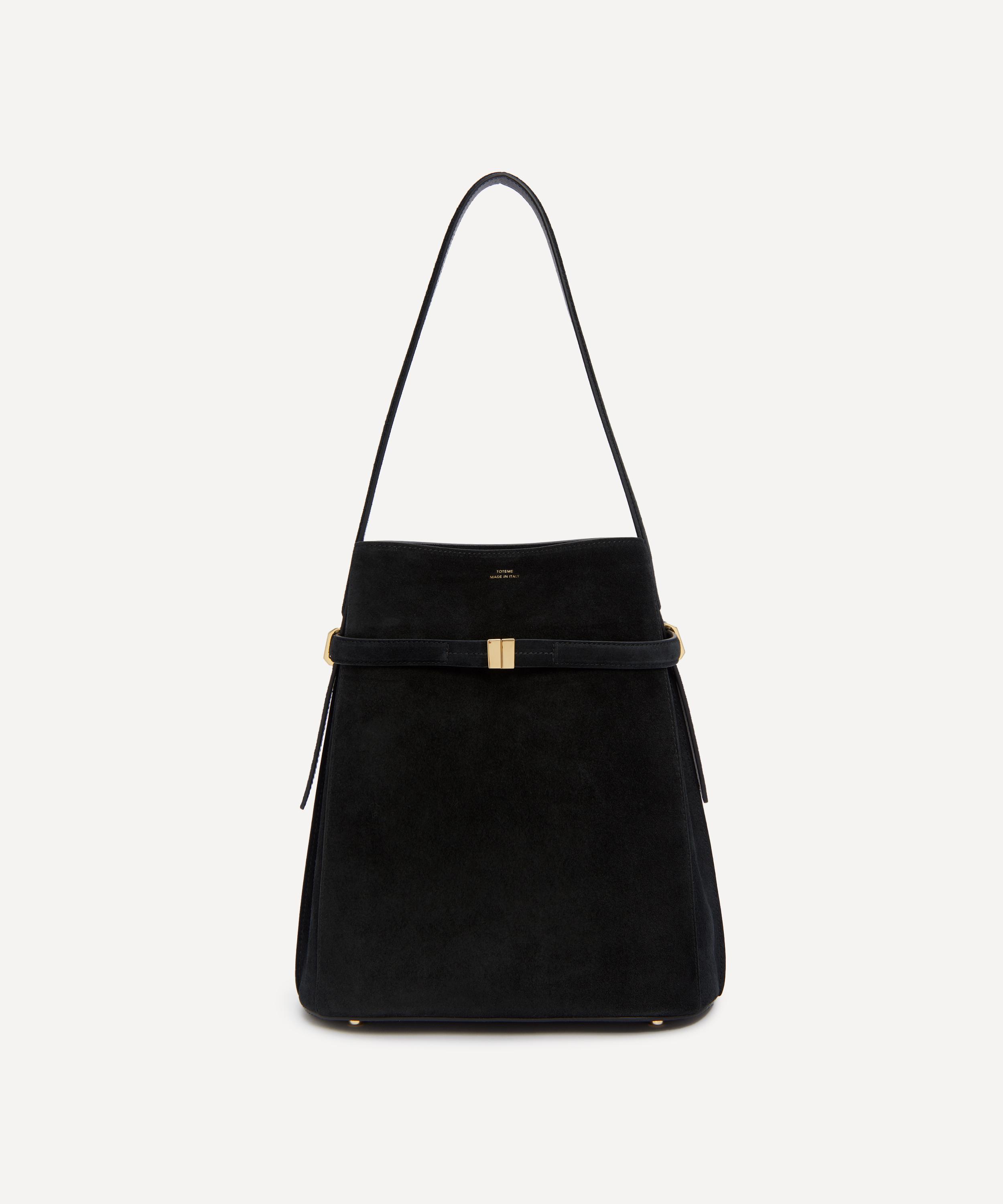 Crafted in Italy from supple suede with gold-tone metal accents, this sleek bag features a belted front with an internal lobster clasp, opening to reveal two internal pockets, a fixed shoulder strap, and stamped branding at the front for added polish. Boasting a signature style that effortlessly reflects the brand’s elegant, minimalist aesthetic – style it across the body, over the shoulder or carry by hand.