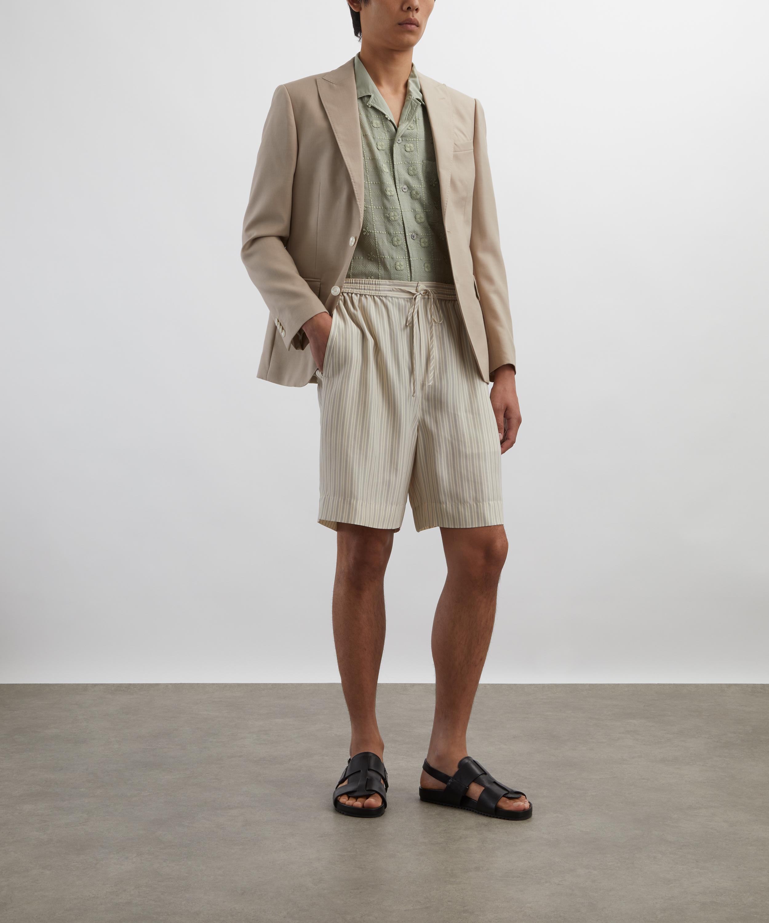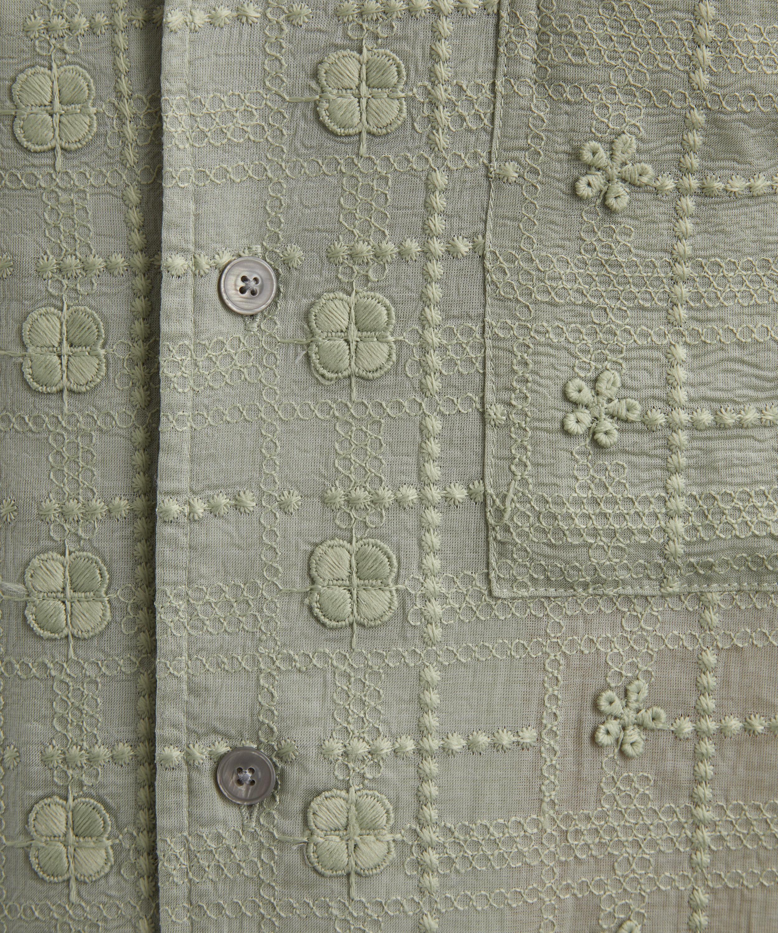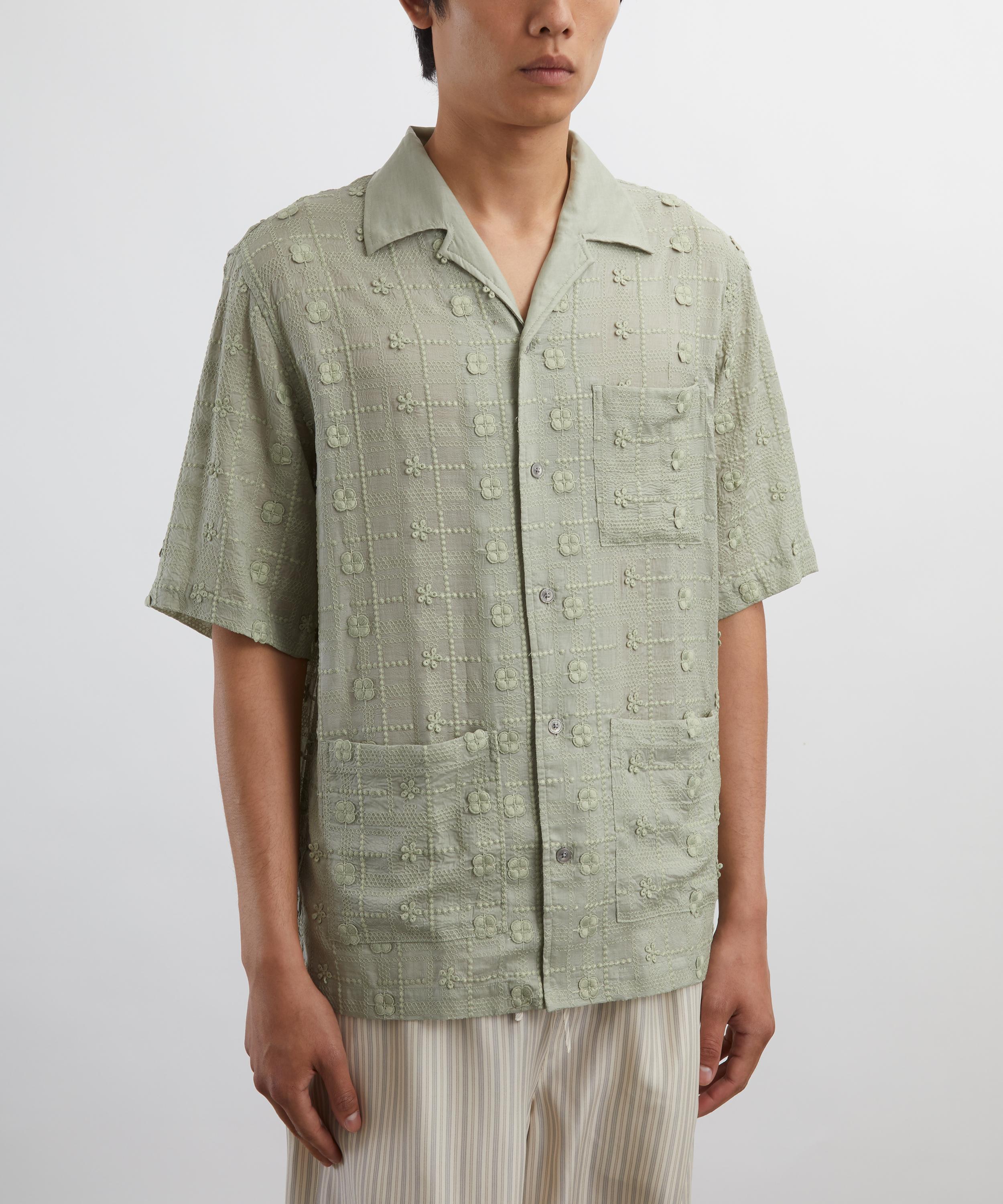 Crafted from a crisp TENCEL™ Lyocell fabric adorned with a tactile fil-coupé pattern, this sage-green shirt blends tailored structure with casual ease. Designed with an open collar, short sleeves, and three patch pockets, it’s a refined layering piece for effortless everyday style.
