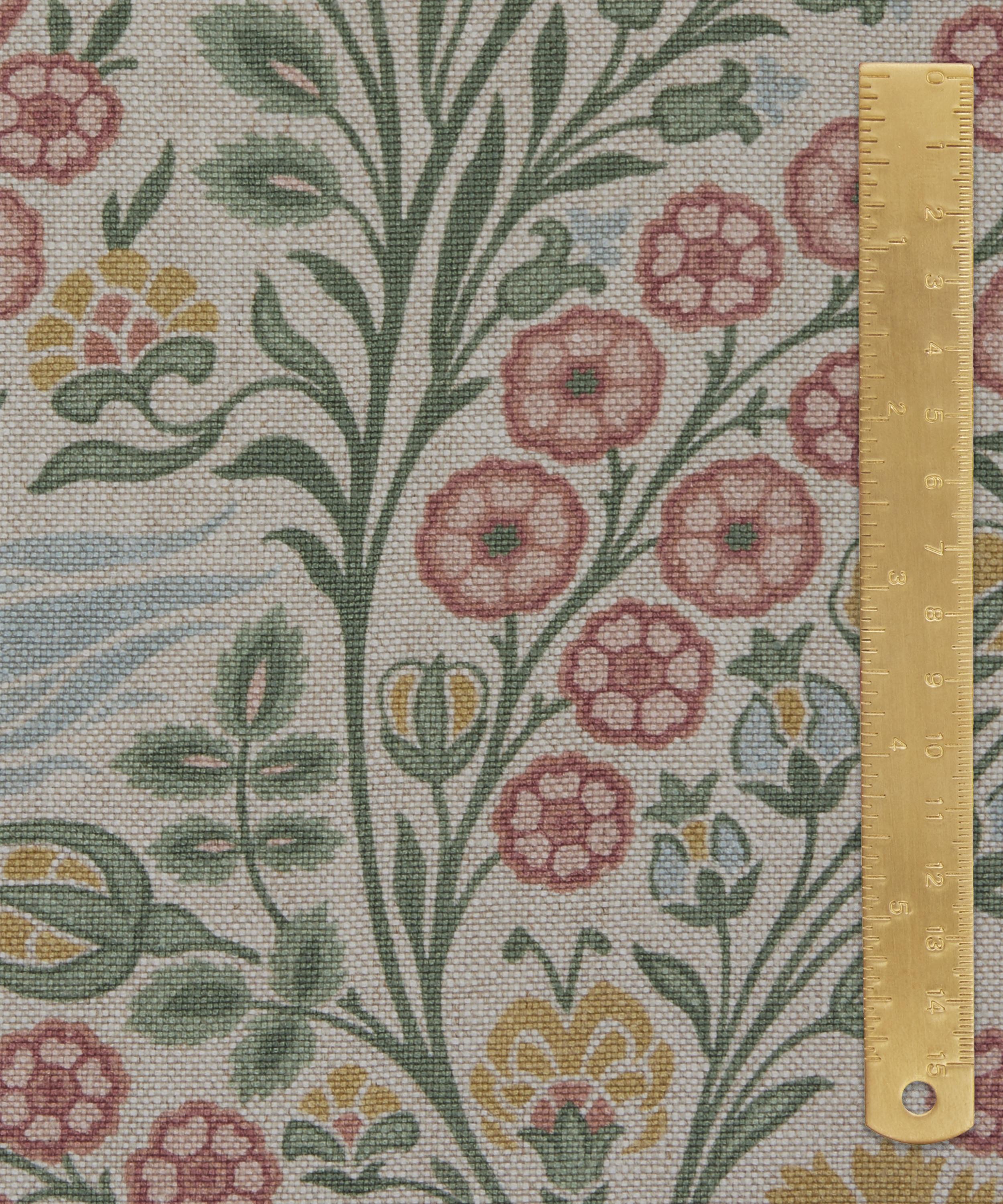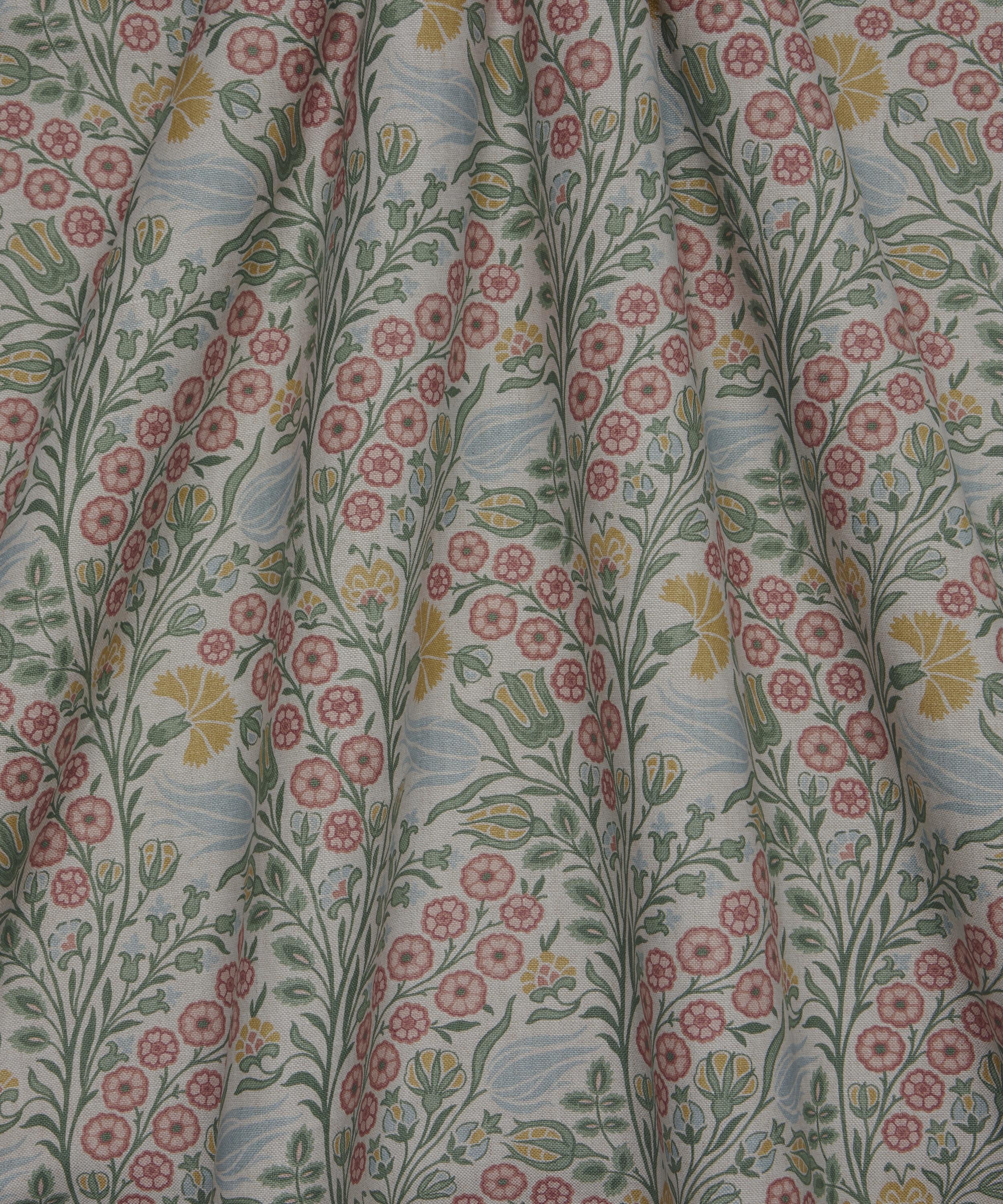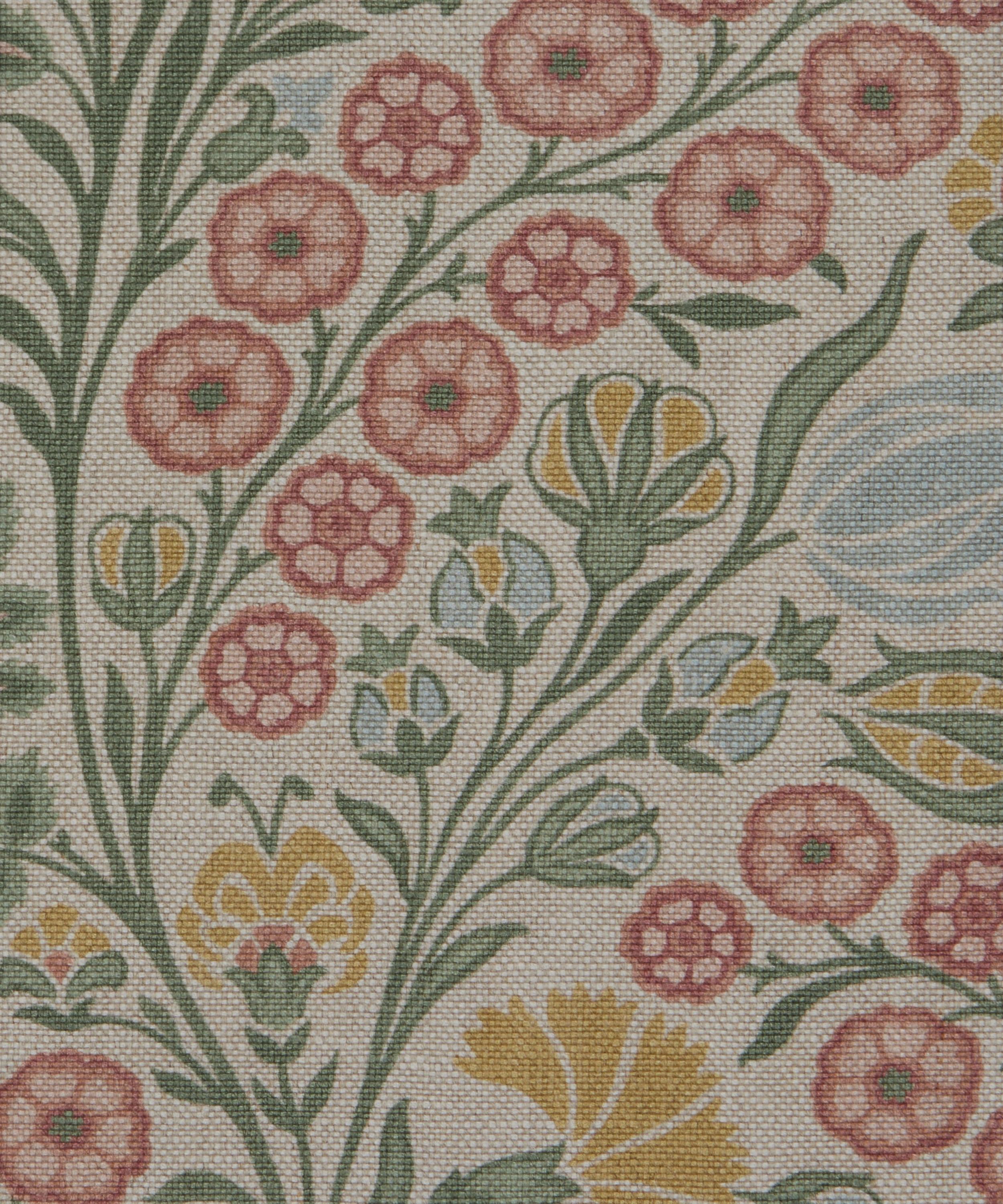 Referencing traits of the Arts and Crafts movement, Berry Vine derives from a Liberty pattern book dating from c.1910. The slender, winding vines appear to stretch upwards creating a sense of delicate movement. Organic motifs and intricate shapes intertwine harmoniously, embodying the period’s celebration of craftsmanship and the beauty of the natural world. Berry Vine is ideal for upholstery, drapery, cushions, and accessories. Printed on a luxurious soft-tumbled linen, this design is adorned with stylised lilies, bell flowers, and daisies and is perfect for upholstery, drapery, cushions, and accessories.