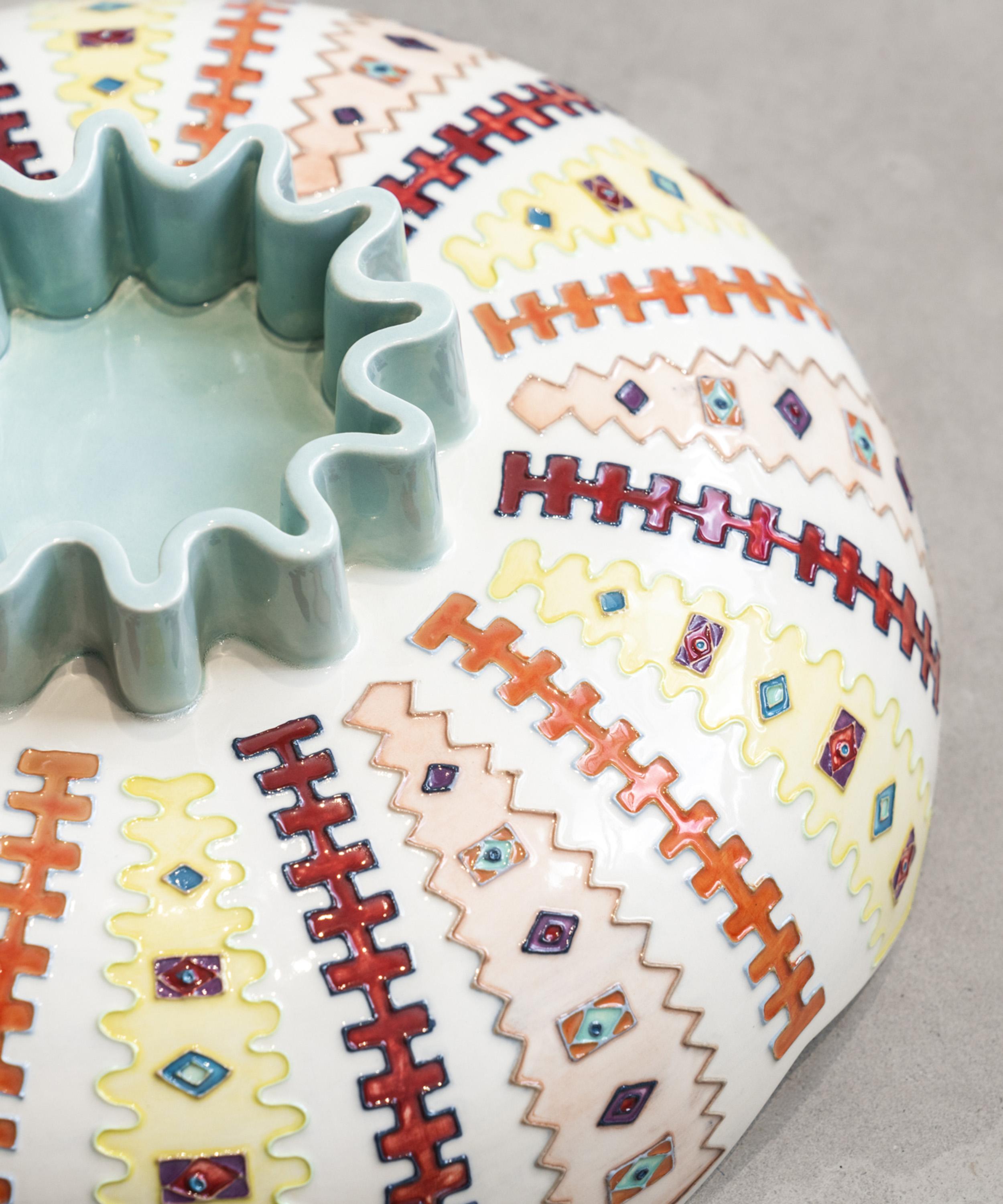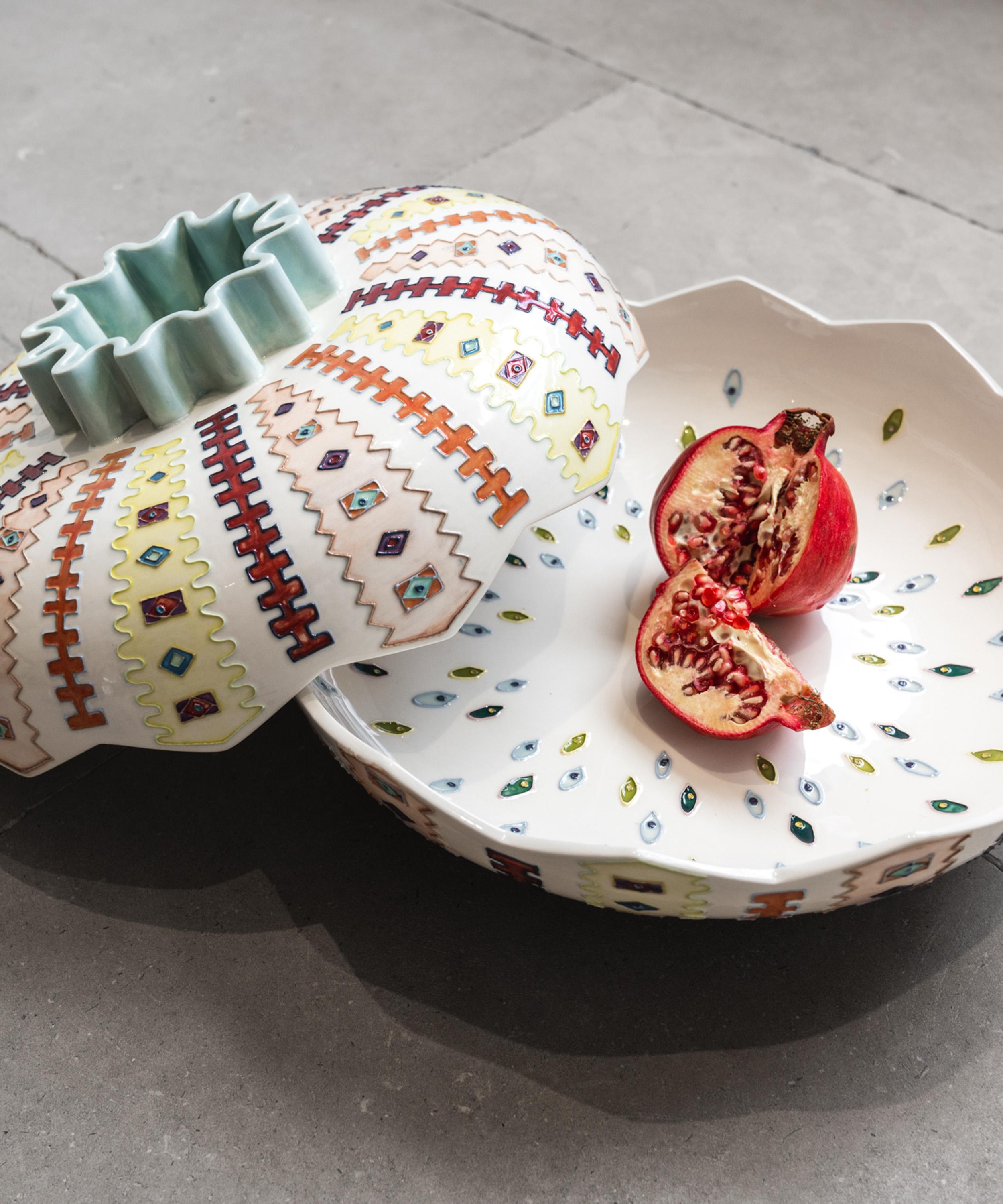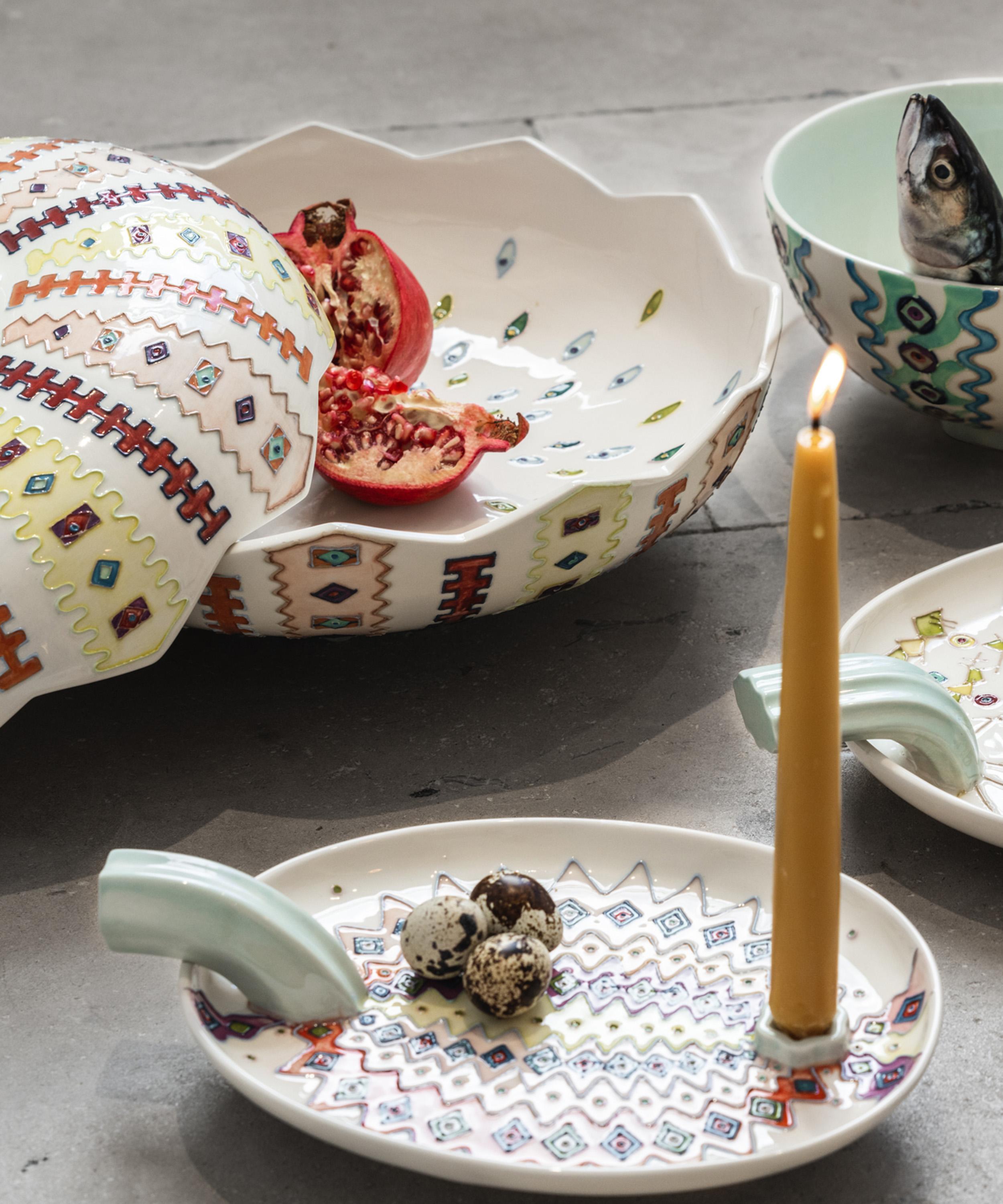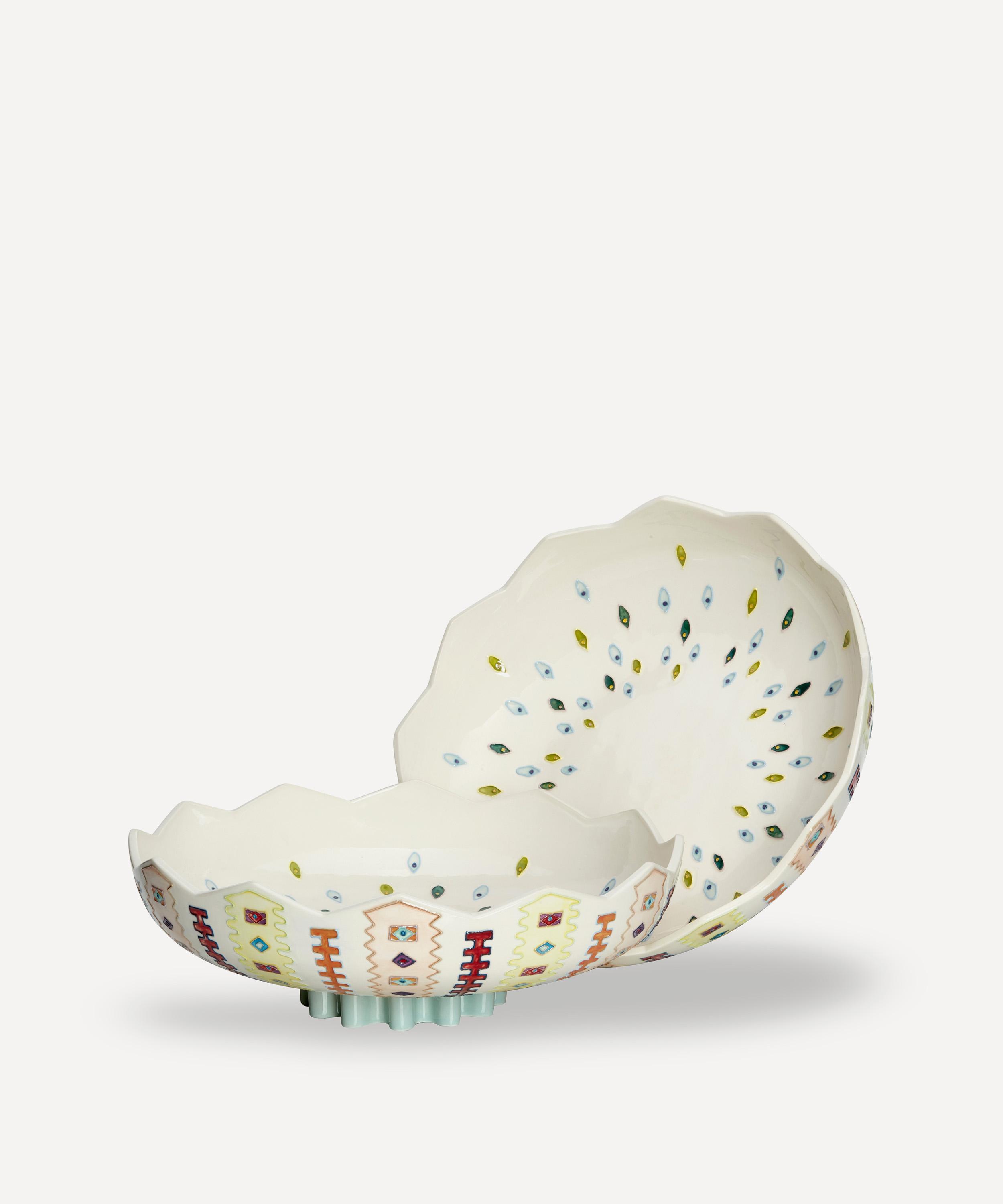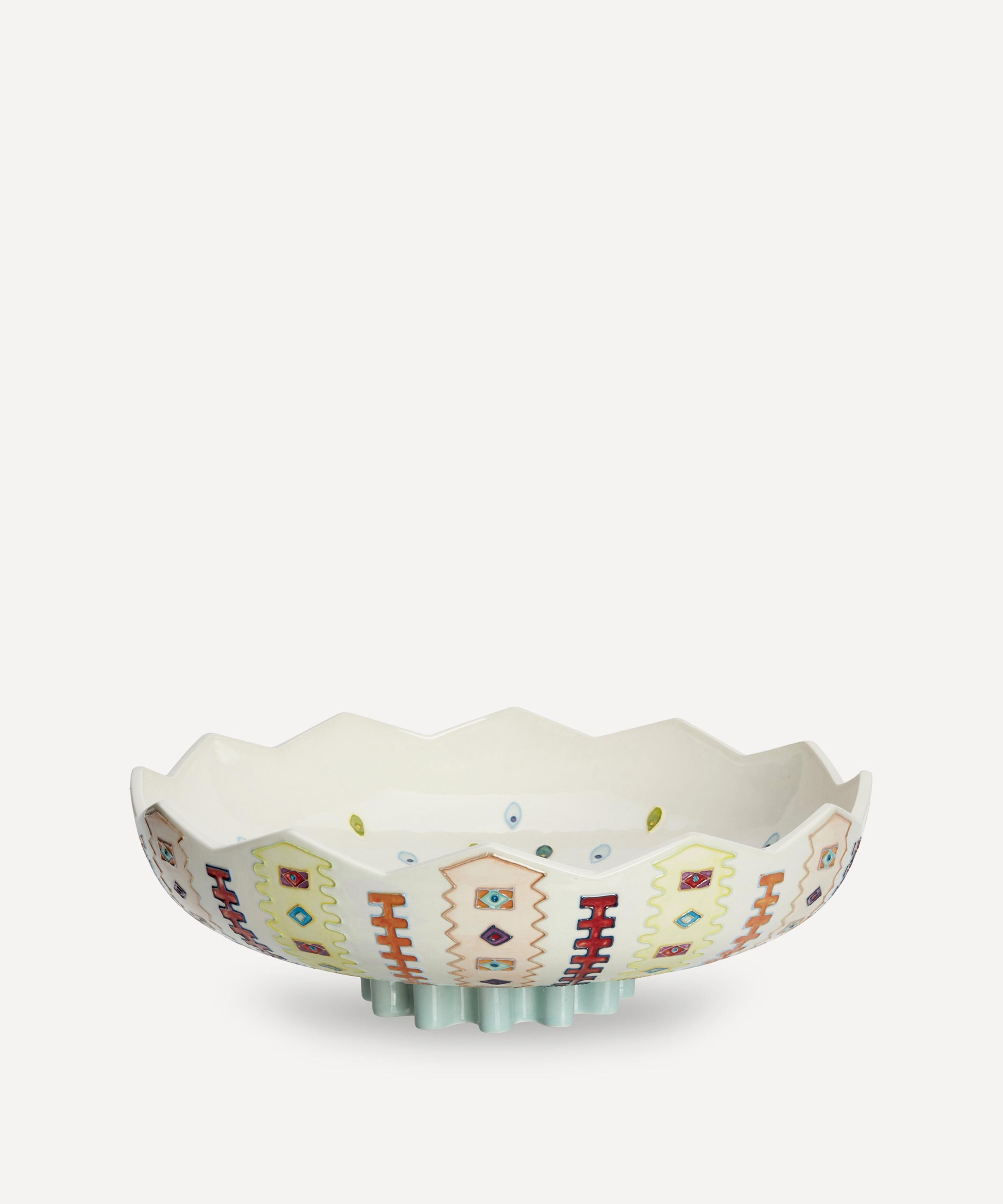 Drawing on the popularisation of theatrical dining that emerged in the 18th century, designer Bethan Laura Wood invites us into the world of hyper realistic ceramic replicas with this large bowl from 1882 Ltd. Fusing this trend with the eponymous party foods of the 1960’s, this stylised bowl features a decorative figure that has been crafted using a slip lining technique – where each pattern’s raised lines are outlined and colour filled, offering a stained-glass effect. Bringing colour to your tablescape, pair with other pieces from the collection and use for everyday meals or dinner parties.