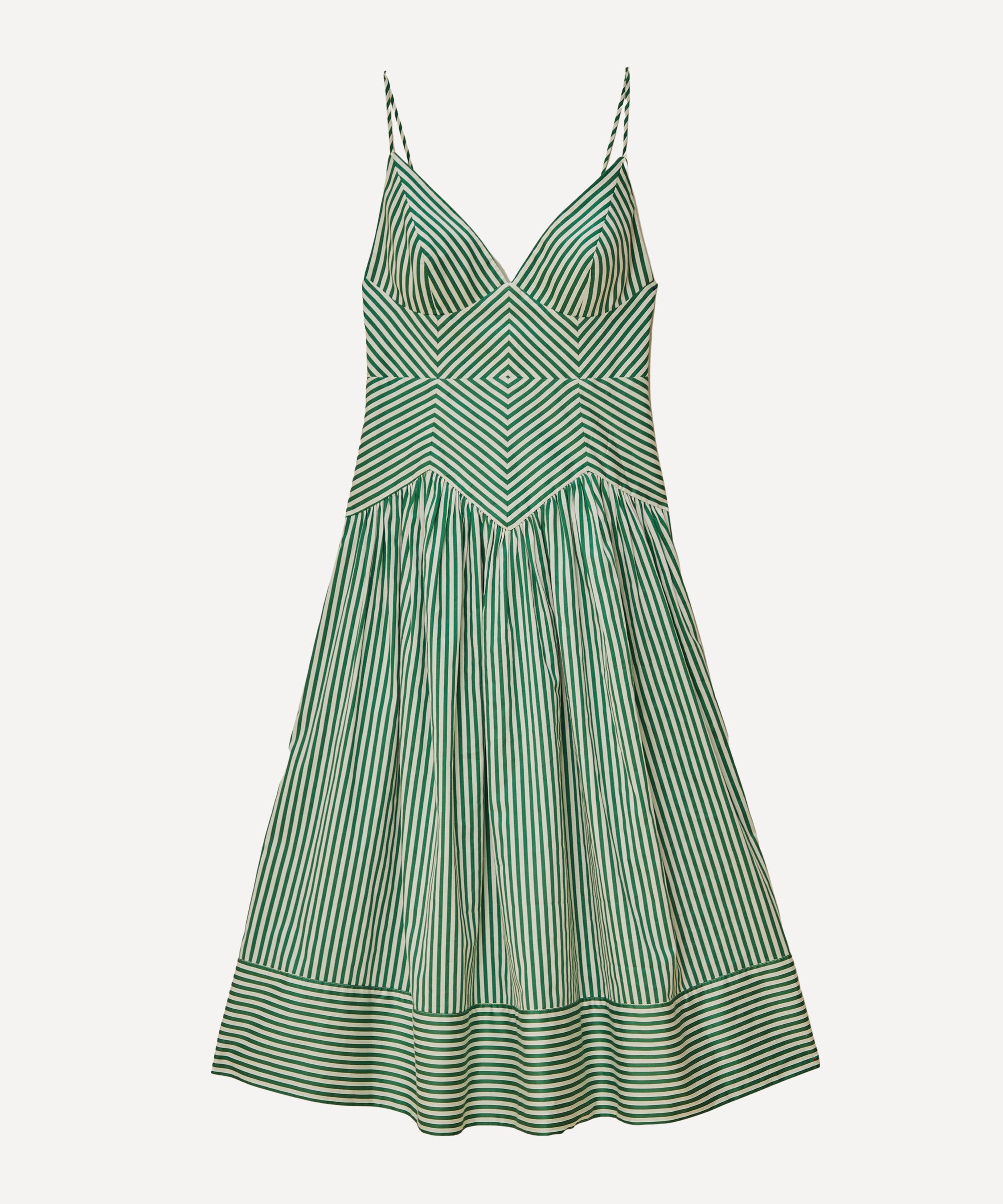 The Bicolor Stripes Midi Dress features a playful V-neckline, fitted bodice with geometric detail, and a voluminous skirt. Crafted from responsible materials, its green and white stripes create a bold, breezy look - perfect for vibrant, effortless style.