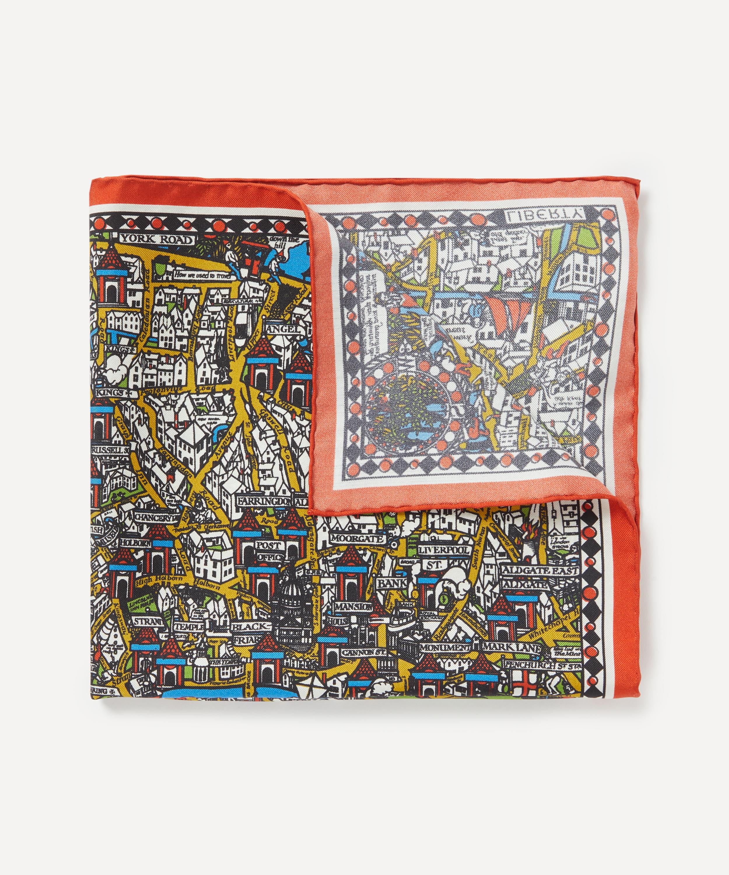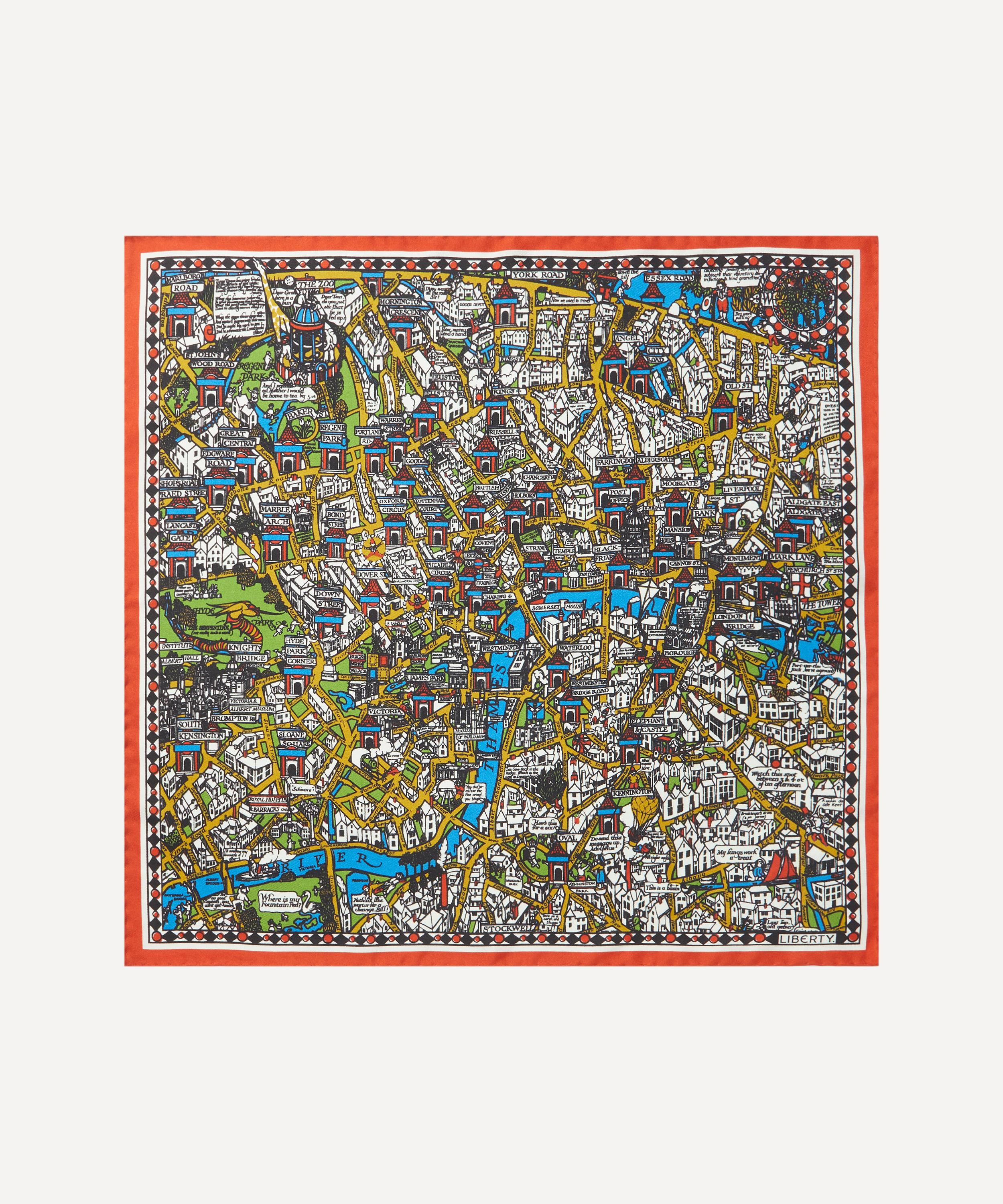 Liberty’s pocket square is printed in a historic factory in Macclesfield, Cheshire – the ancestral home of British silk production, and the site of a collaboration with Liberty that has lasted for several decades. Crafted from pure silk twill with hand-rolled edges and a signature logo in one corner, it presents our Big Smoke print, designed in celebration of His Majesty King Charles III coronation. The design celebrates graphic artist MacDonald Gill’s charming and witty, cartographic guide to London landmarks, originally published in 1914. Style it in the pocket of a favourite blazer or jacket to add a pop of print to ensembles from formalwear to your work edit.