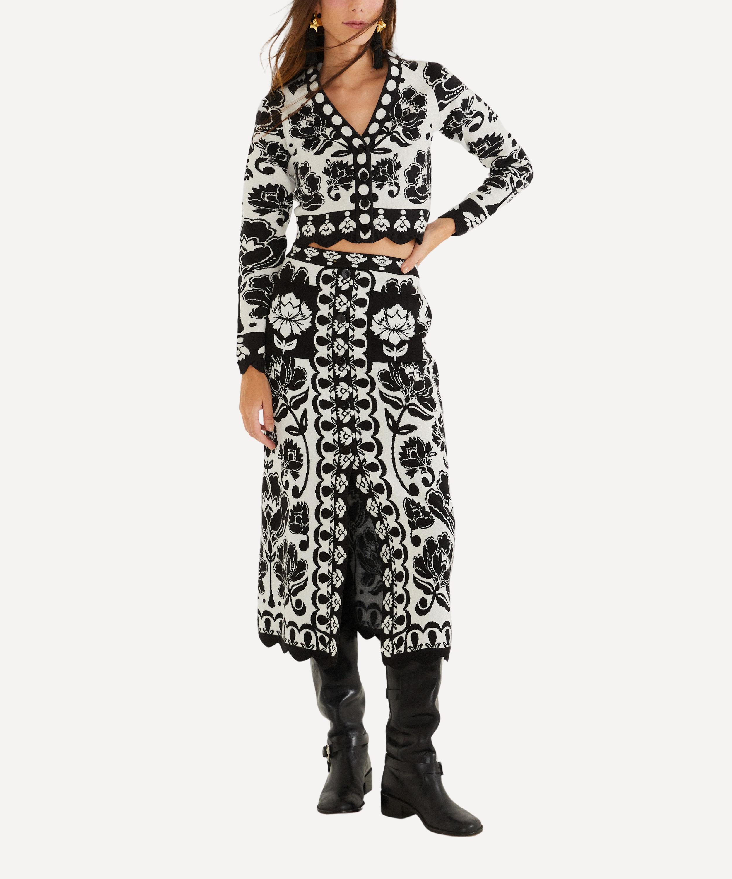 The Black and White Floral Arabesque Midi Knit Top charms with a bold monochrome floral motif. Its slightly cropped silhouette, long sleeves, button placket, and scalloped hem create a cozy, playful statement - making it the perfect seasonal layer.