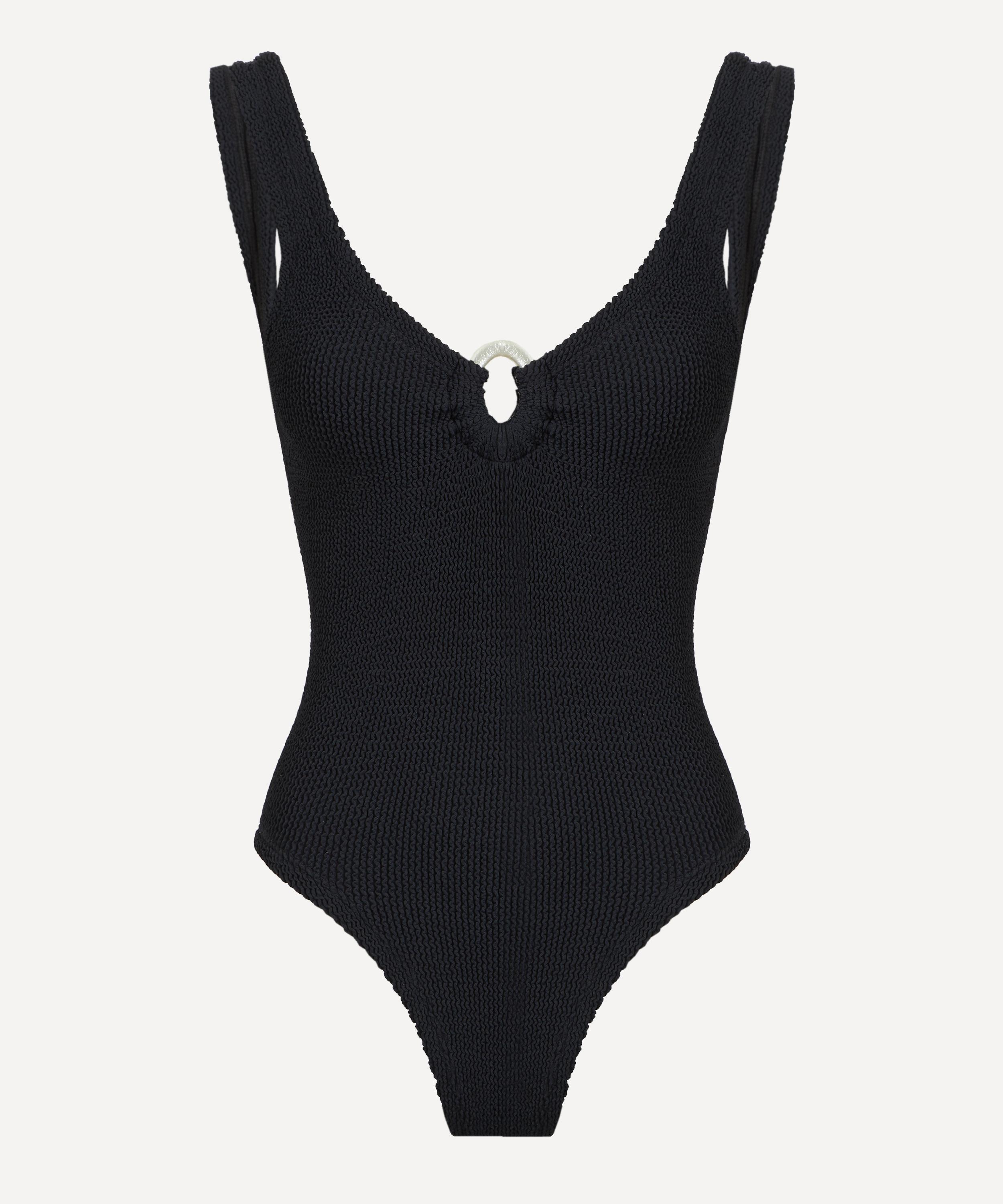Once a classic, always a classic: the Black Celine Swimsuit with Pearly Hoops from Hunza G remains an essential staple in swimwear.