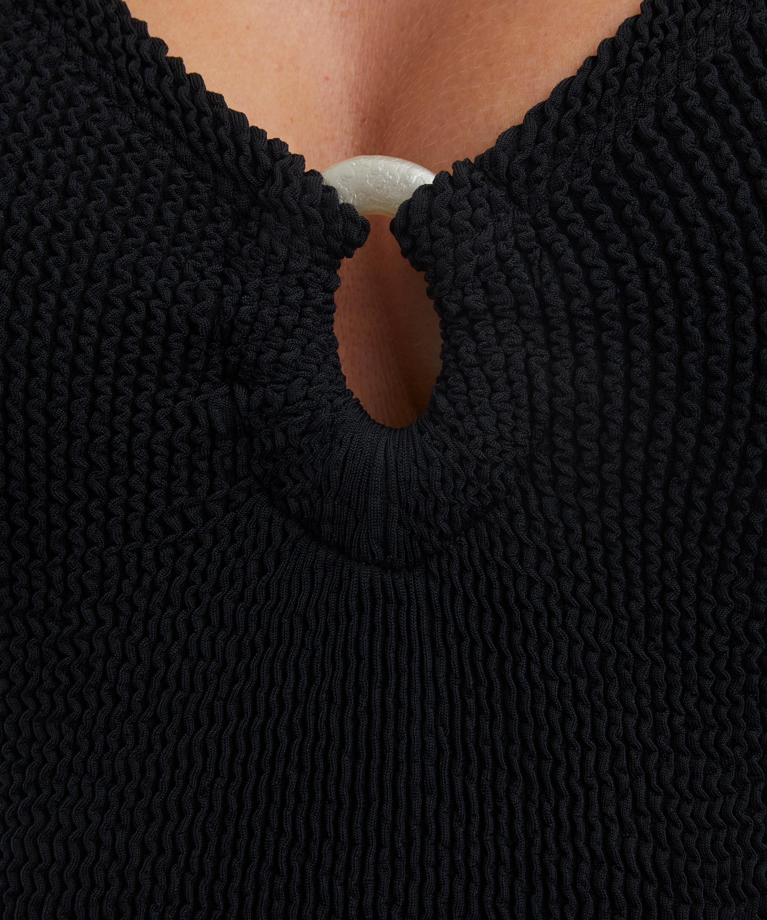 Crafted from the label’s signature crinkle material for a comfortable, flattering fit every time, this modern swimsuit exudes timeless appeal with its deep V-neckline, and an exclusive pearly hoop fixture.