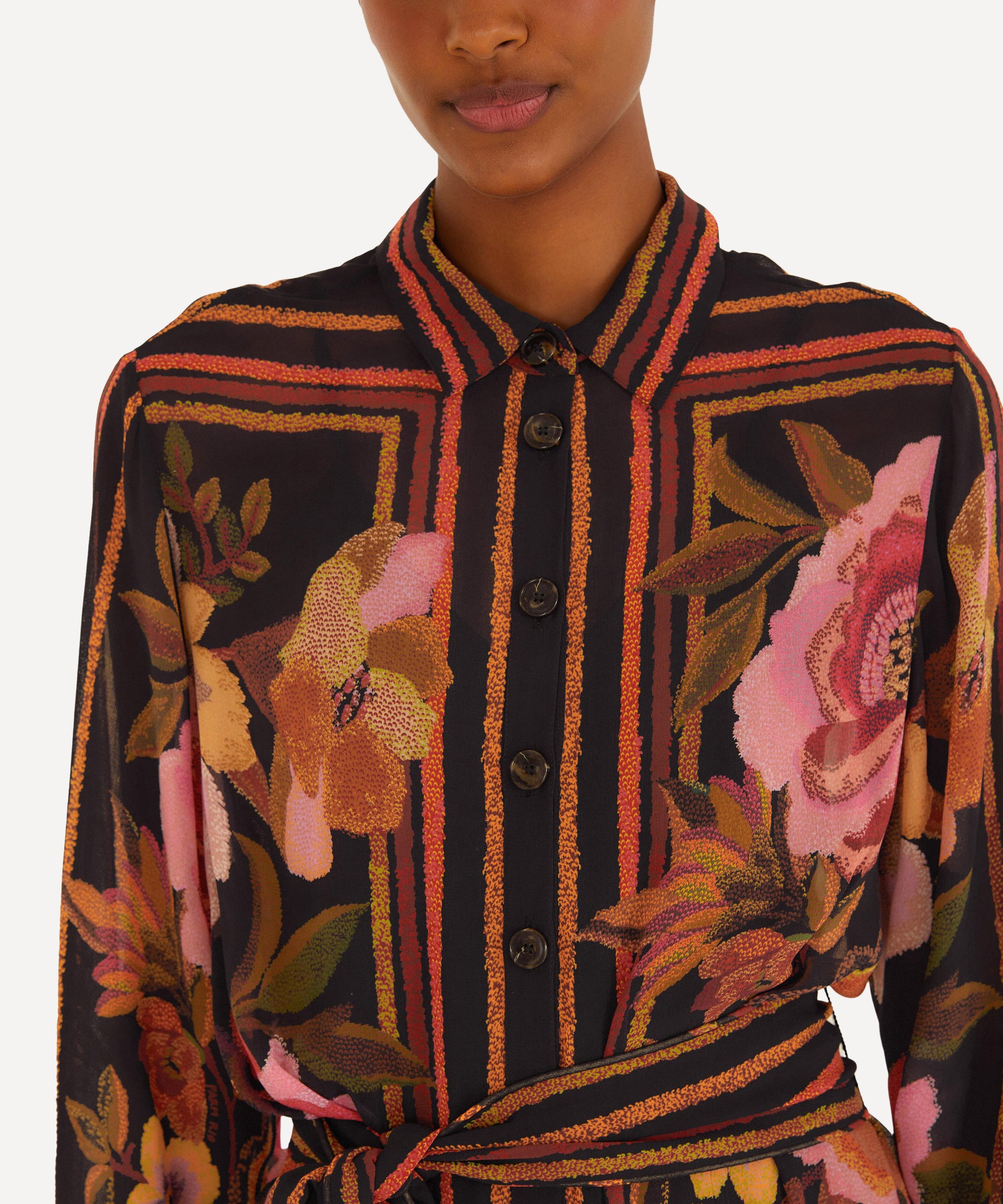 Effortlessly charming, this black mini dress features vibrant chenille flowers and a soft, flowing fabric. A belted waist flatters the silhouette, ruffled hem adds a playful touch, and long sleeves with a classic collar offer day-to-night sophistication.
