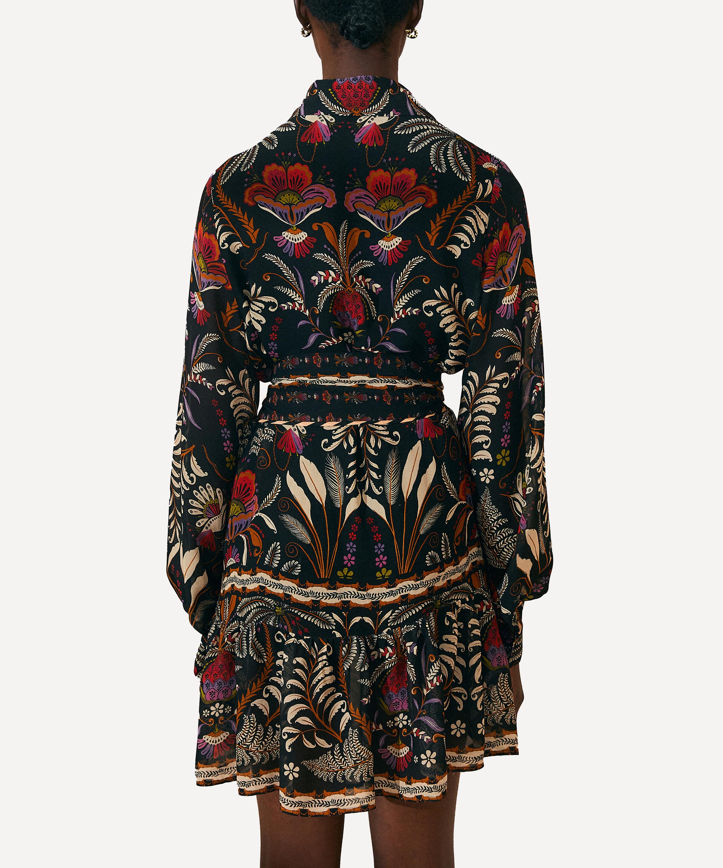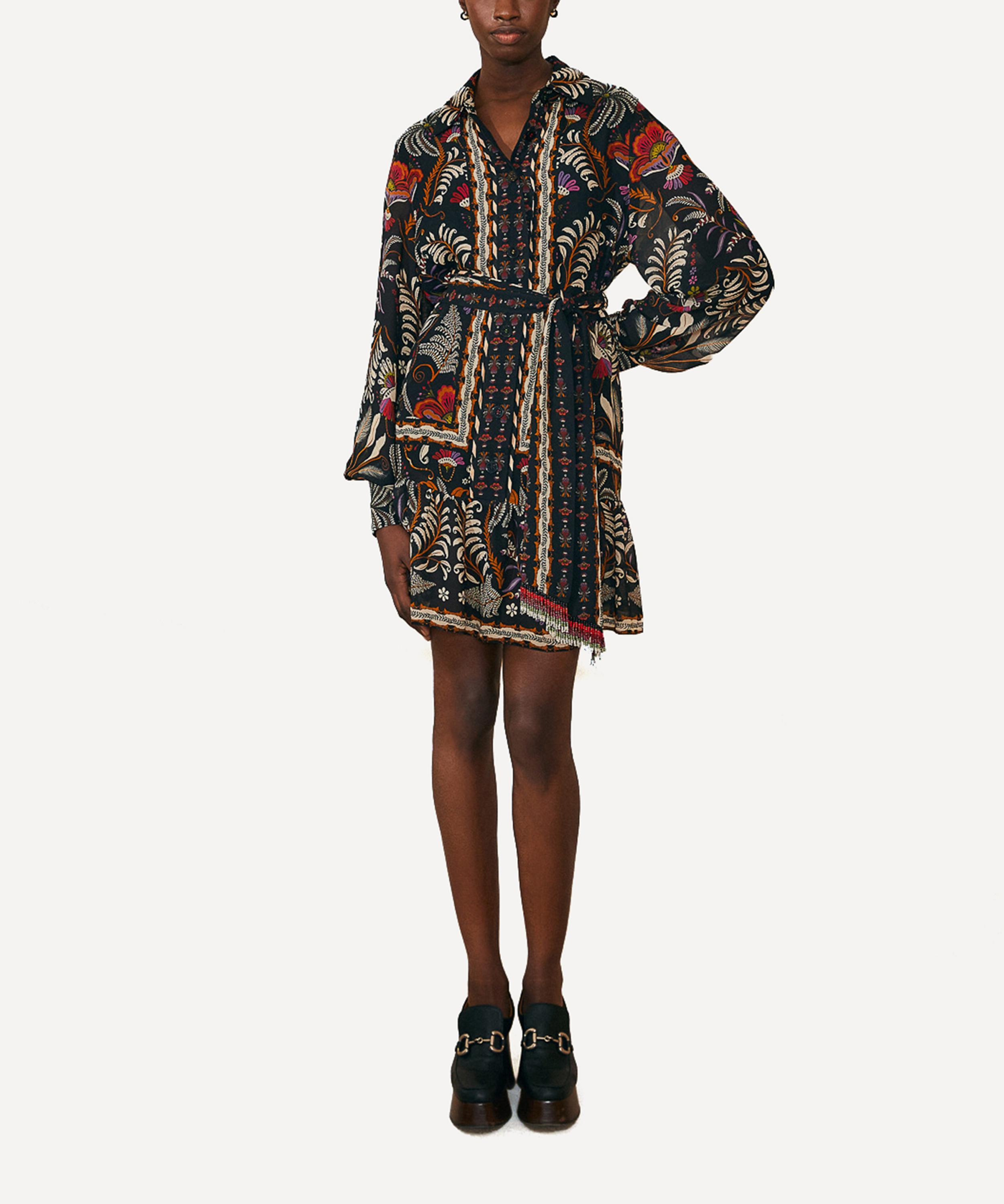 Adorned all-over in the bold and blooming Black Classic Garden print, this elegant shirtdress has a collared neckline, long blouson sleeves and a centre-front button closure. An easy-fit with a tiered short-skirt, it’s cinched at the waist with a beaded waist belt.