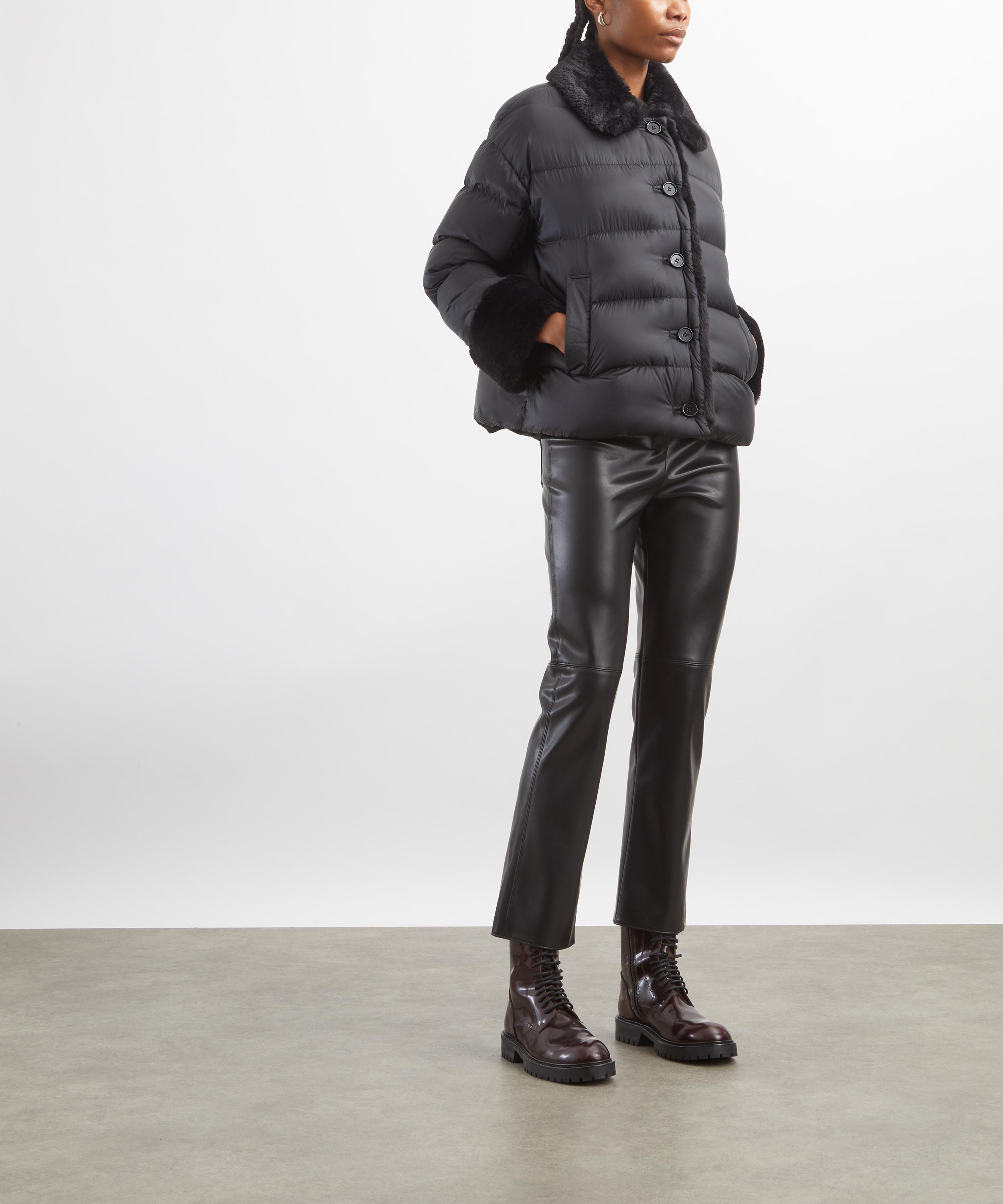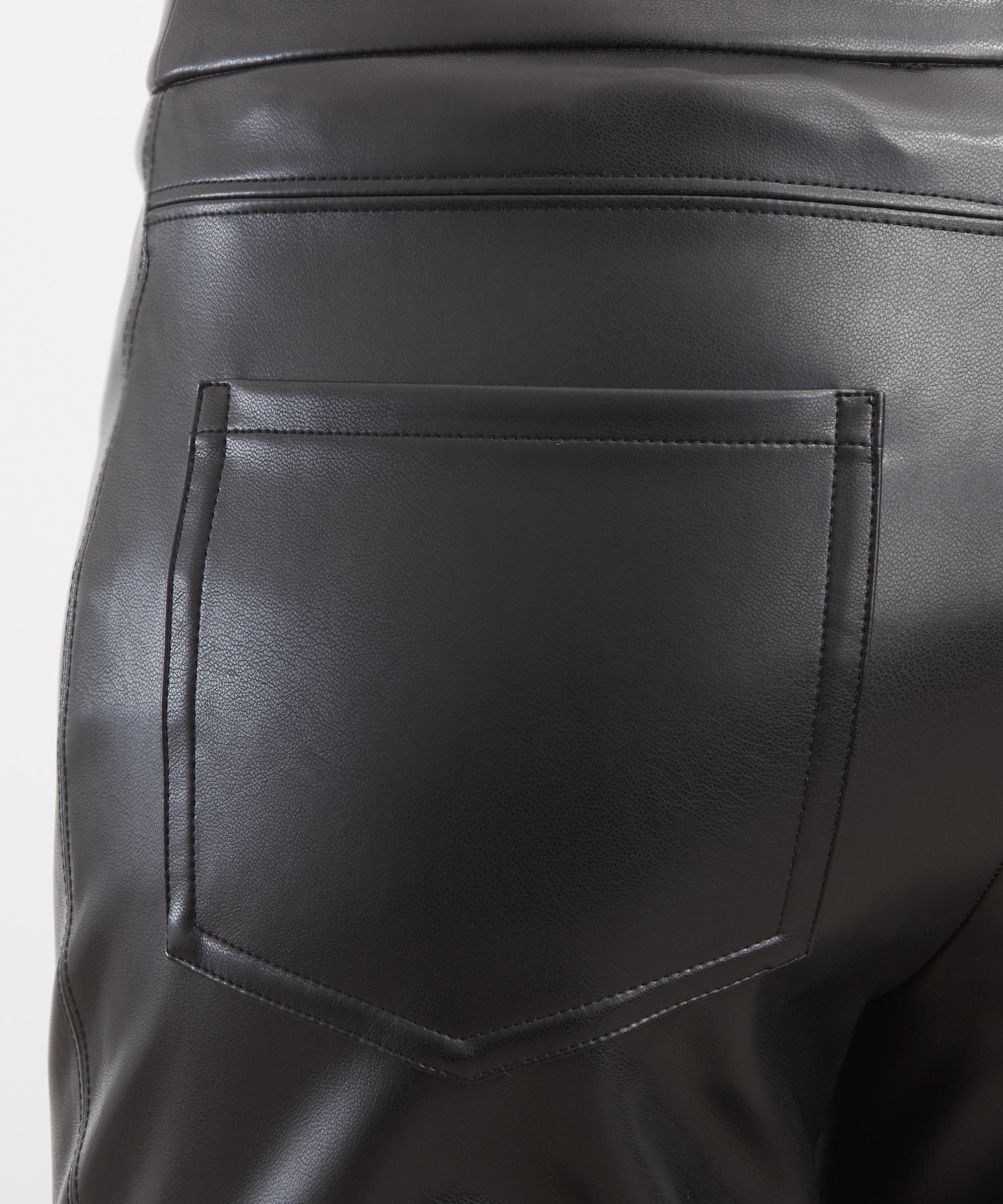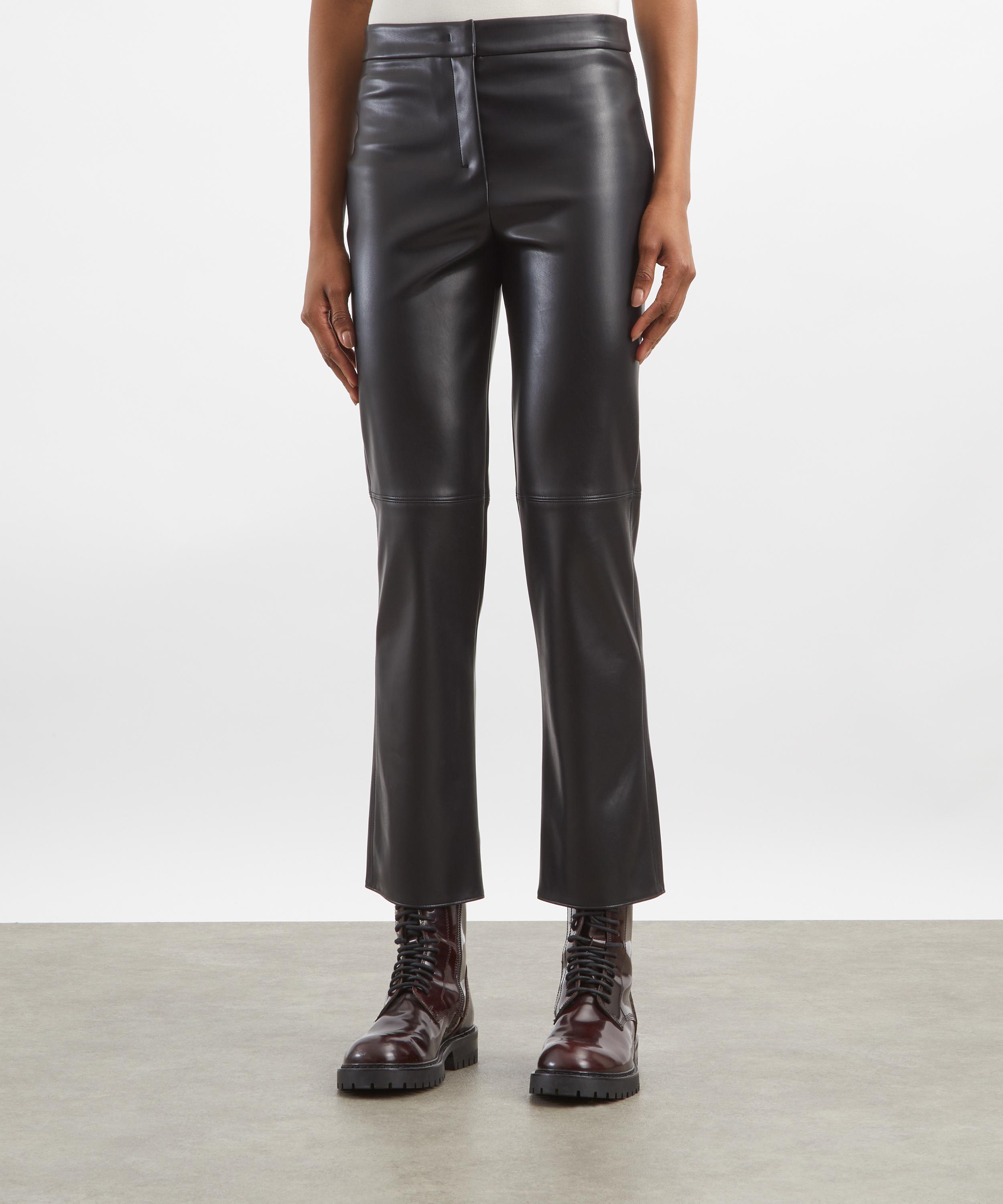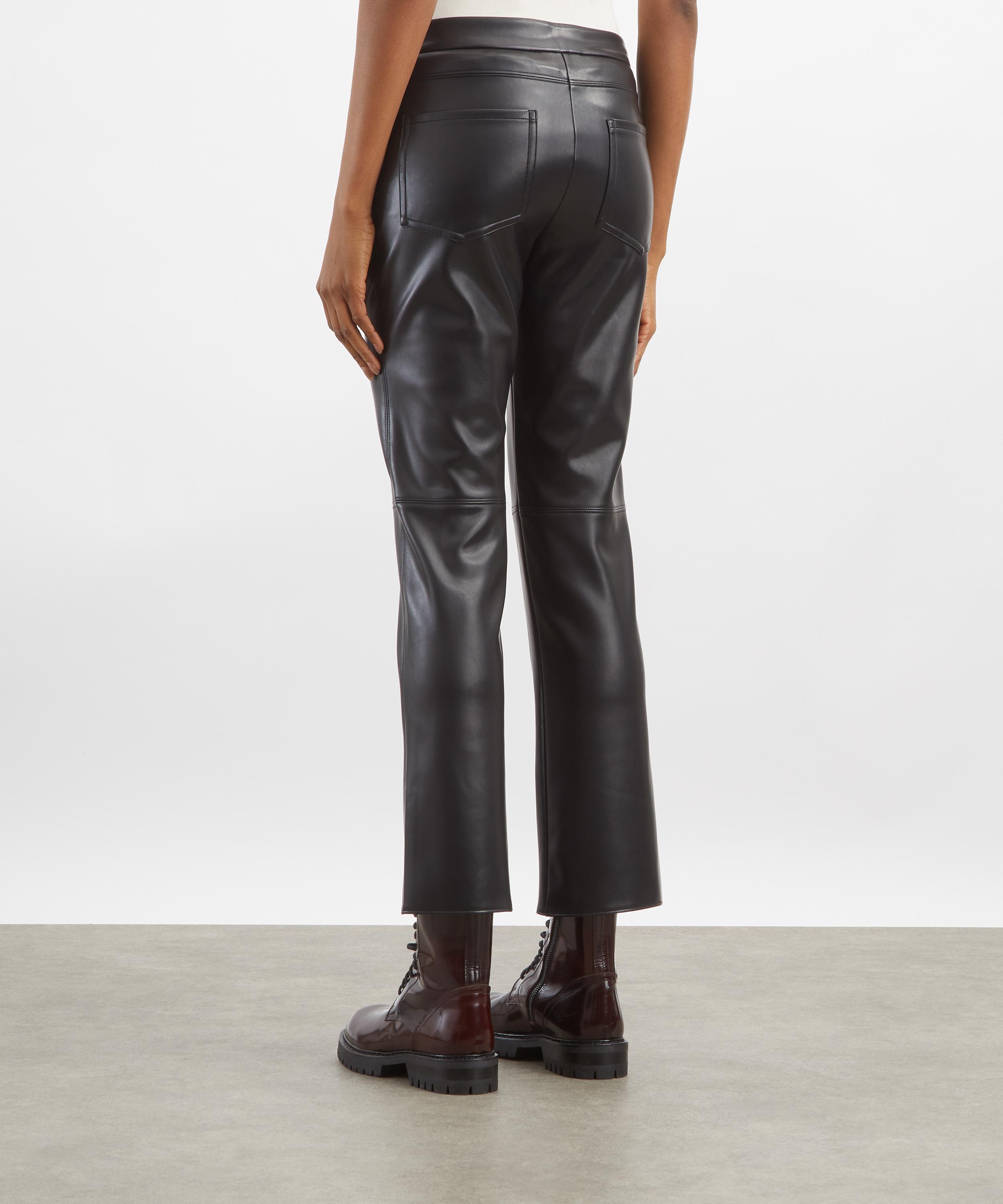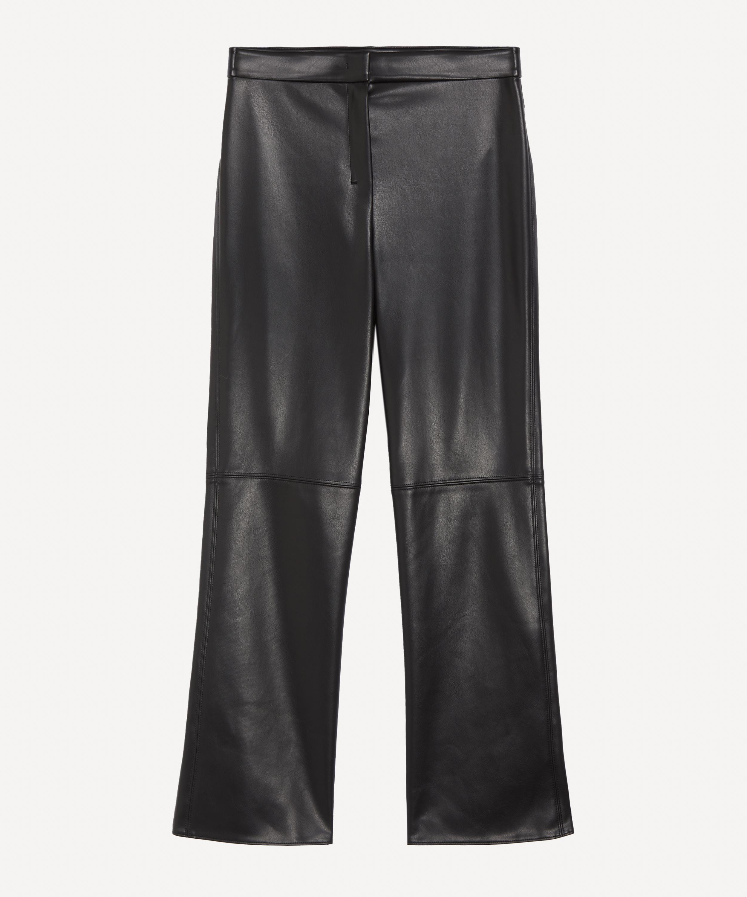 Crafted from a soft, coated fabric with a leather-like finish, these trousers feature a cropped, ankle-length silhouette, a high-cut waistband, rear patch pockets, and detailed topstitching for a structured look.